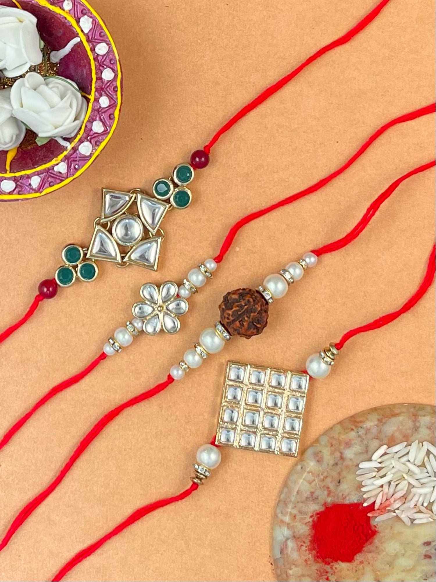 • Set of 4 Gold Plated Handmade Kundan Rakhi Combo with Roli & Chawal