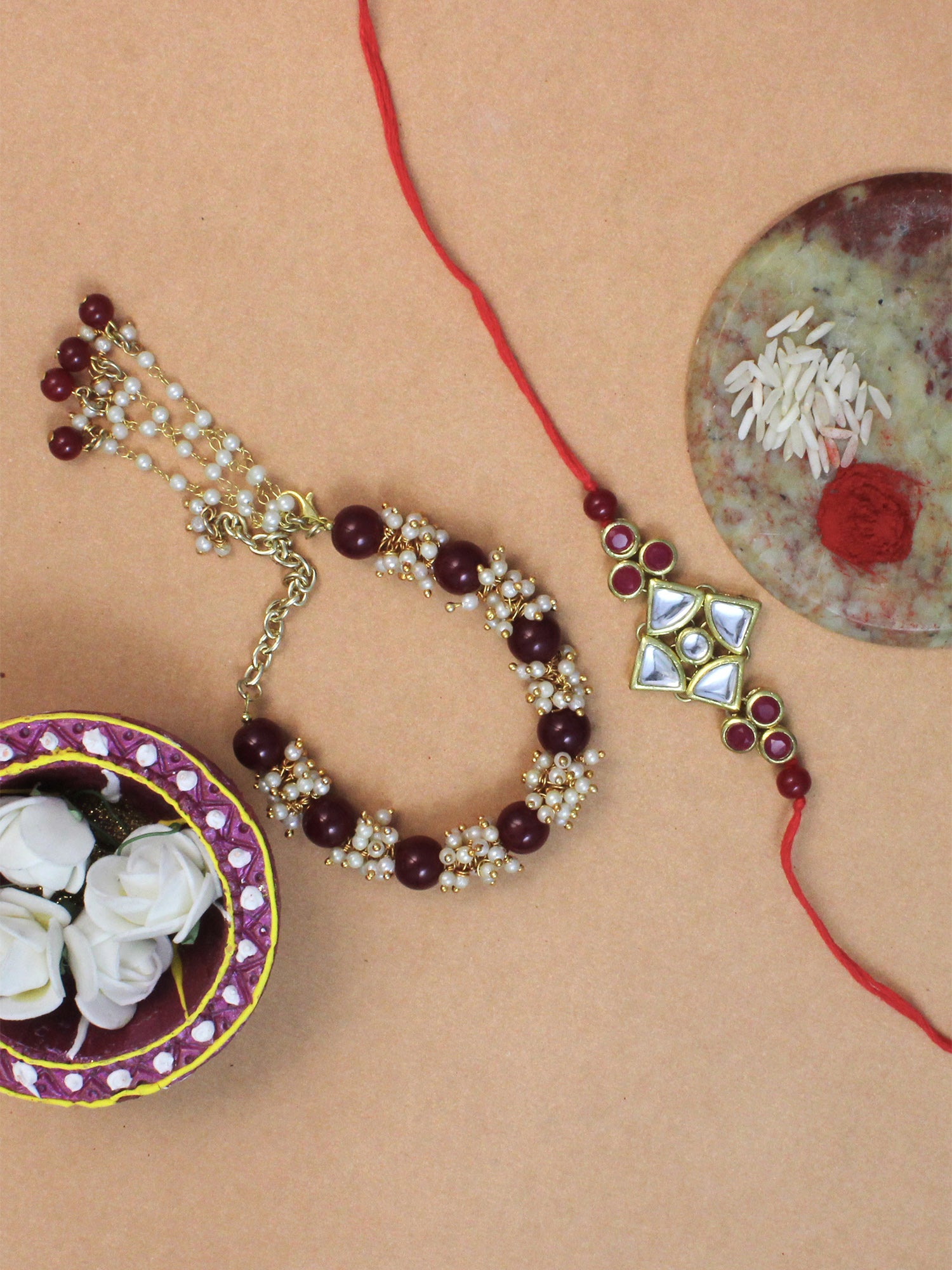 Set of 2 Gold Plated Handmade Kundan Bhaiya Bhabhi Rakhi Combo