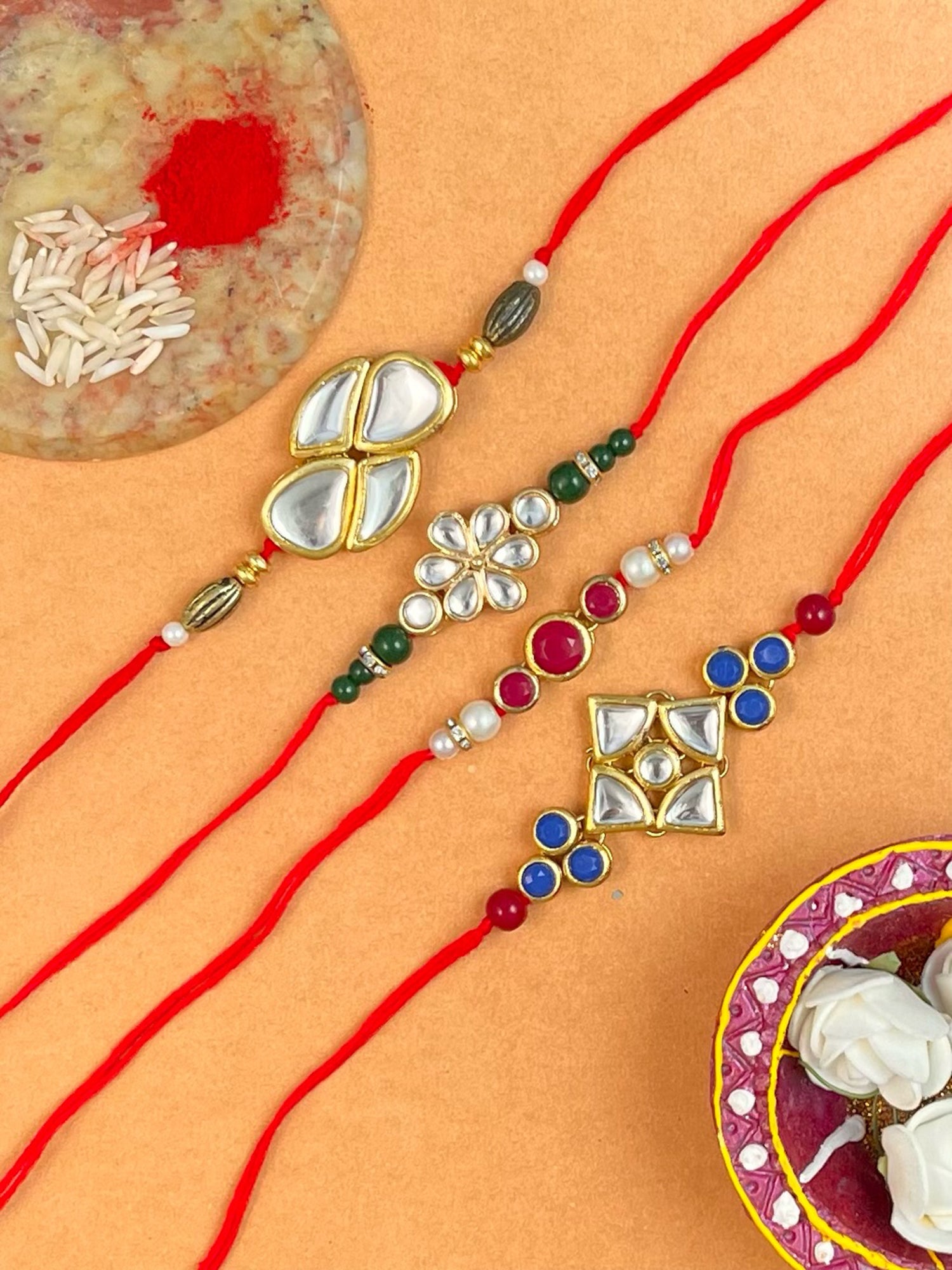 • Set of 4 Gold Plated Handmade Kundan Rakhi Combo with Roli & Chawal