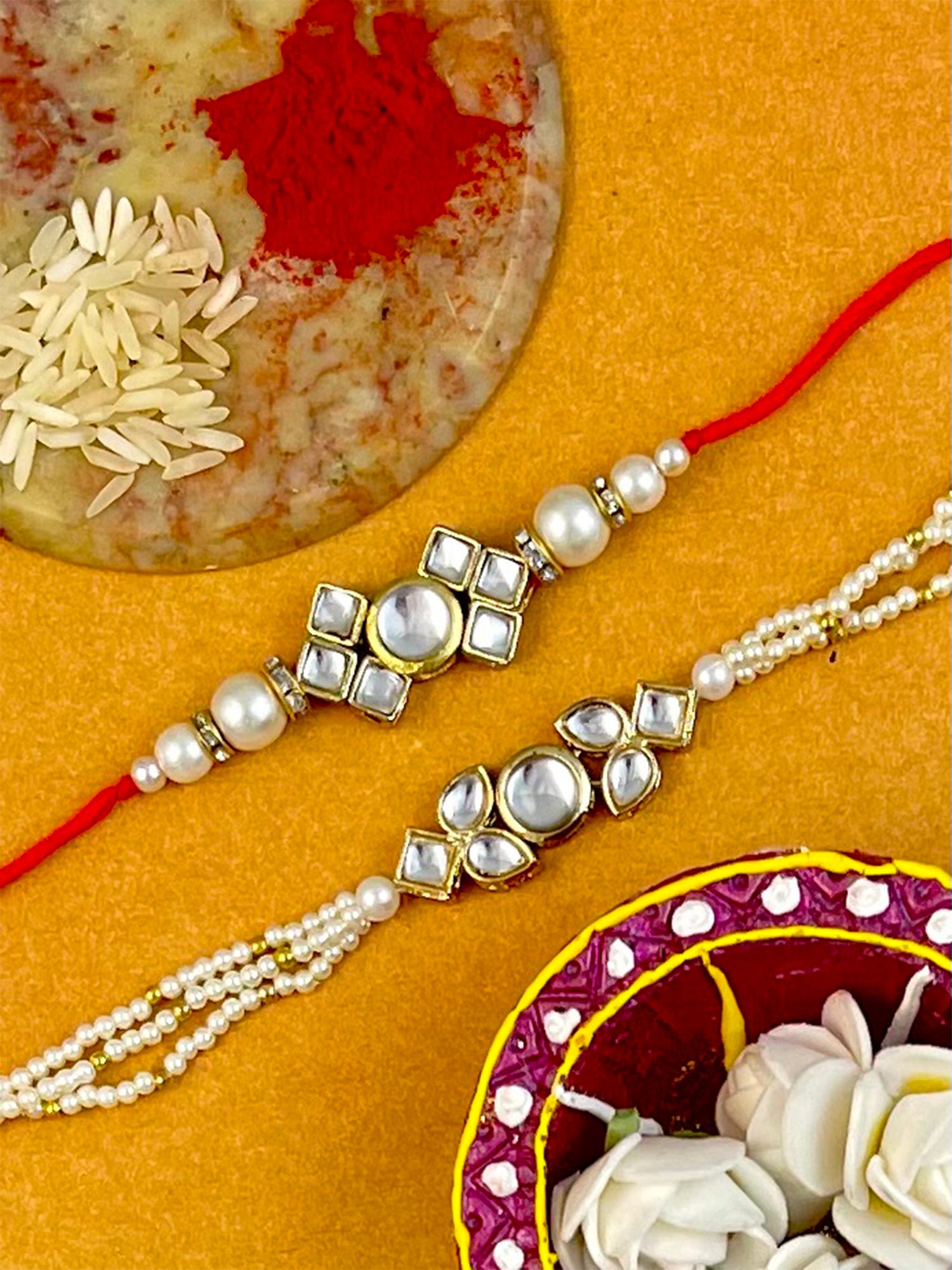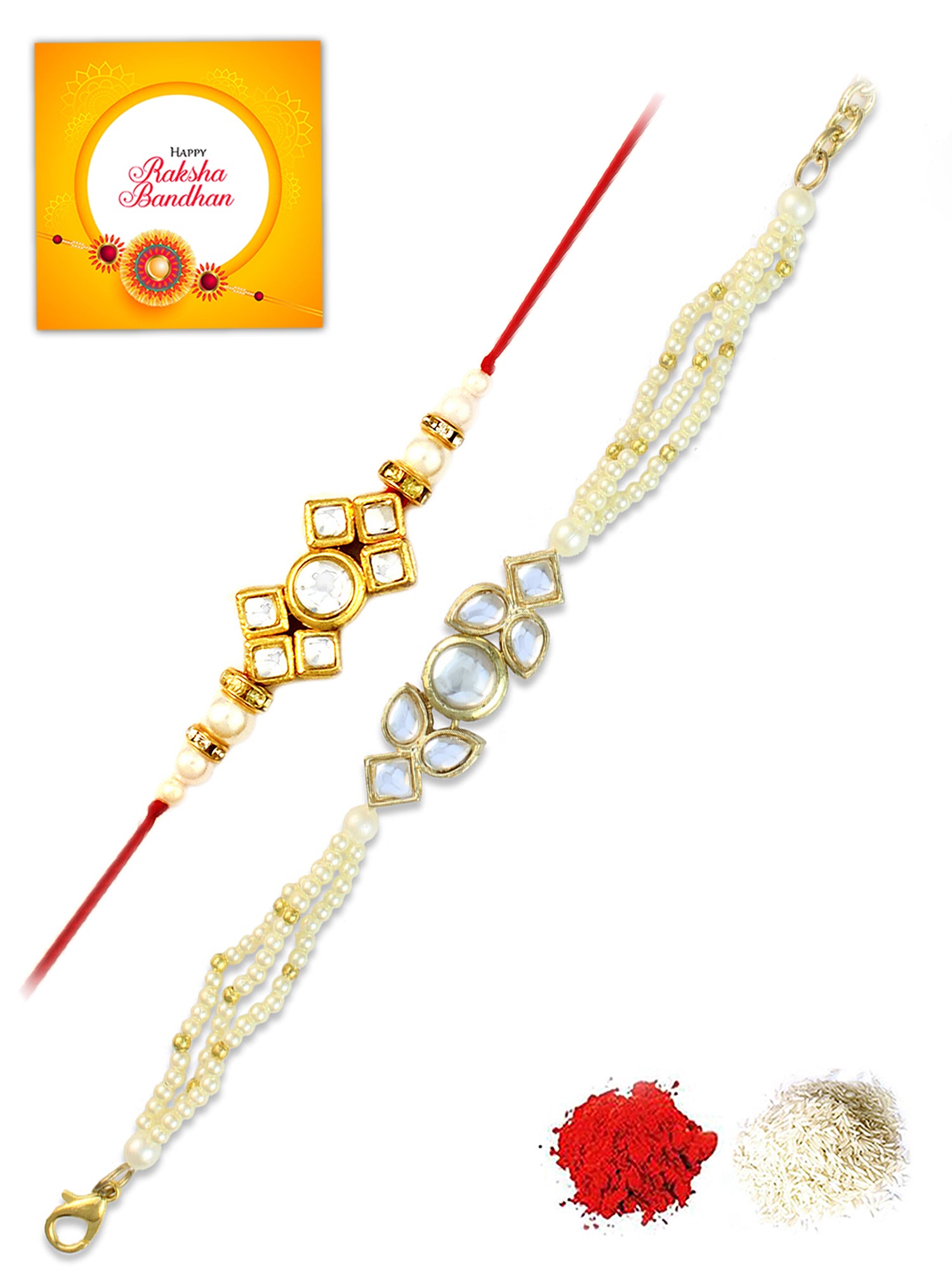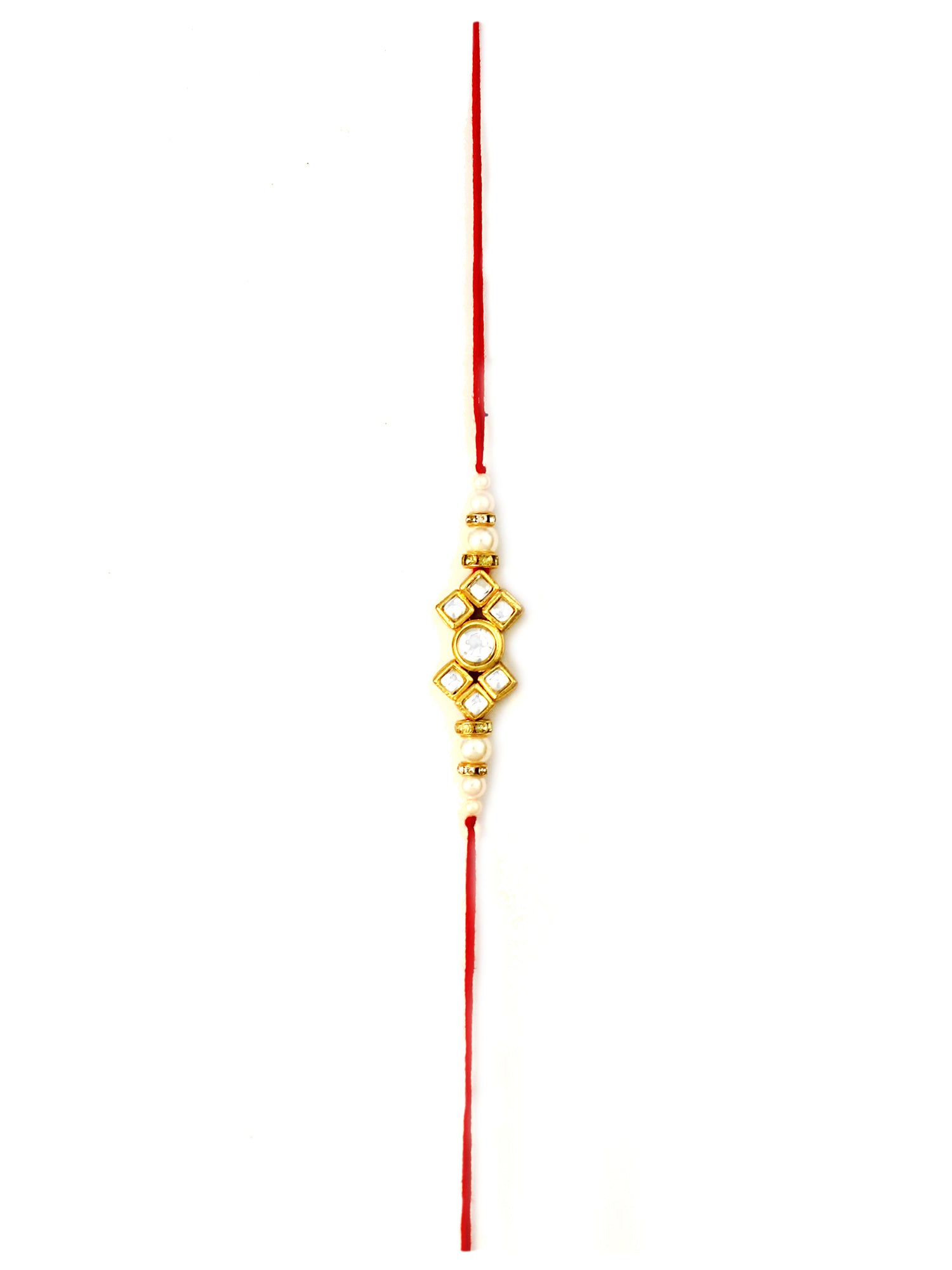 • Our rakhis are gold-plated and embellished with Kundan, Beads, Pearls, and Stones.