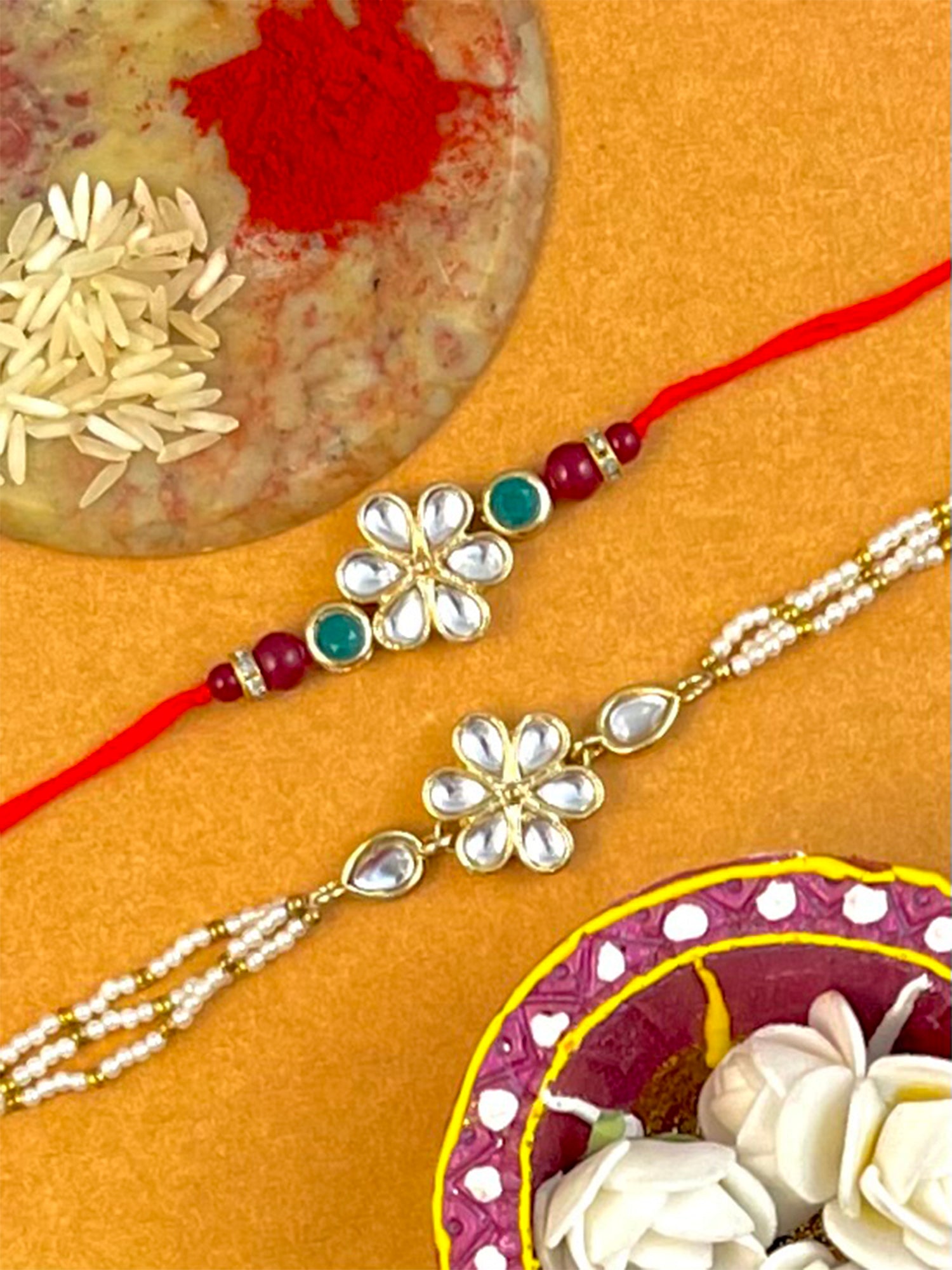 • Our rakhis are gold-plated and embellished with Kundan, Beads, Pearls, and Stones.