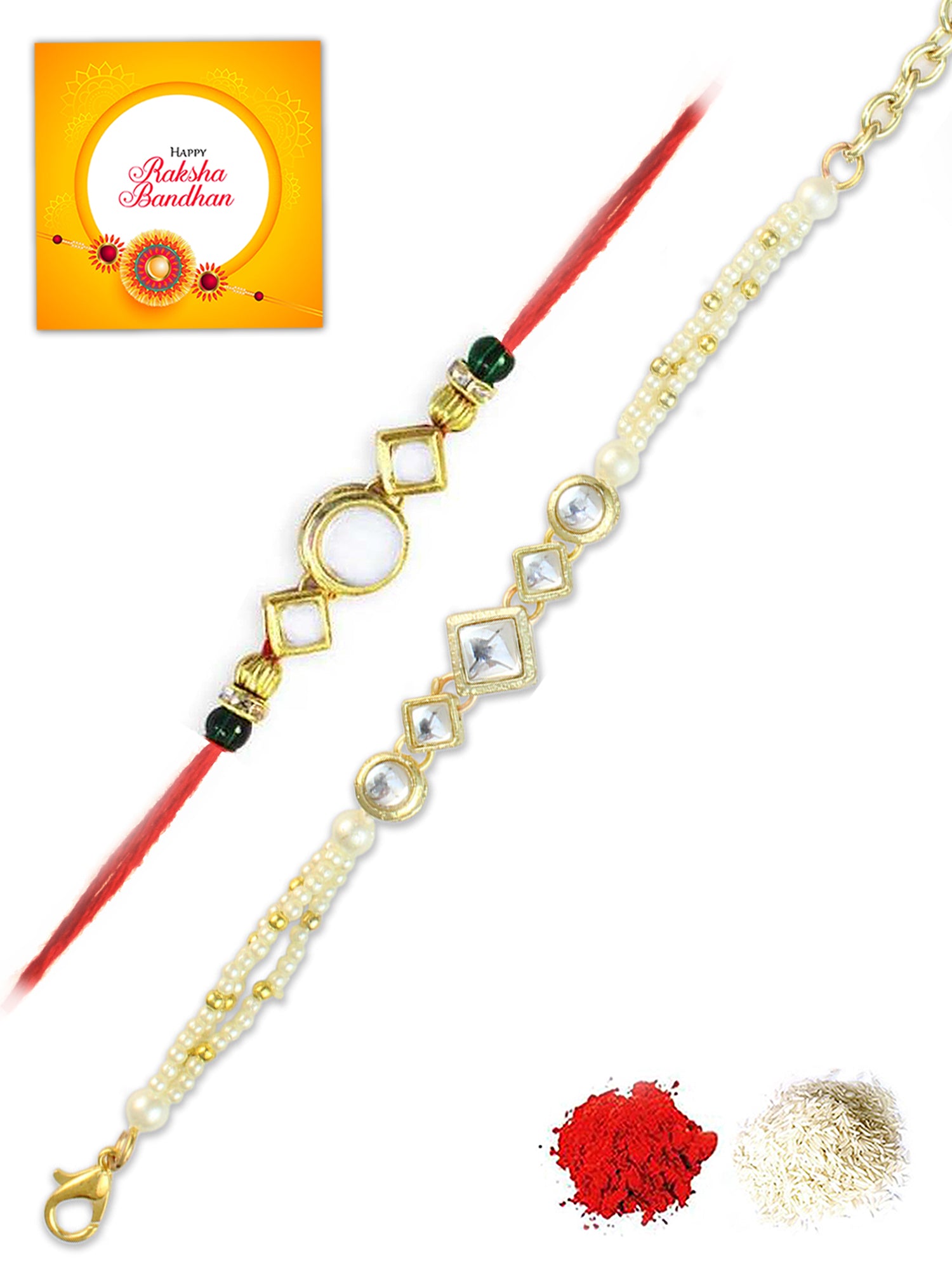Karatcart Rakhi for Brother and Bhabhi Set of 2 Gold Plated Handmade Kundan Bhiya Bhabhi Rakhi Combo with Roli & Chawal