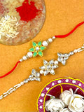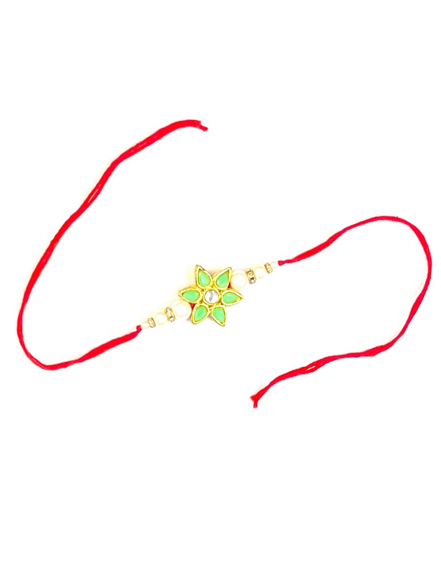 • Our rakhis are gold-plated and embellished with Kundan, Beads, Pearls, and Stones.
