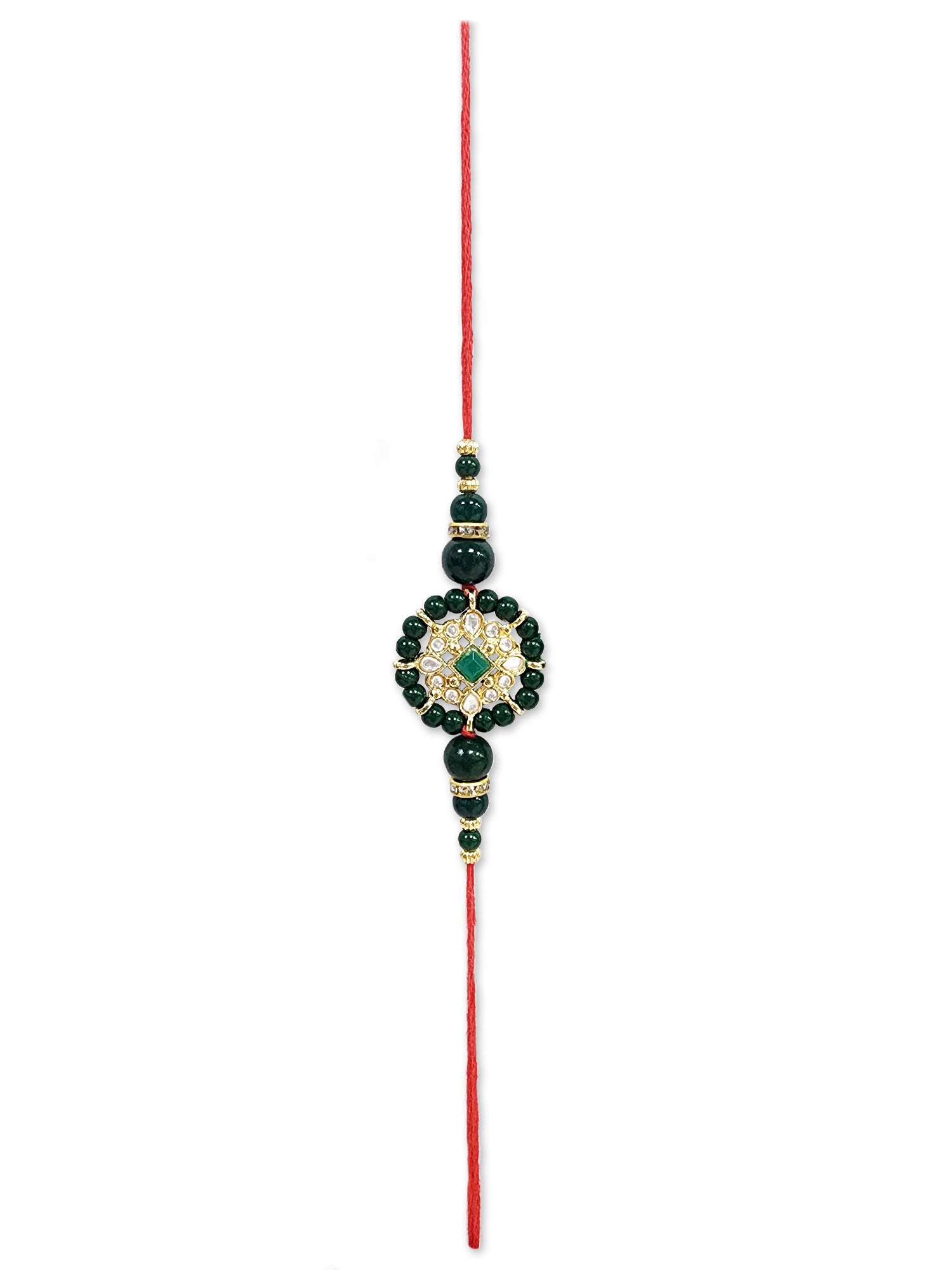 - Our rakhis are gold-plated and embellished with Kundan, Beads, Pearls, and Stones.