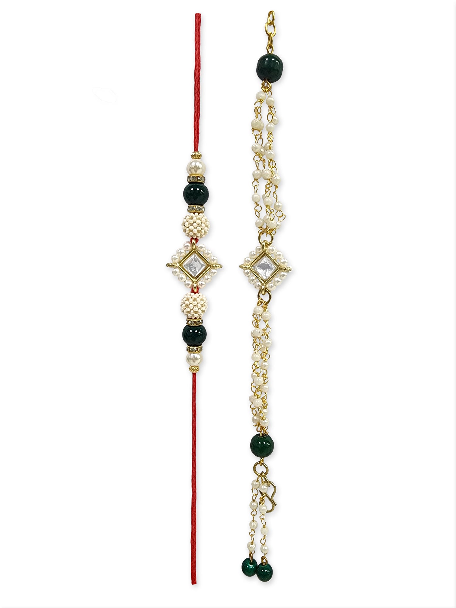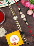 Karatcart Rakhi for Brother and Bhabhi Set of 2 Gold Plated Green Pearl Beads Handmade Kundan Bhiya Bhabhi Rakhi Combo with Roli & Chawal