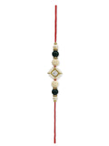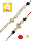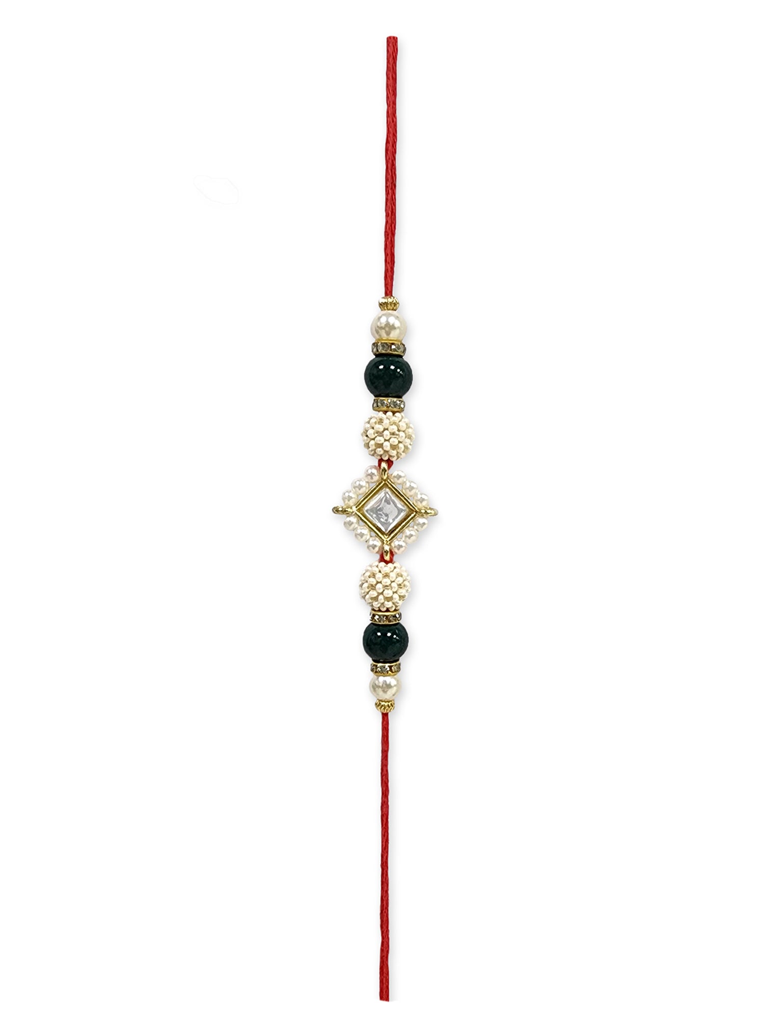 - Our rakhis are gold-plated and embellished with Kundan, Beads, Pearls, and Stones.
