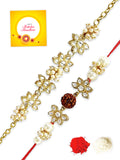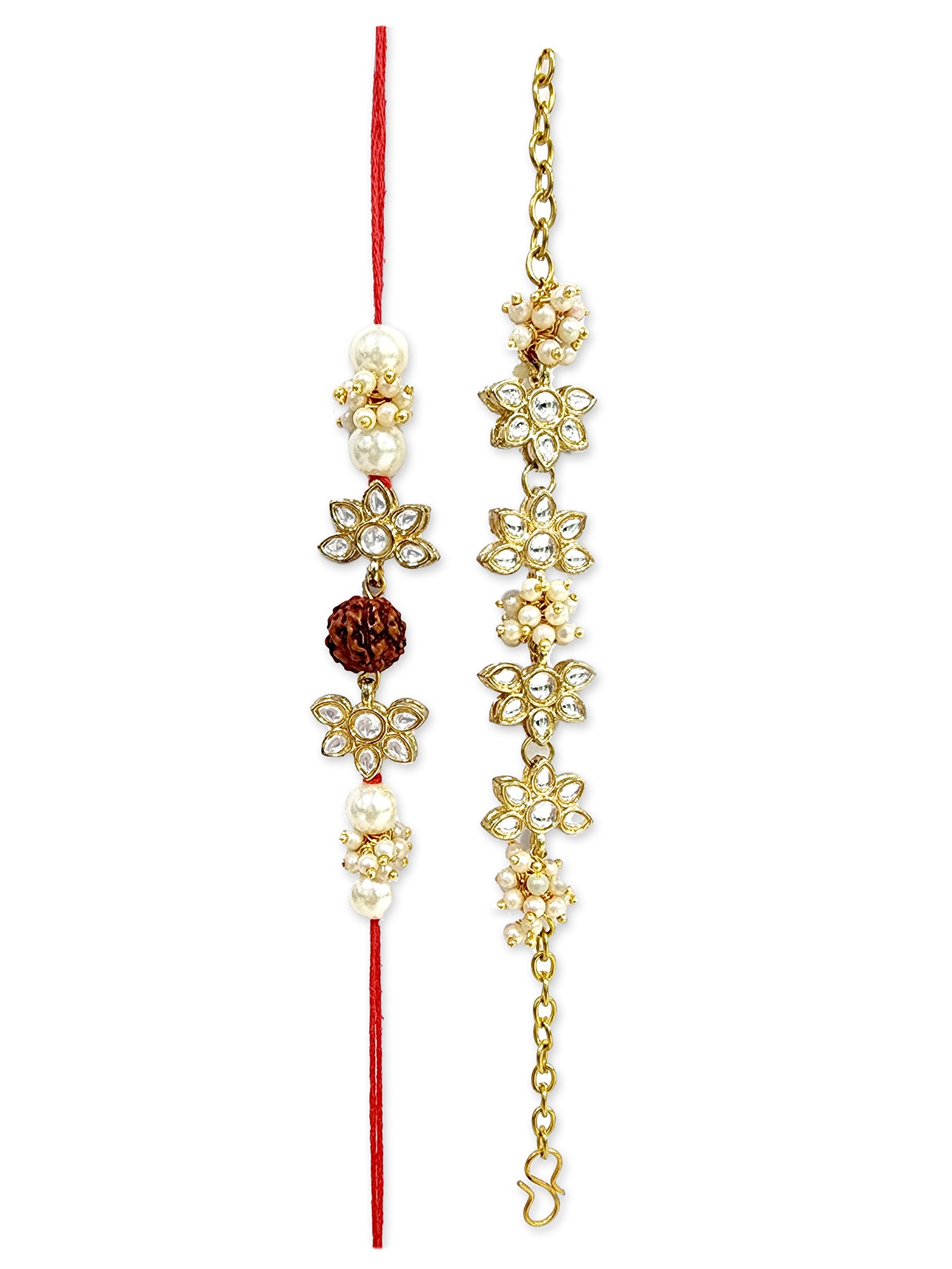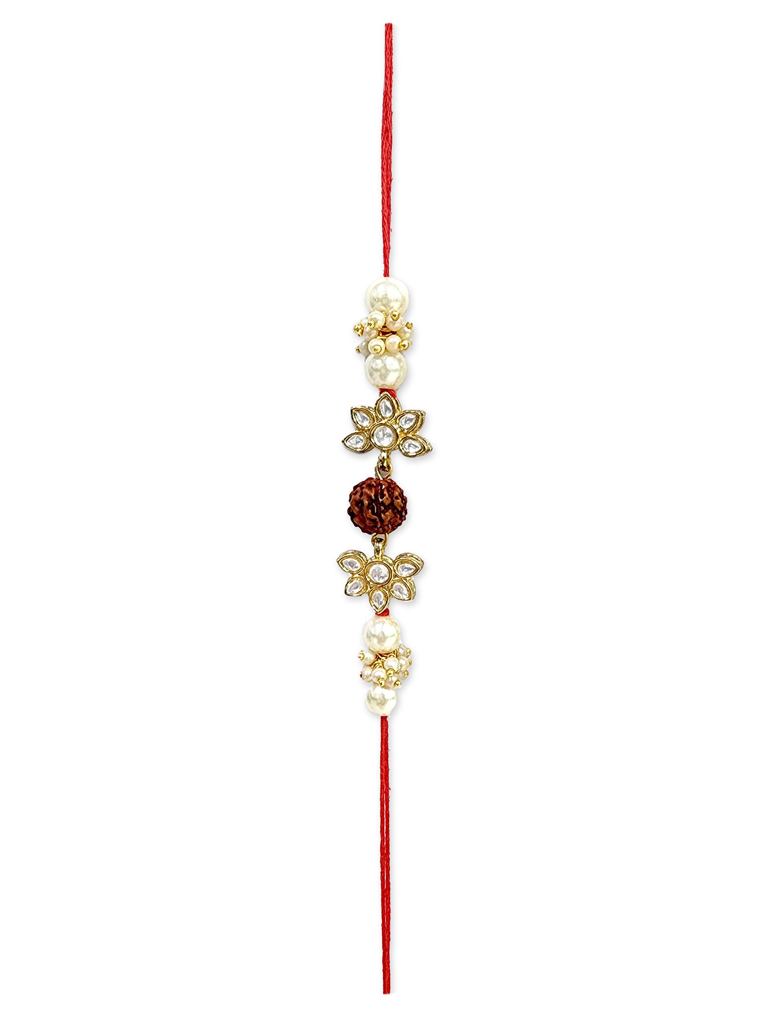 - Our rakhis are gold-plated and embellished with Kundan, Beads, Pearls, and Stones.