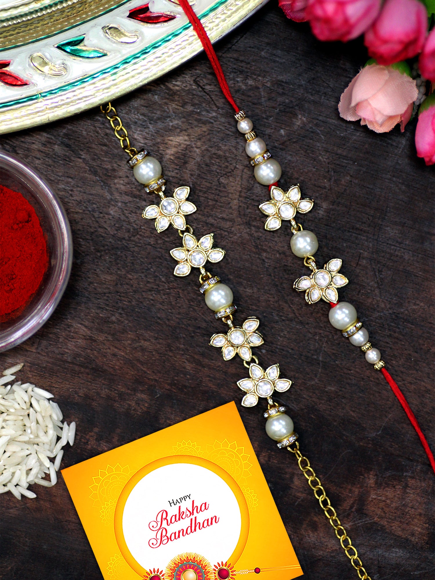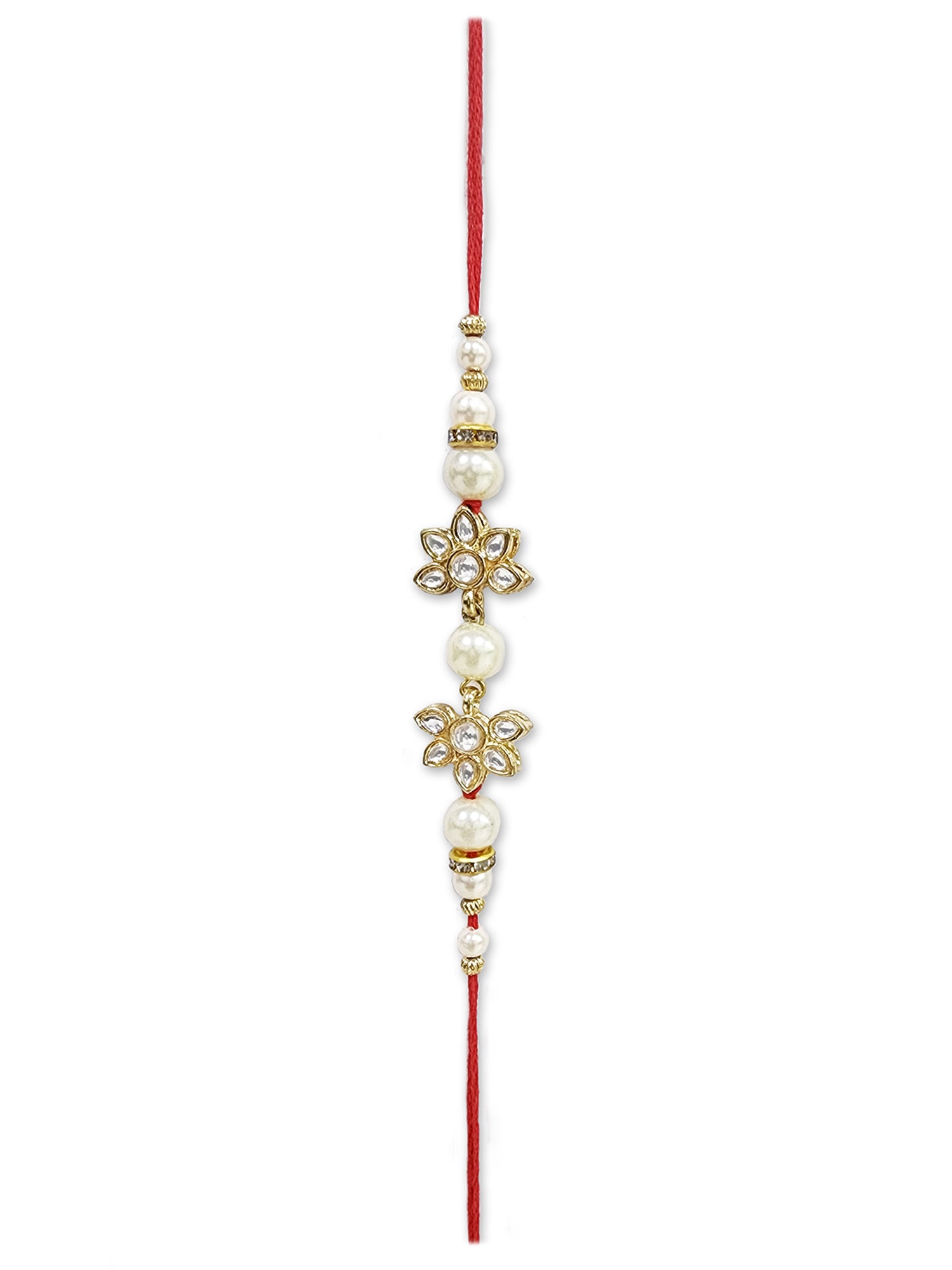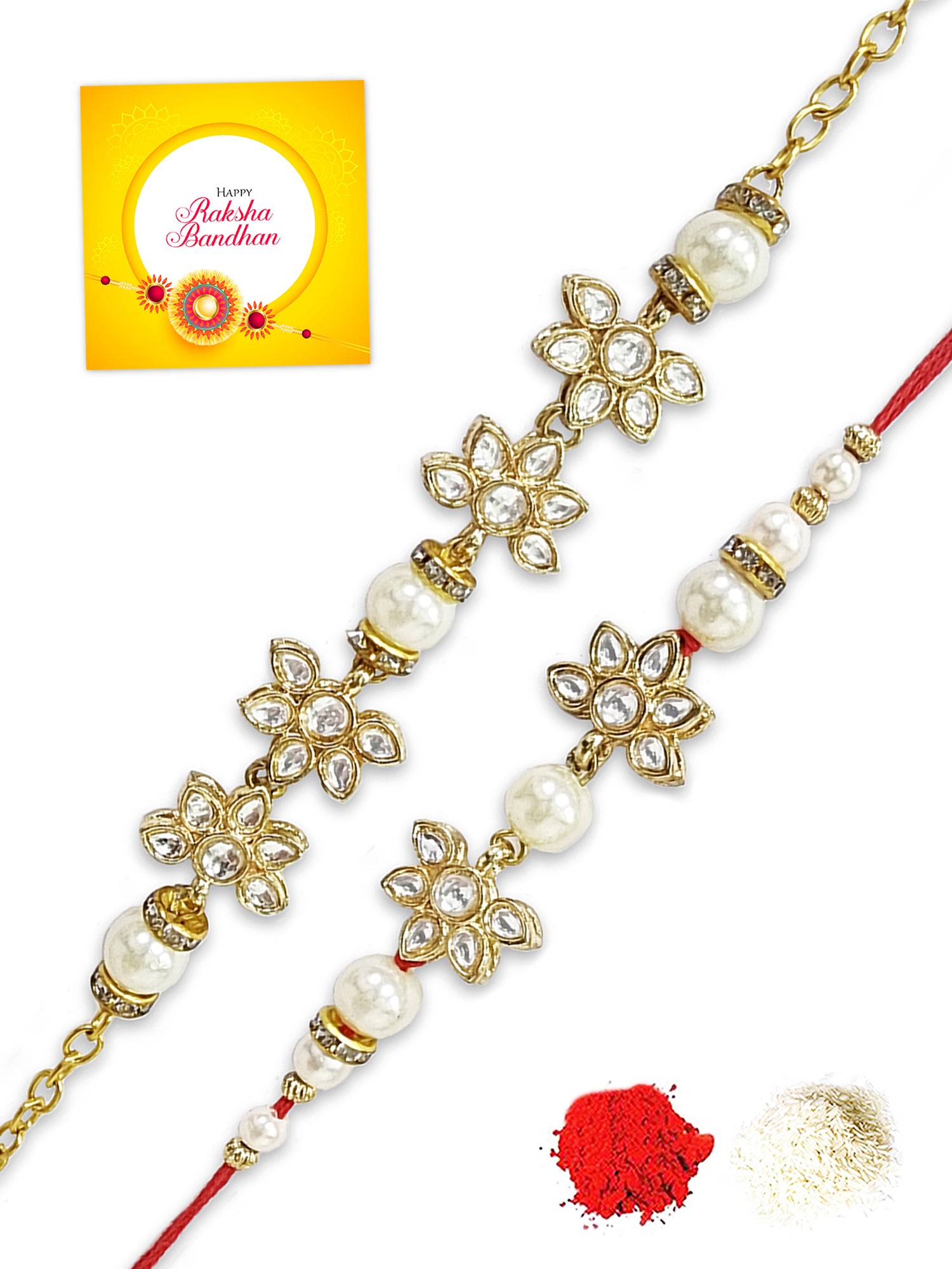 - Our rakhis are gold-plated and embellished with Kundan, Beads, Pearls, and Stones.