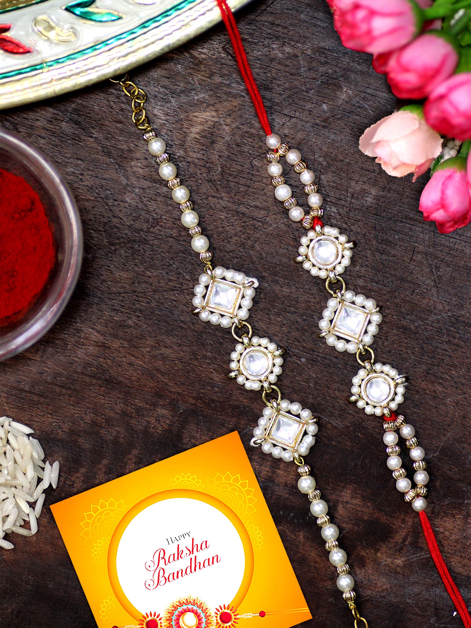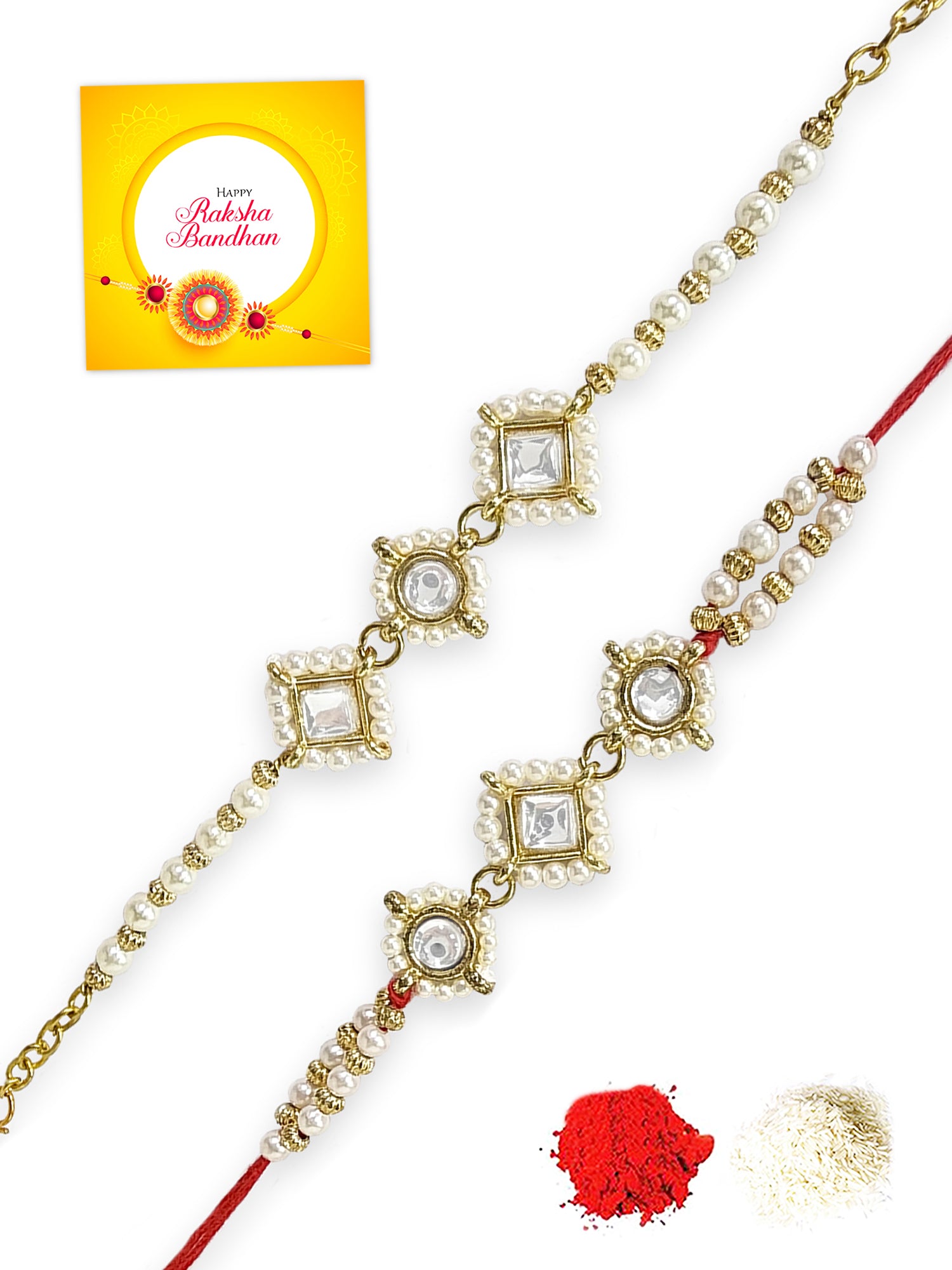 Karatcart Rakhi for Brother and Bhabhi Set of 2 Gold Plated Pearl Beaded Kundan Bhiya Bhabhi Rakhi Combo with Roli & Chawal