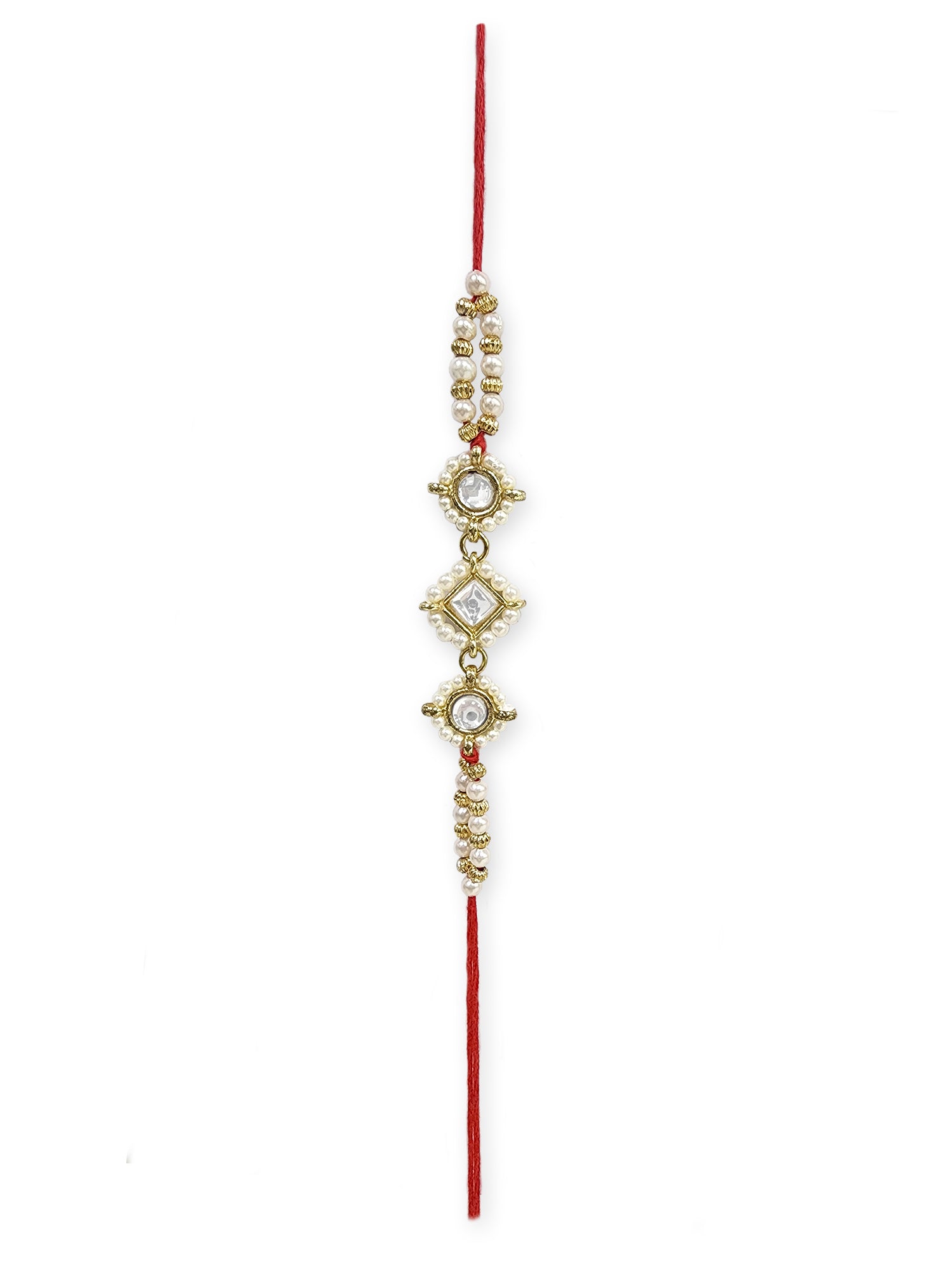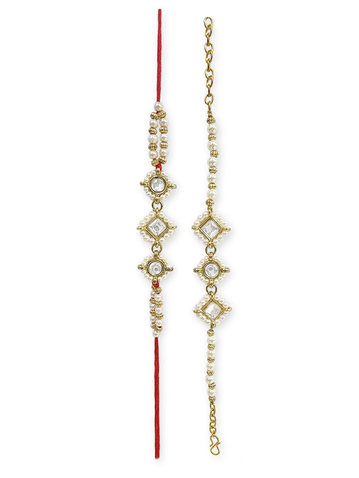 - Our rakhis are gold-plated and embellished with Kundan, Beads, Pearls, and Stones.