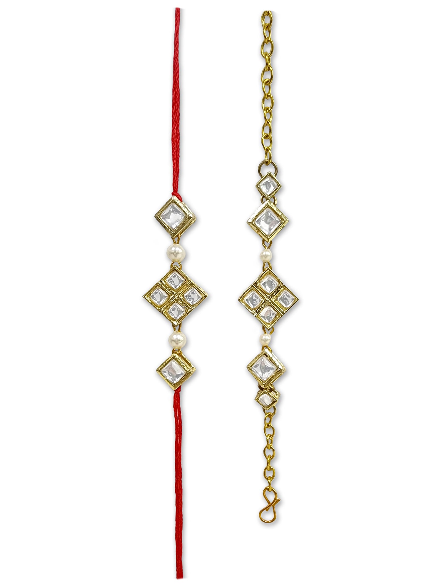 - Our rakhis are gold-plated and embellished with Kundan, Beads, Pearls, and Stones.