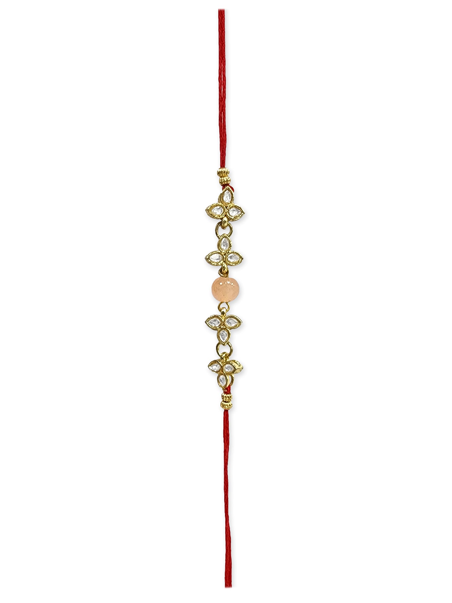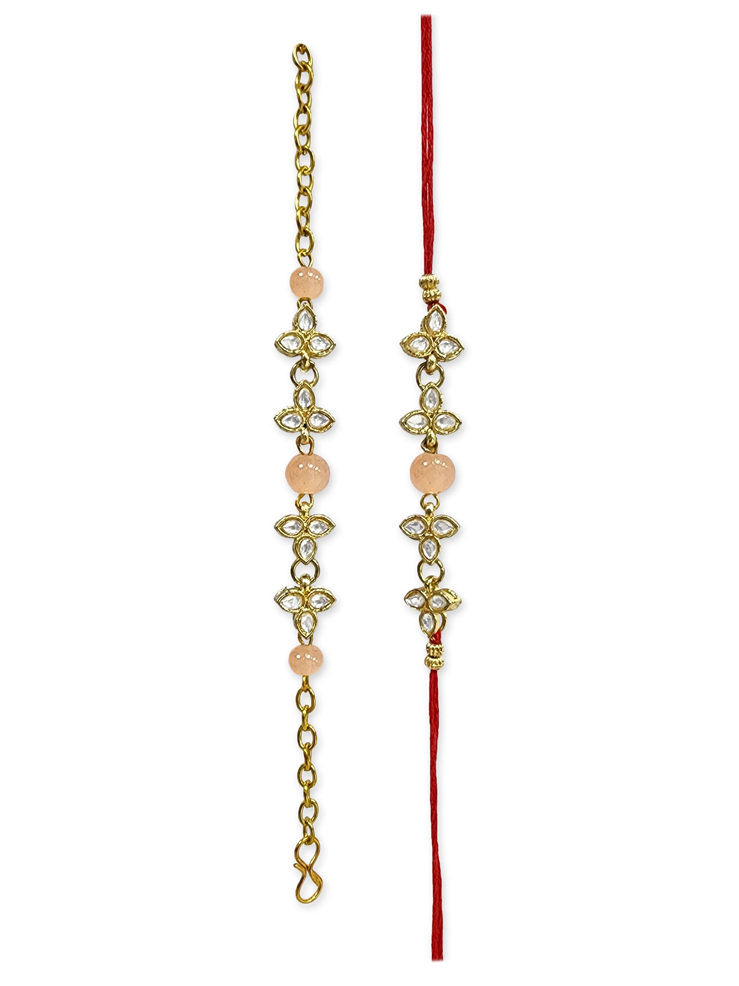 - Our rakhis are gold-plated and embellished with Kundan, Beads, Pearls, and Stones.
