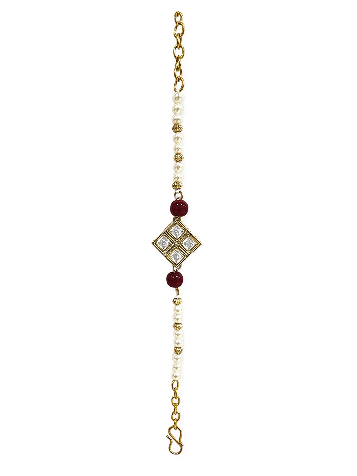 - Our rakhis are gold-plated and embellished with Kundan, Beads, Pearls, and Stones.