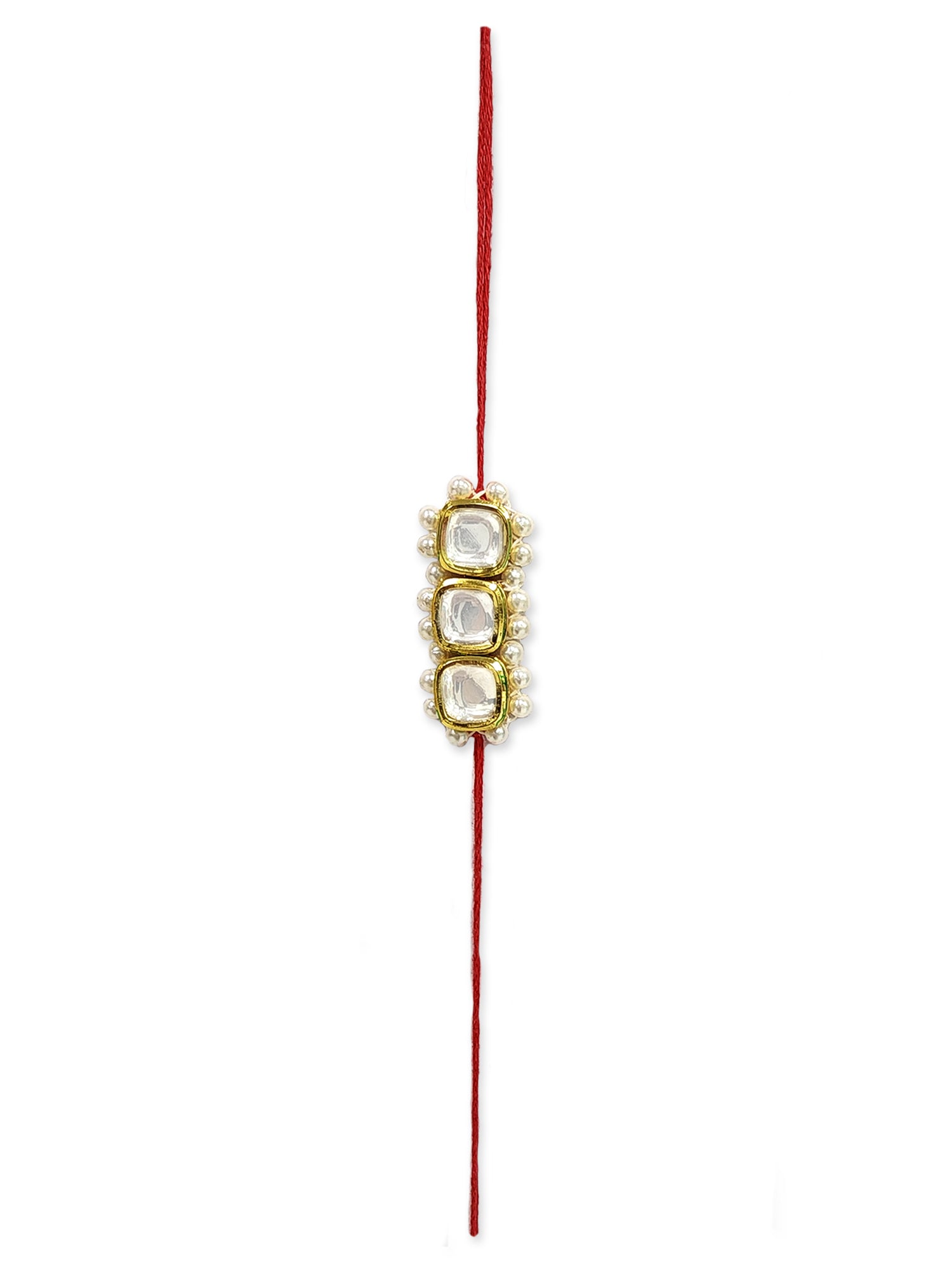 - Our rakhis are gold-plated and embellished with Kundan, Beads, Pearls, and Stones.