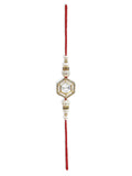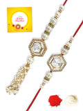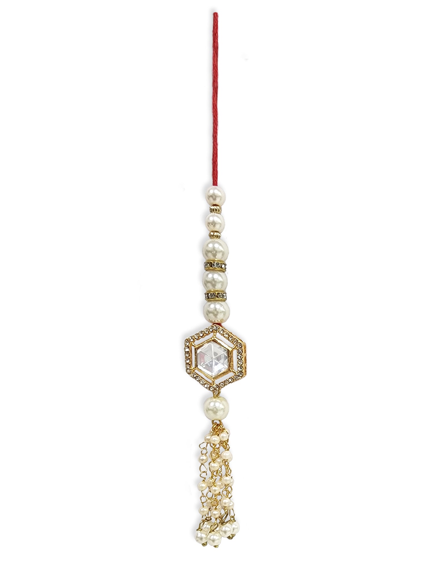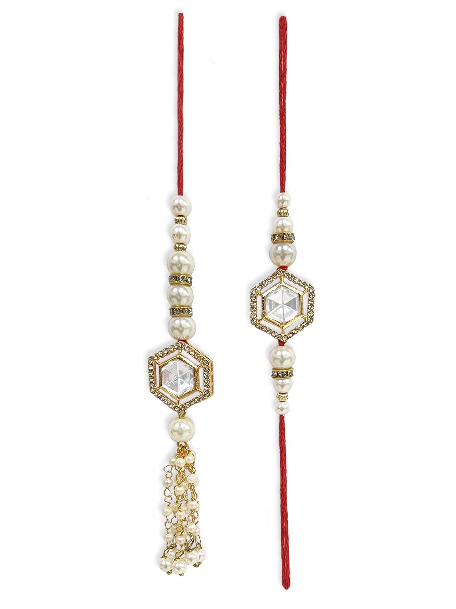 Karatcart Rakhi for Brother and Bhabhi Set of 2 Gold Plated Pearl and Polki Kundan Handmade Bhiya Bhabhi Rakhi Combo with Roli & Chawal