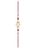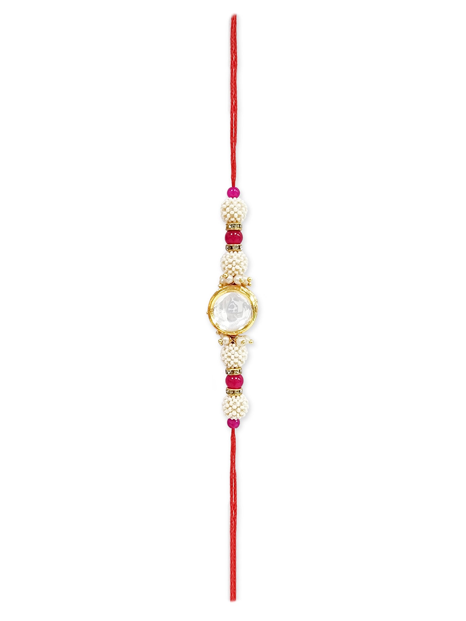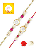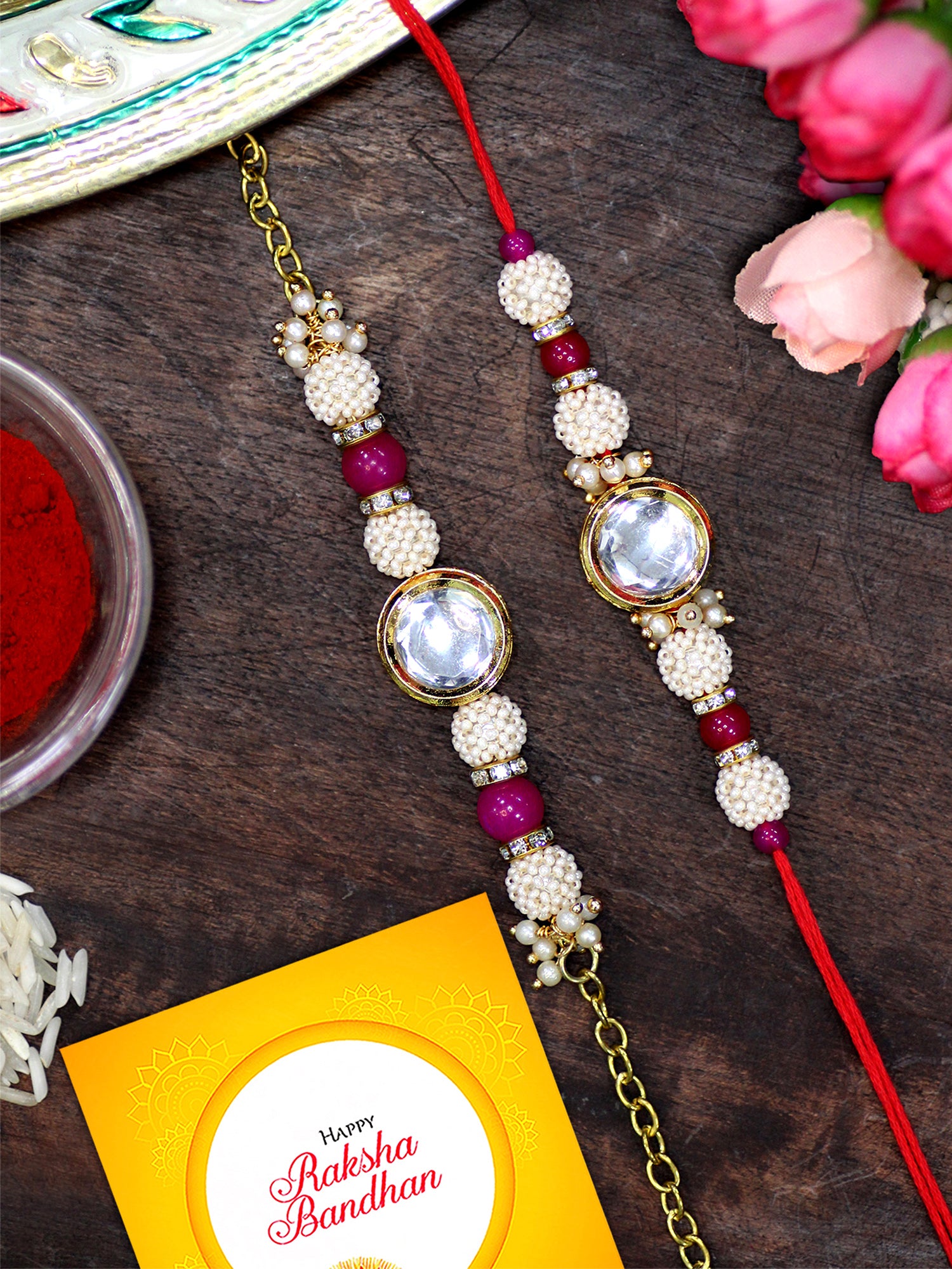 - Our rakhis are gold-plated and embellished with Kundan, Beads, Pearls, and Stones.