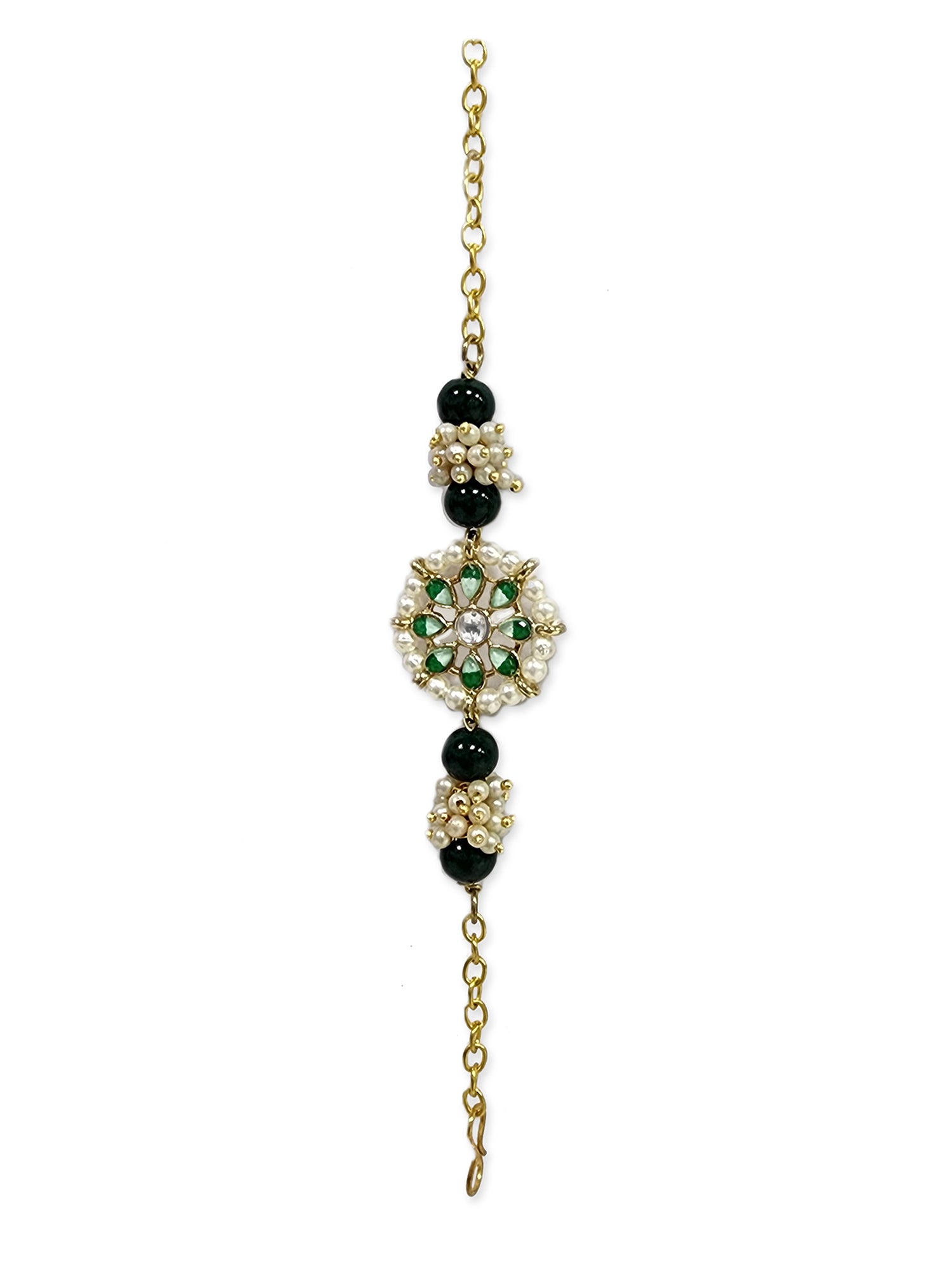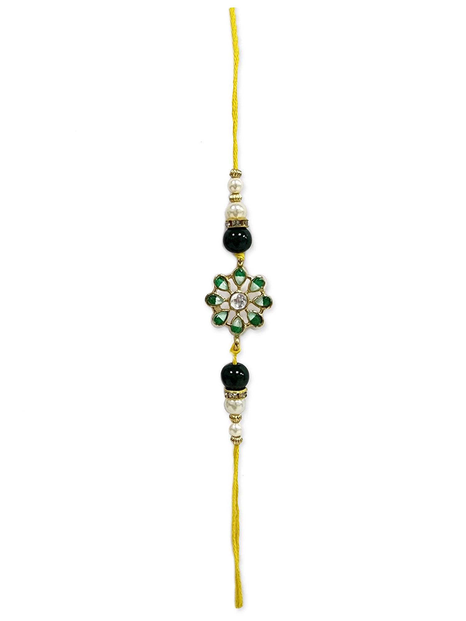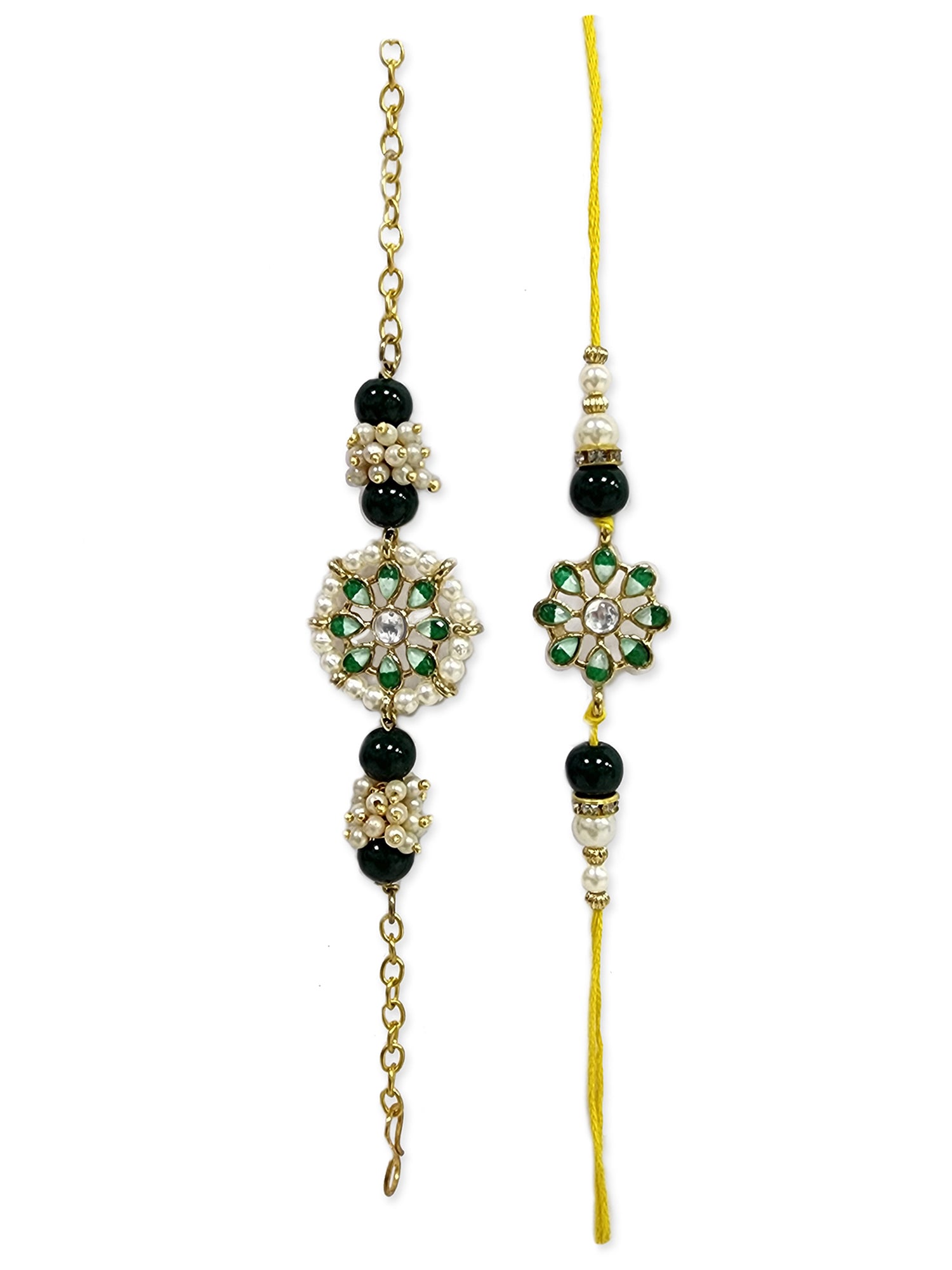 - Our rakhis are gold-plated and embellished with Kundan, Beads, Pearls, and Stones.