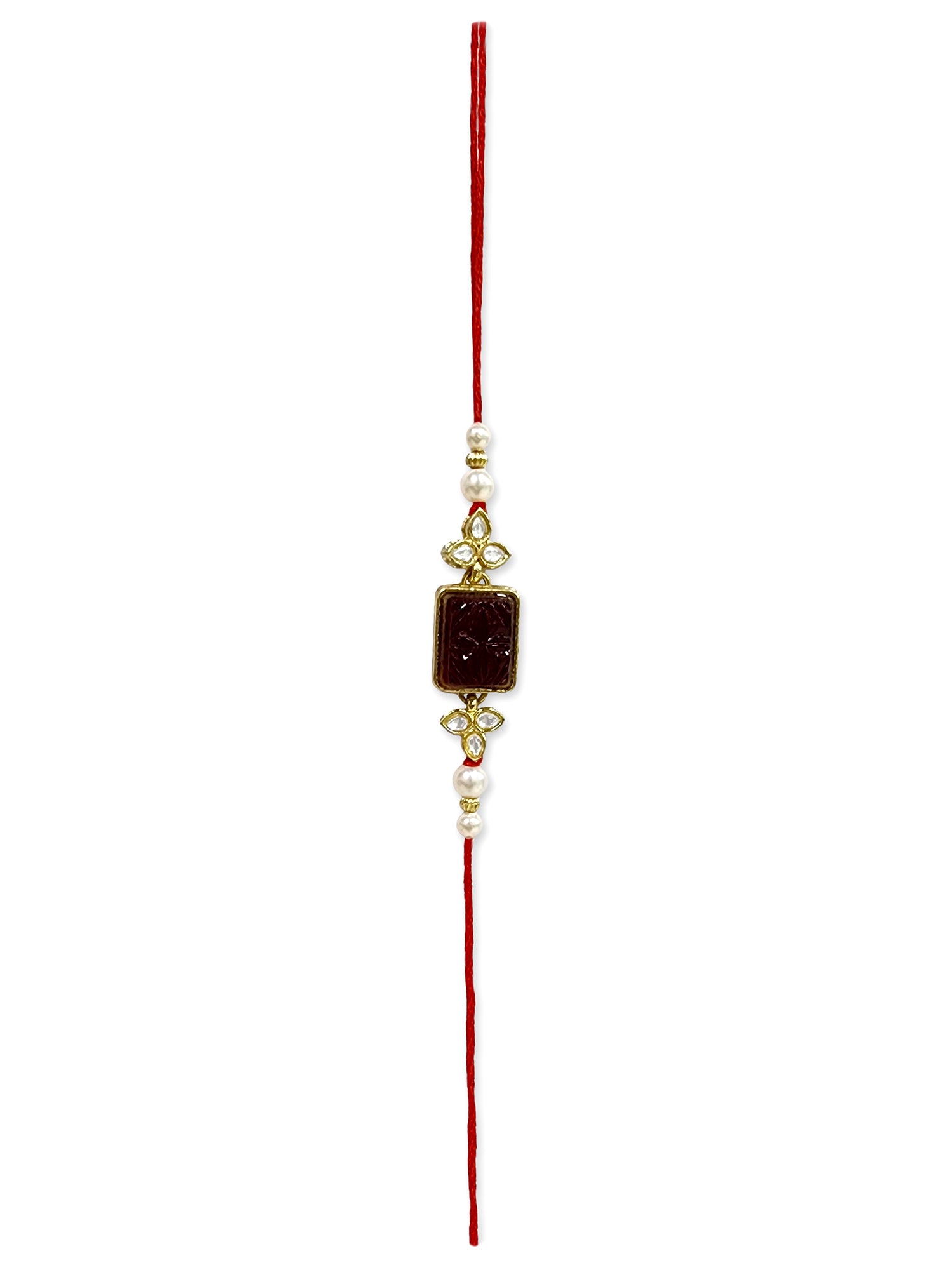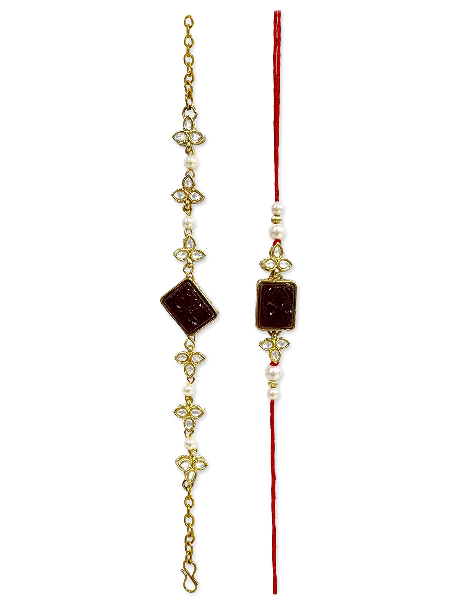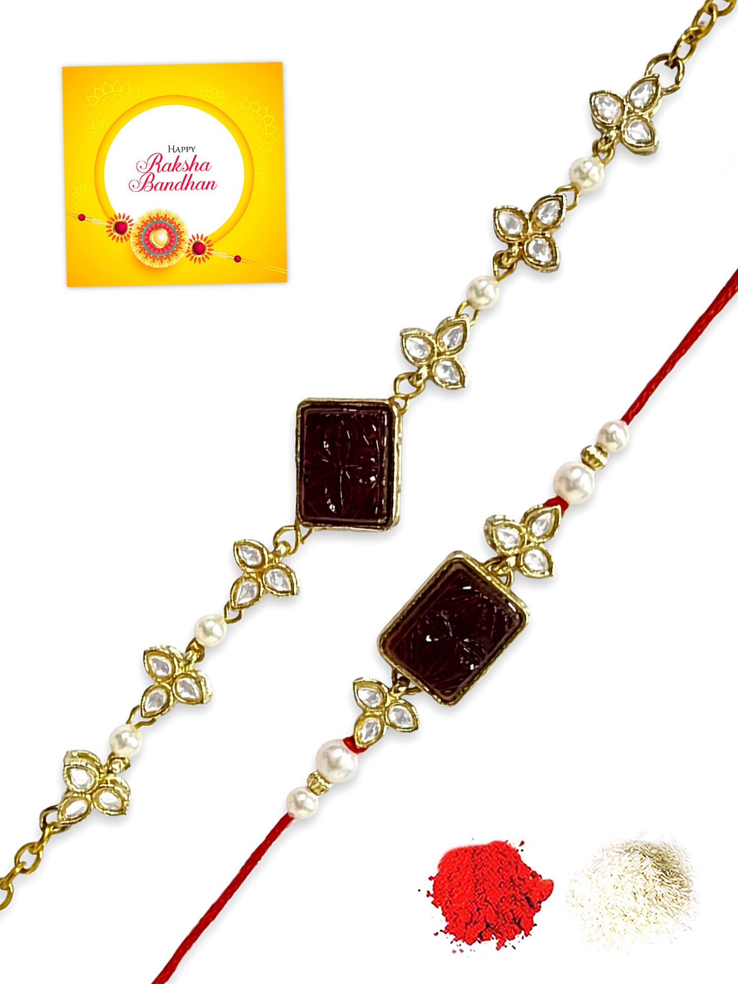 - Our rakhis are gold-plated and embellished with Kundan, Beads, Pearls, and Stones.