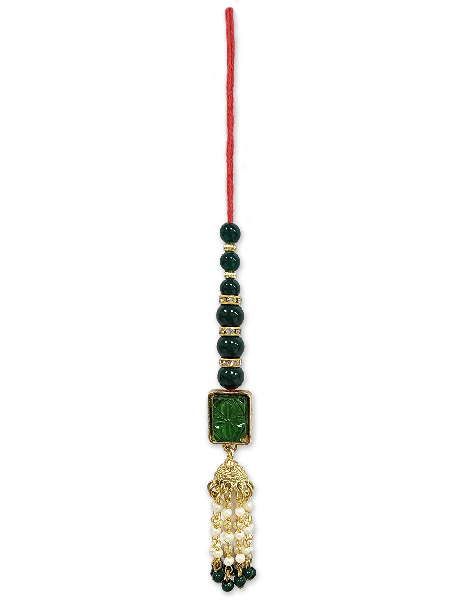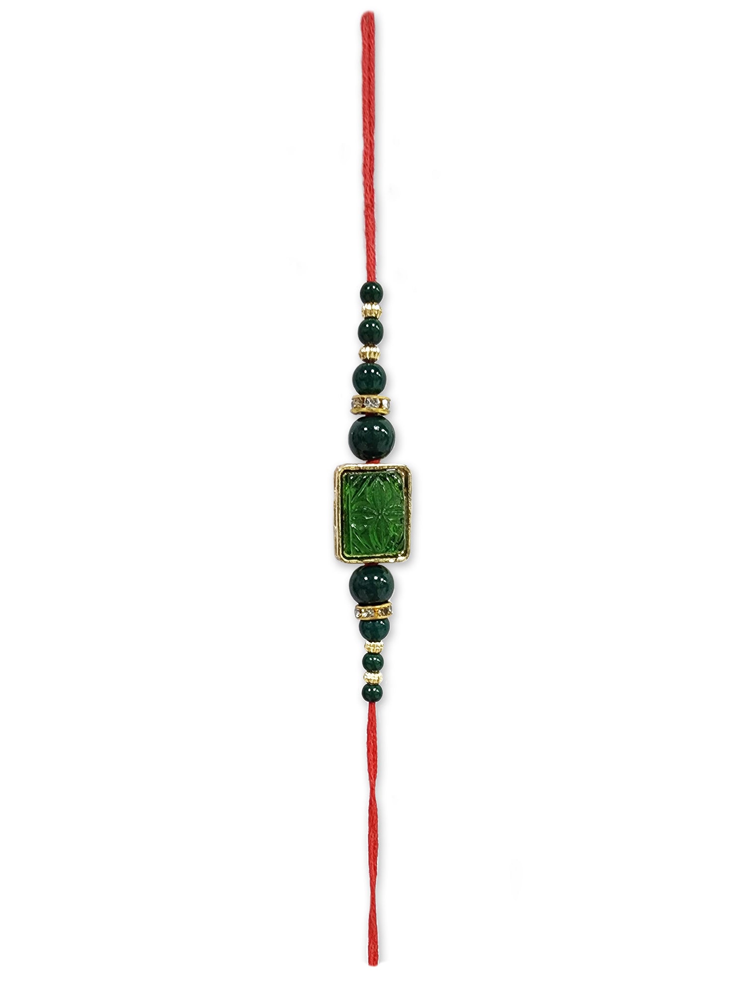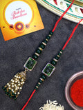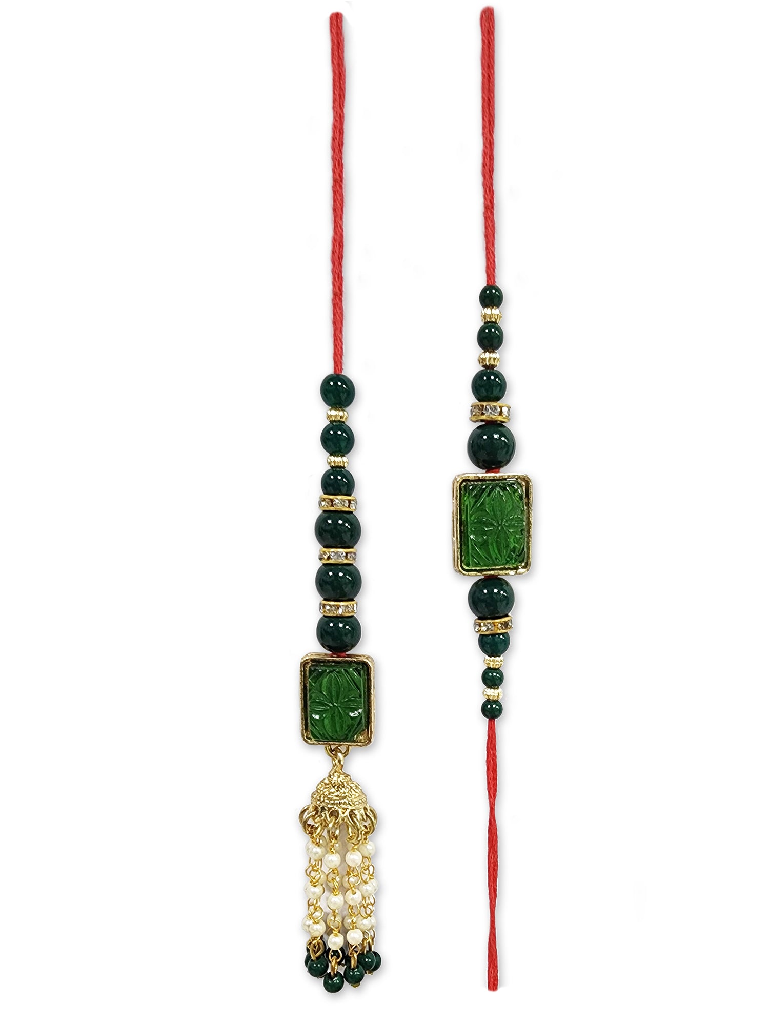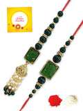 Karatcart Rakhi for Brother and Bhabhi Set of 2 Gold Plated Green Carved Stone Kundan Handmade Bhiya Bhabhi Rakhi Combo with Roli & Chawal