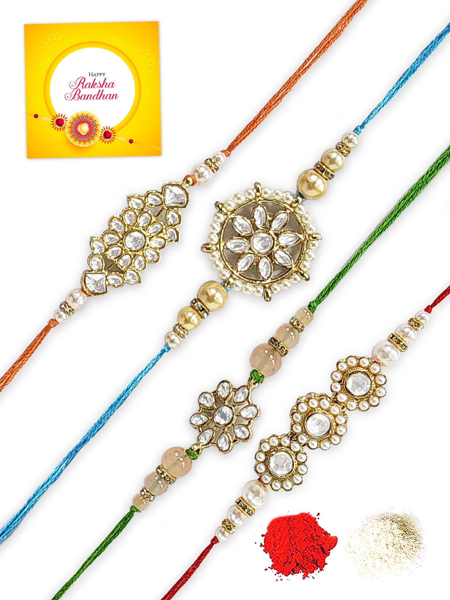 • Our rakhis are gold-plated and embellished with Kundan, Beads, Pearls, and Stones.