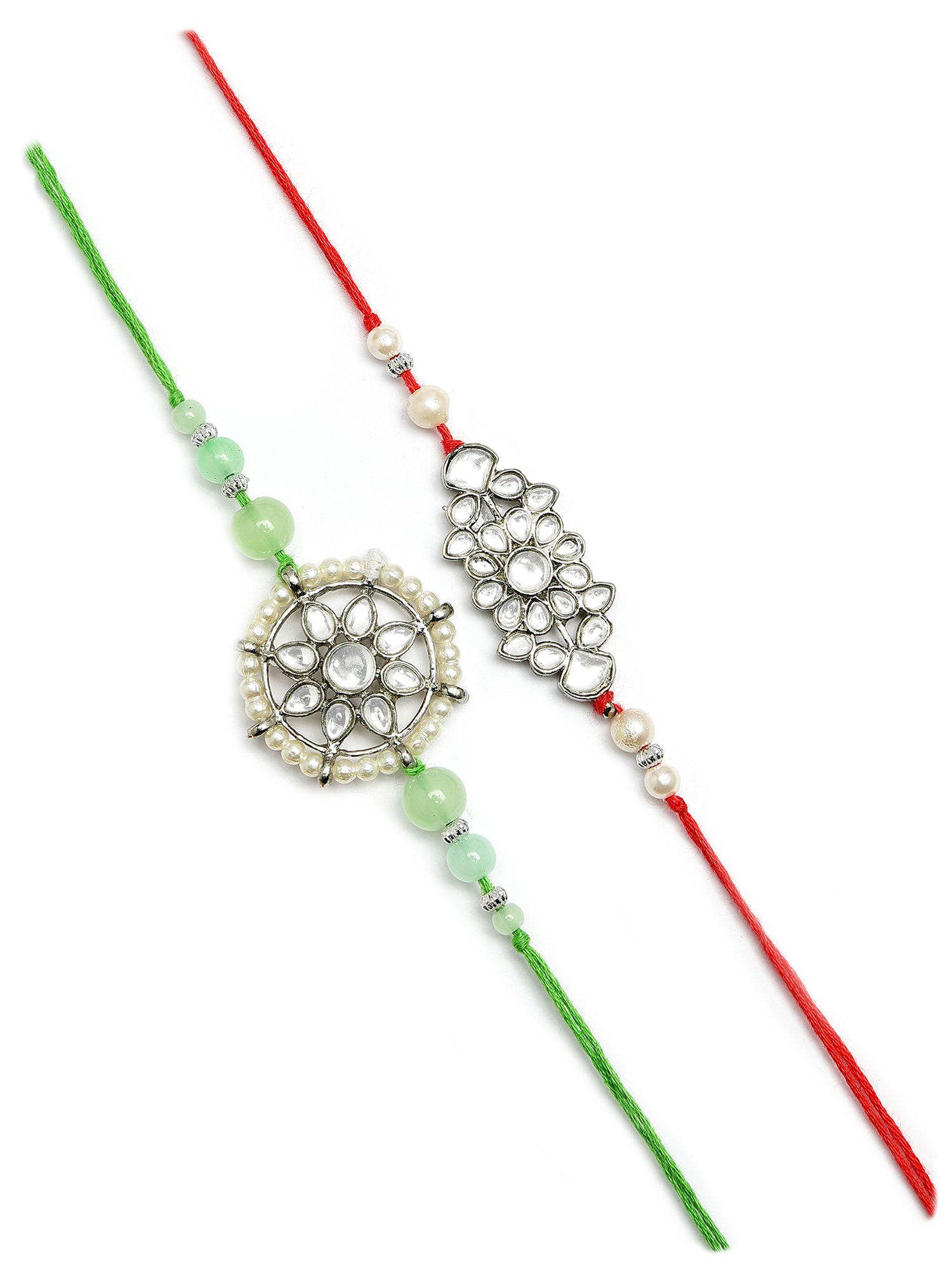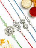 Karatcart Rakhi for Brother Set of 4 Silver Plated Handmade Kundan Rakhi with Roli & Chawal