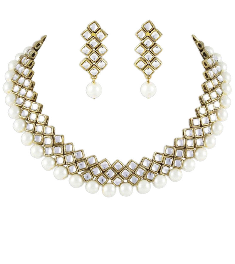 Small cube-shaped KundansåÊconnected together to form a mesmerising choker chain combined with a string of pearls. A complete package of royalness in a 10 inches long necklace.