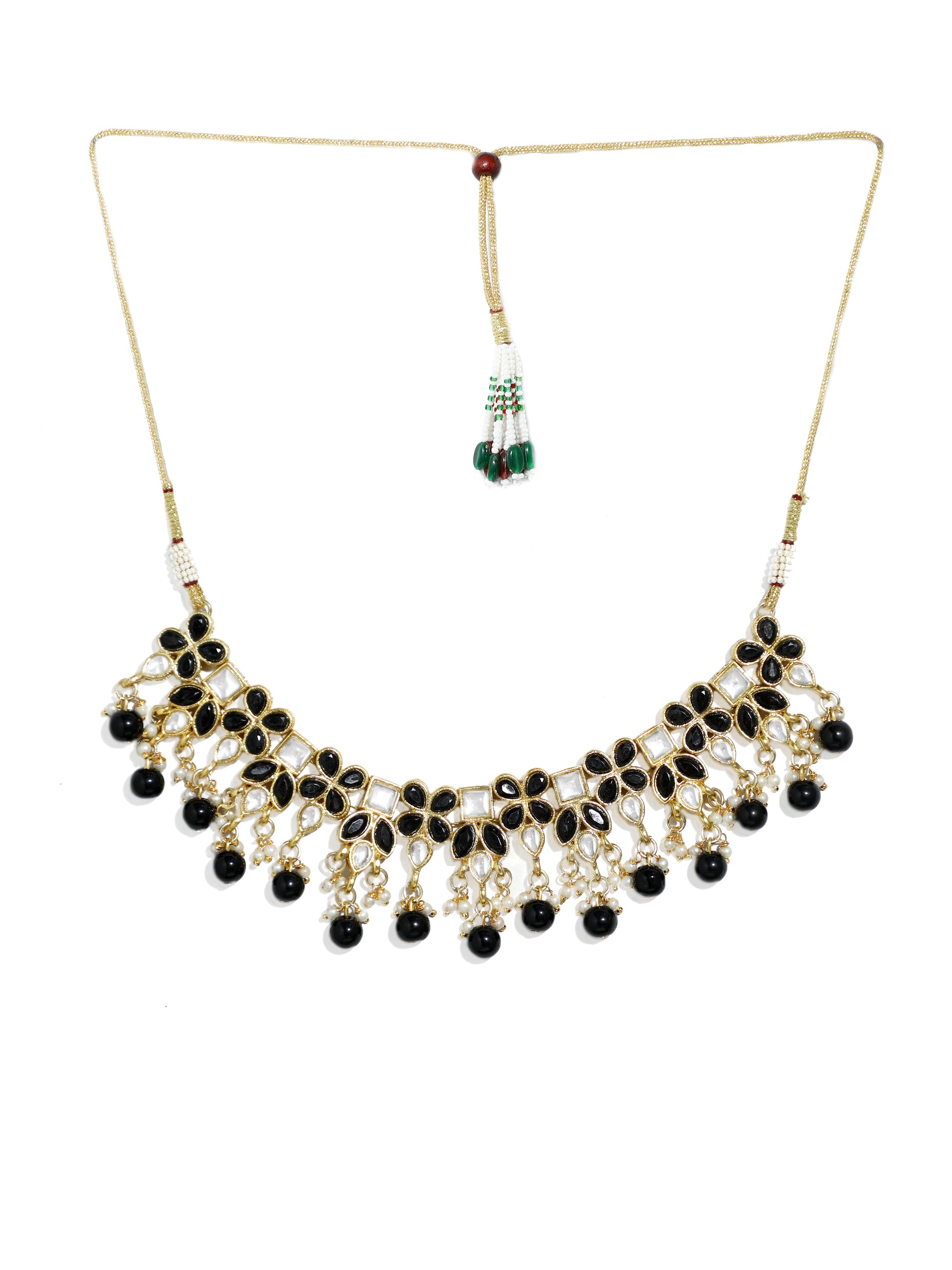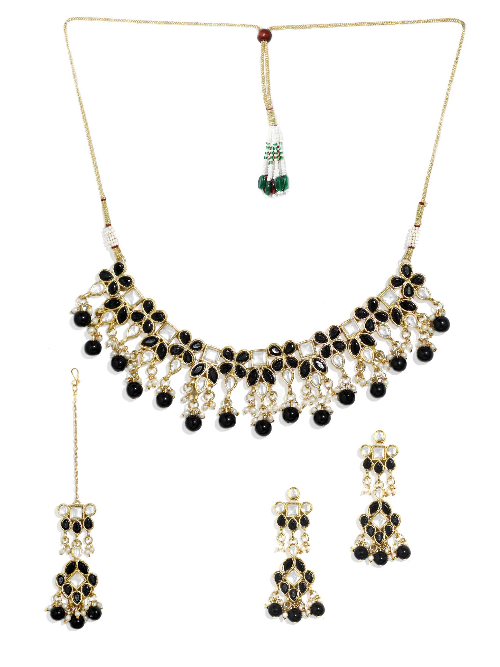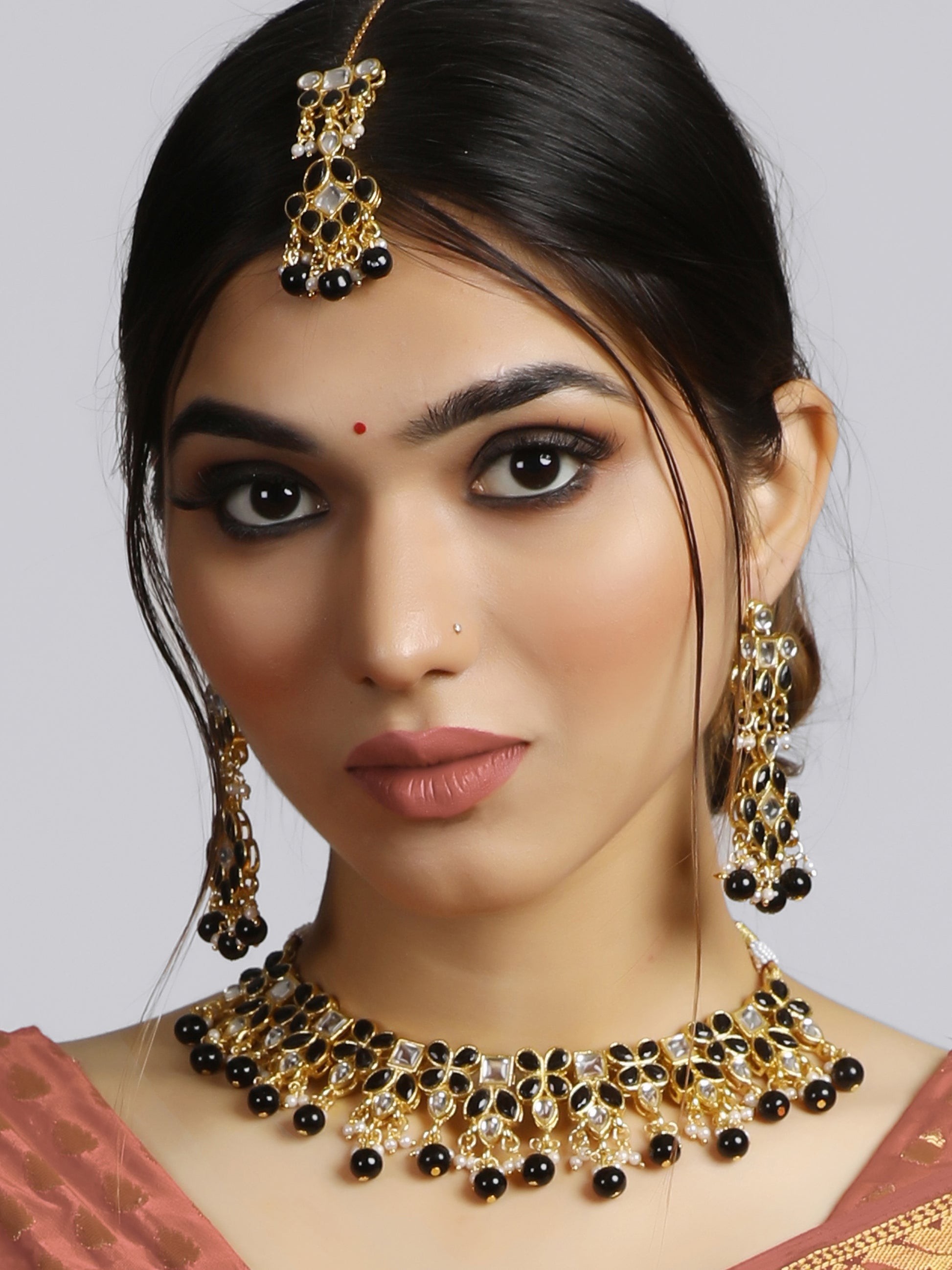 - Kundan Black Choker Necklace Set with Earrings and Maangtikka. Best when paired with Indian or Indo Western Attire. Made with Internationally approved skin-friendly material, this set is a must-have for your collection.
