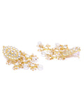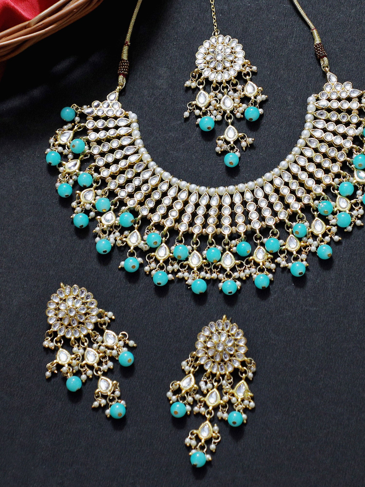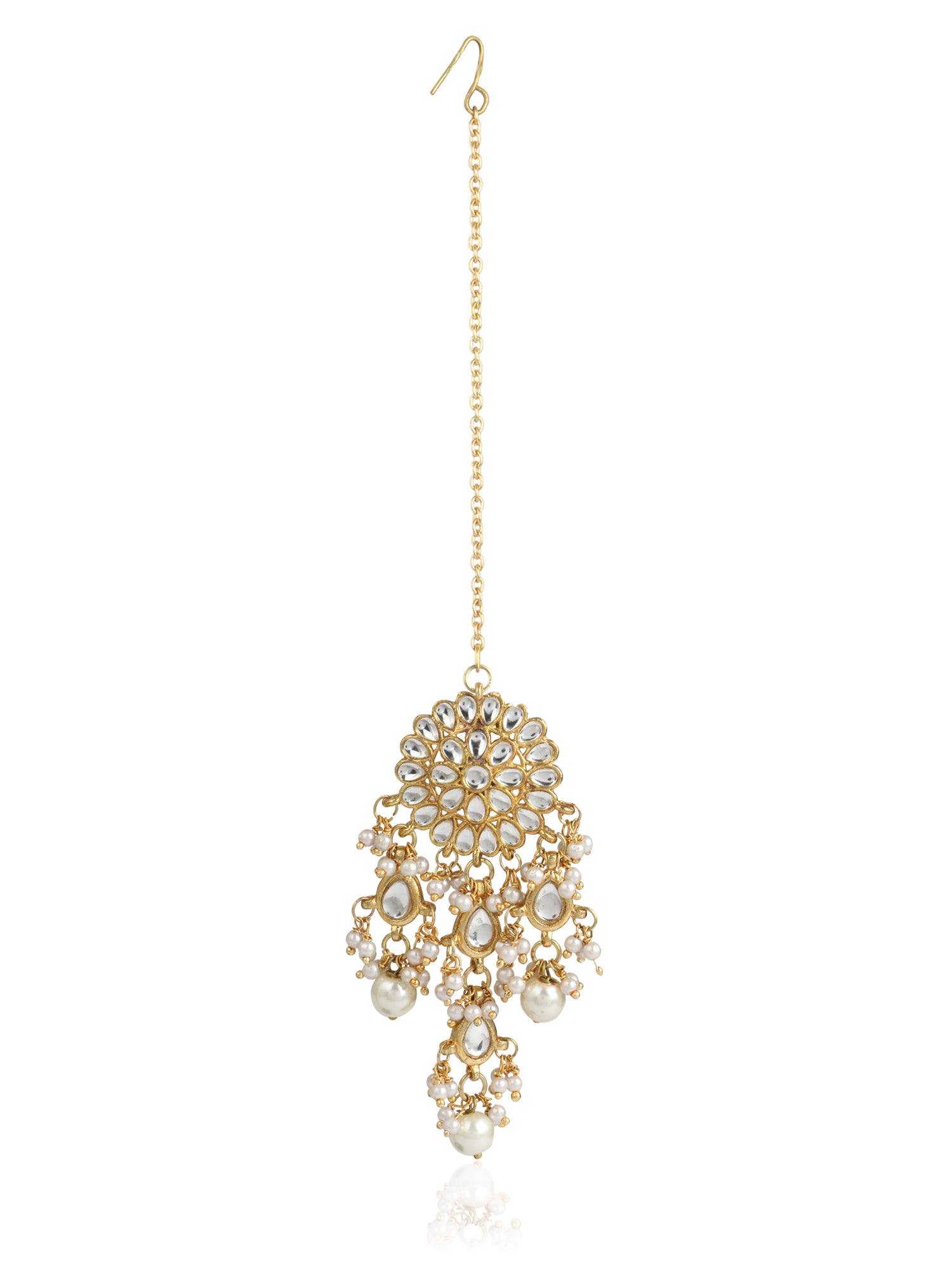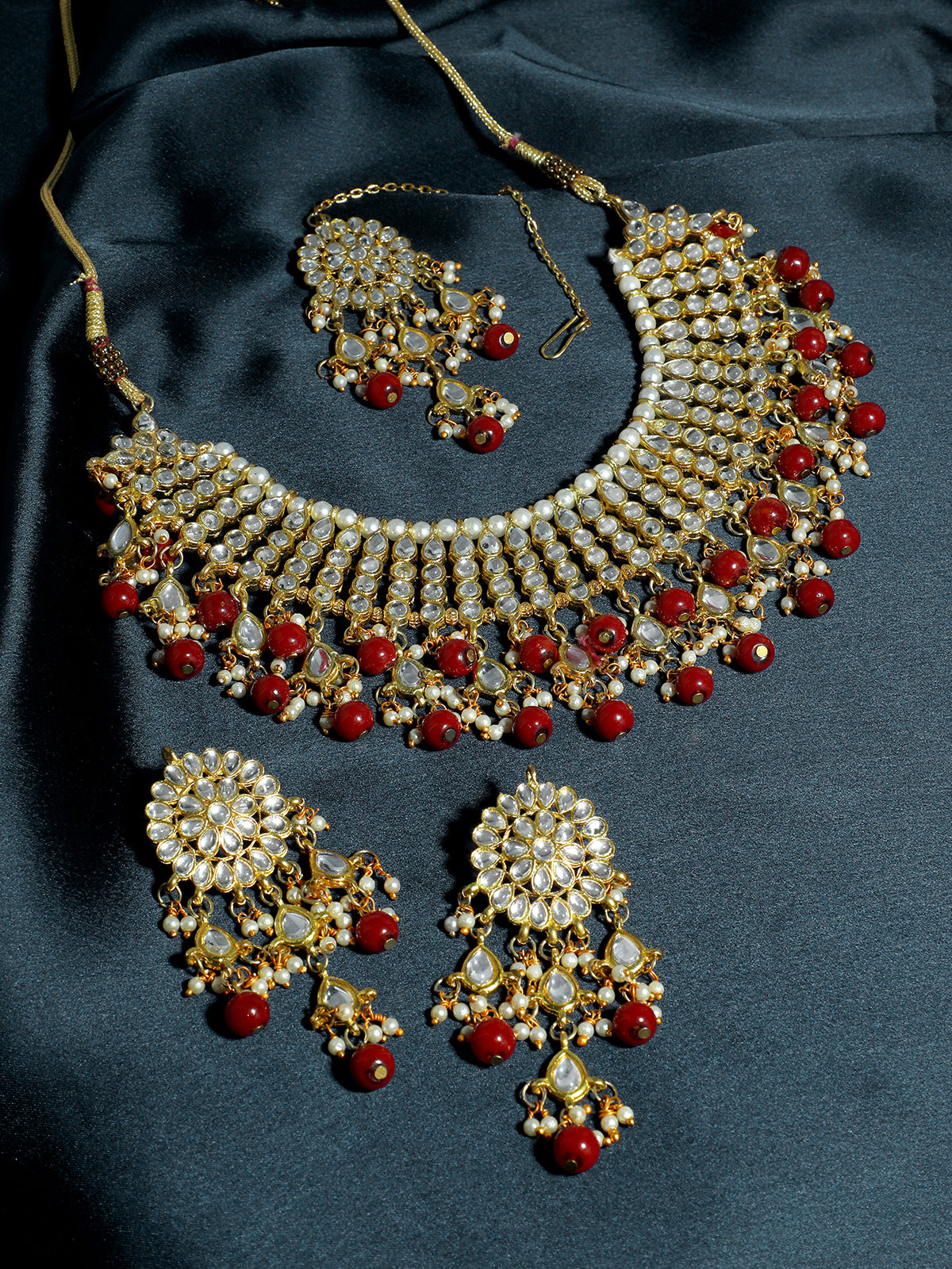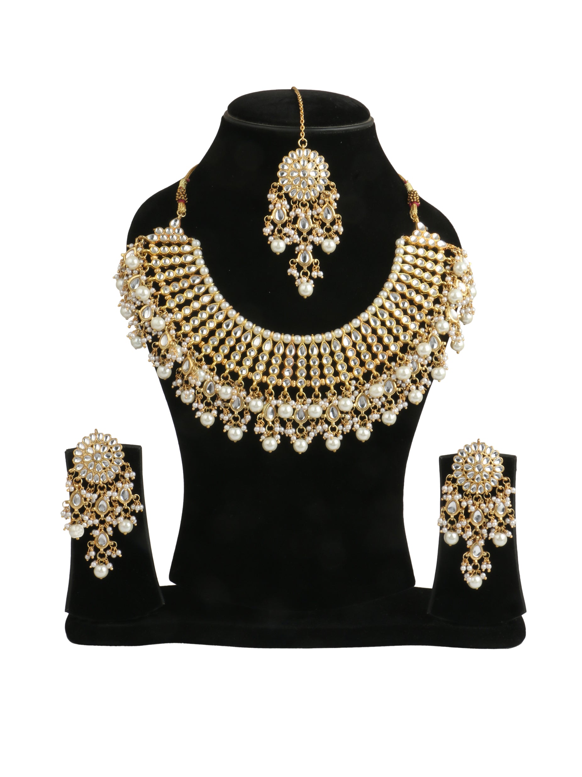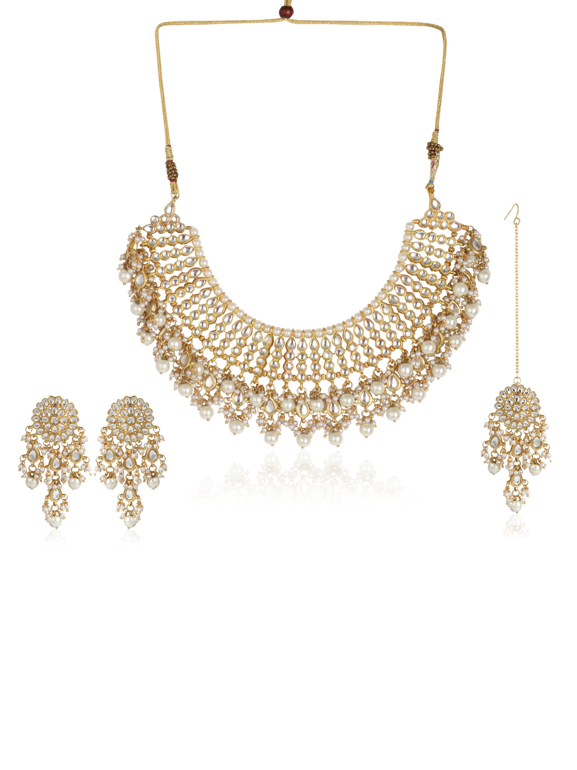 A beautiful round shaped necklace embellished with pearls and faux Kundan stones. Comes with a pair of earrings and Maangtikka. Perfect for any wedding attire or an engagement party.