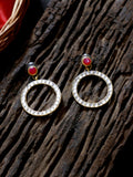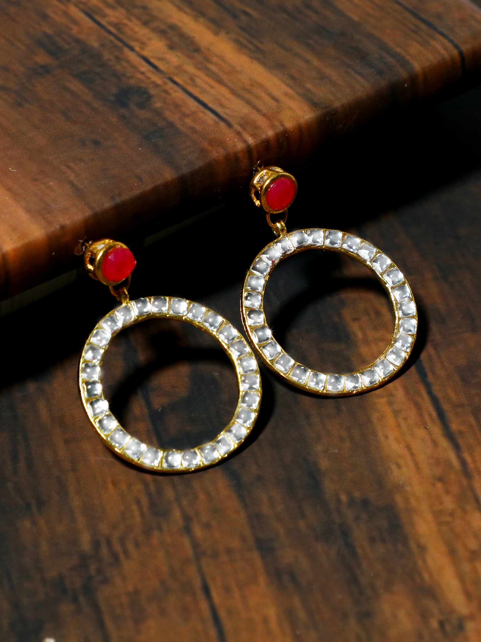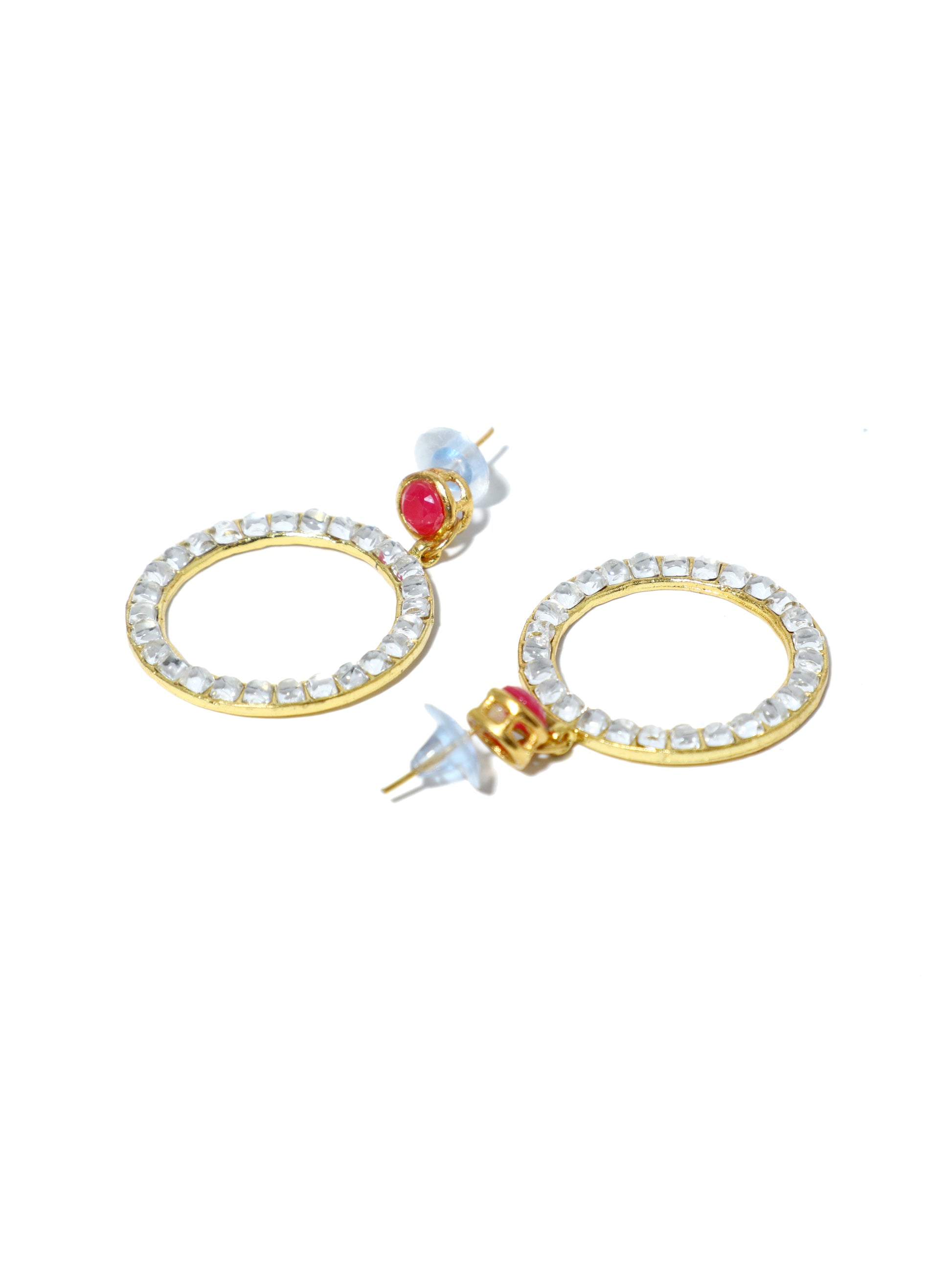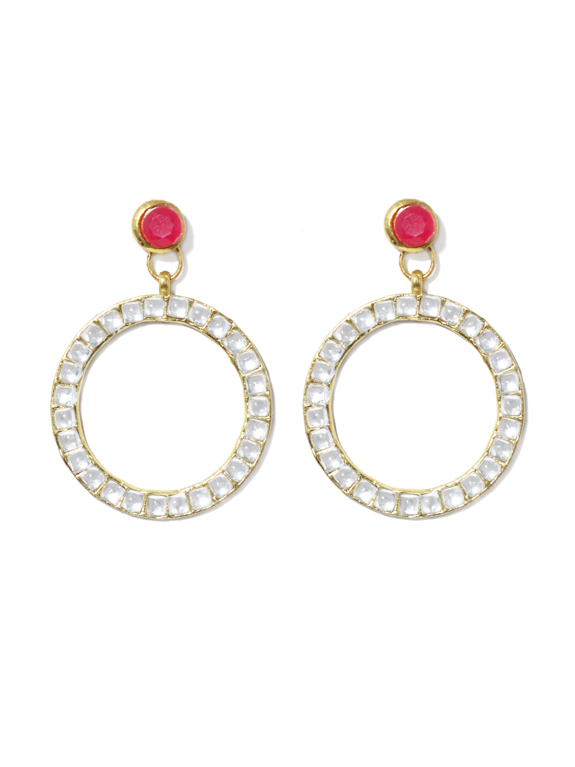 - Gold-Tone Kundan Hoop Earrings with Embedded Fuchsia Stone. This set of earrings can be best paired with Indian or Indo-Western Attire. Made with Internationally approved skin-friendly material