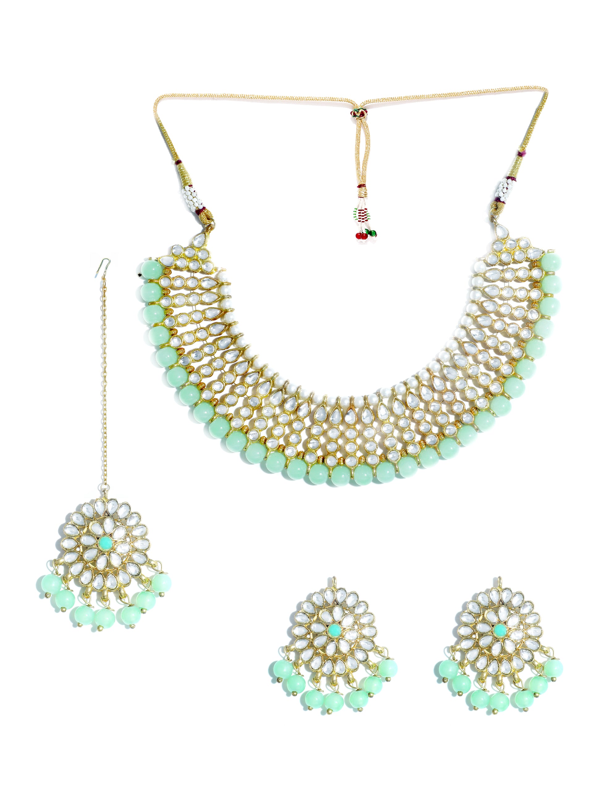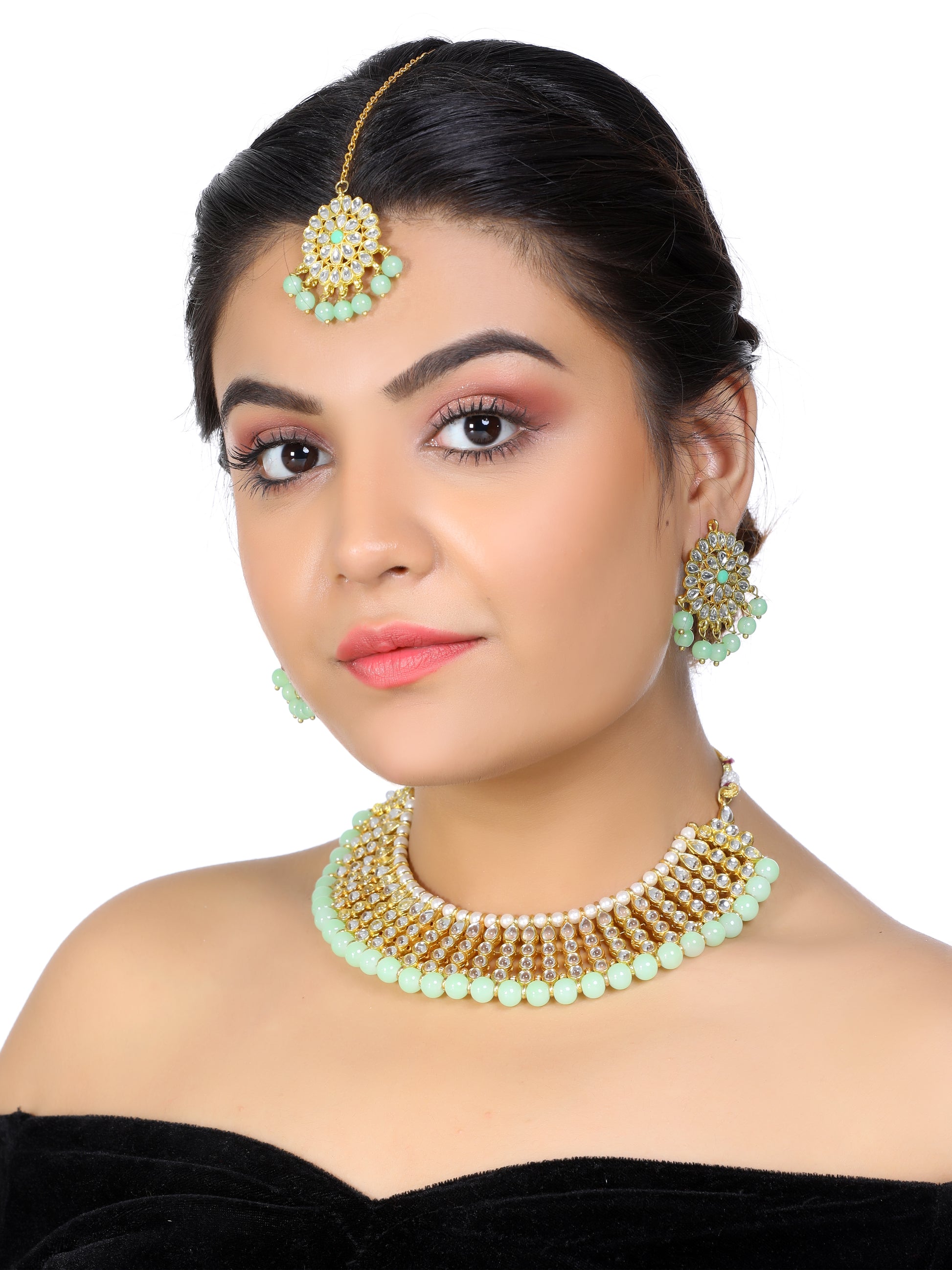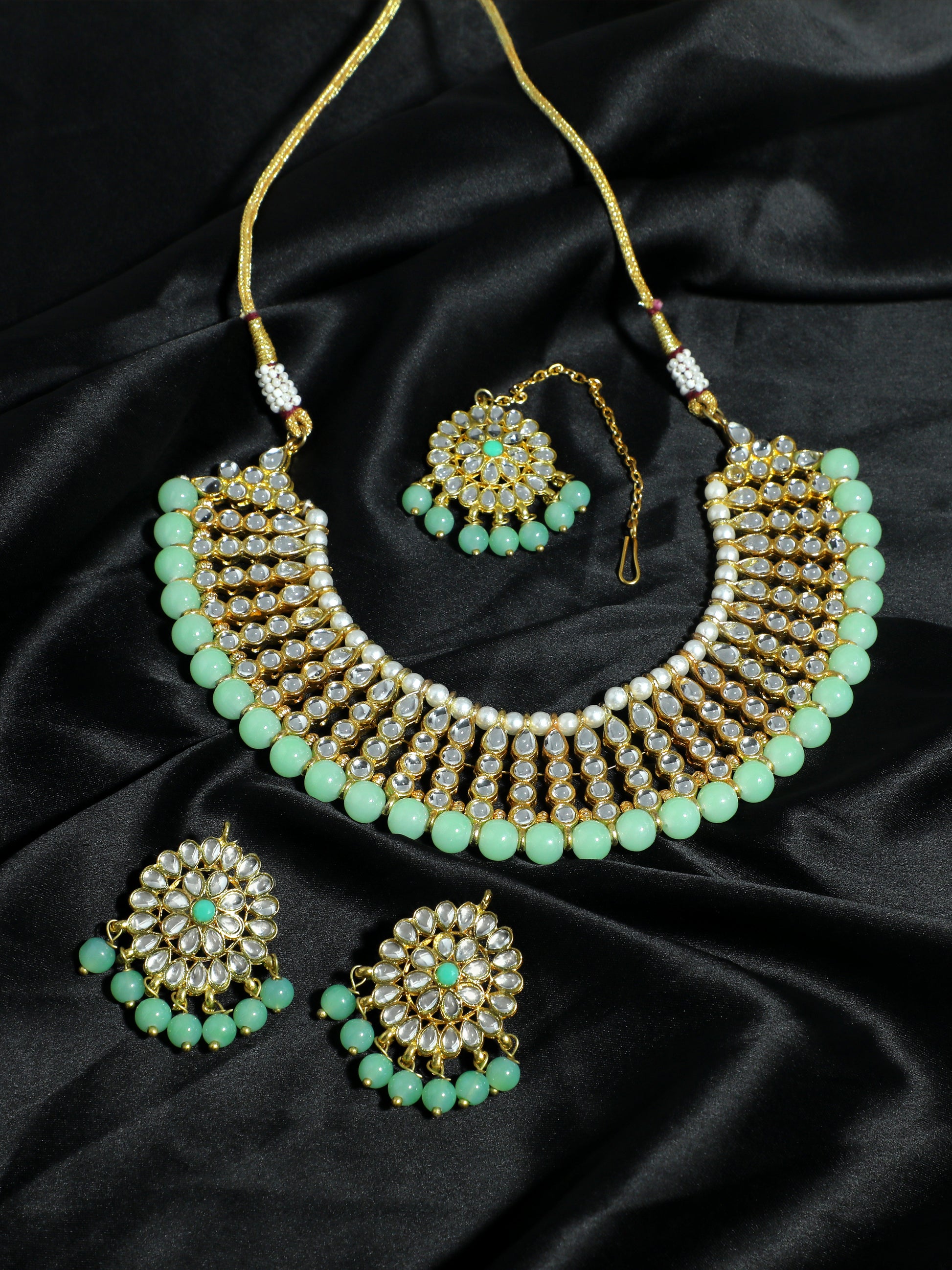 - Gold and Silver Tone Faux Kundan Lime Green Necklace Set. This simple and evergreen style is perfect to pair with any Indian Attire. Made with Internationally approved skin friendly material