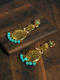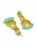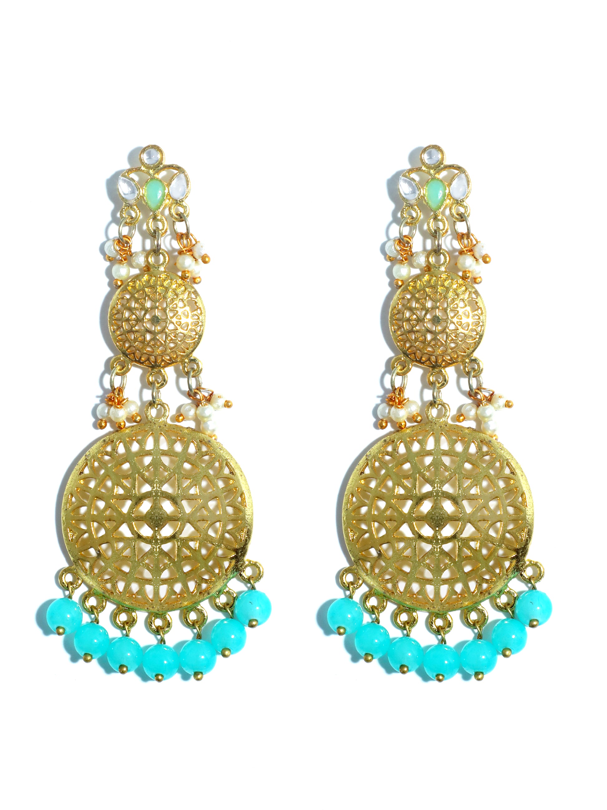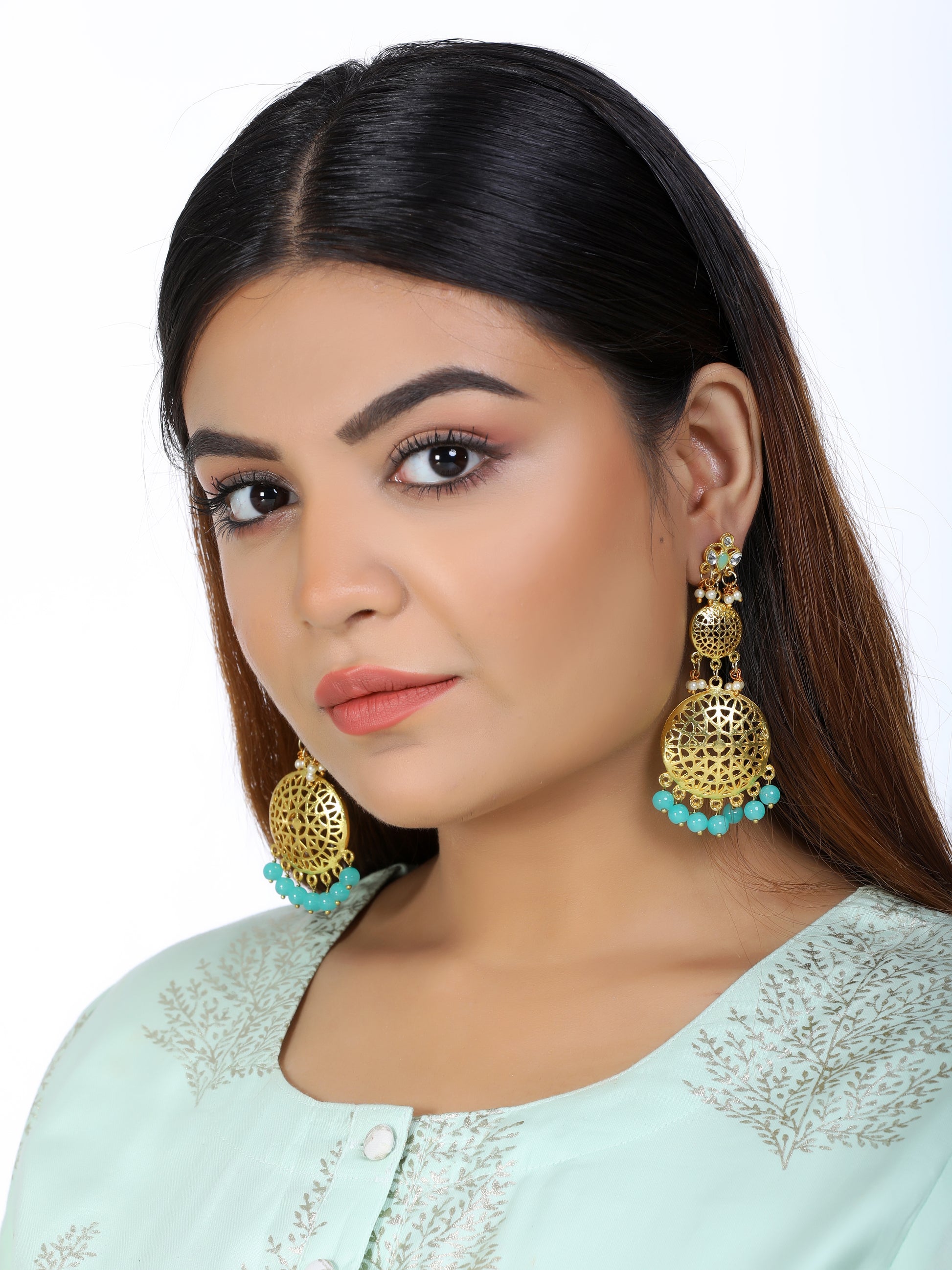 - Gold Tone Faux Kundan Mint Blue Drops Earrings. This set of earrings can be best paired with Indian or Indo-Western Attire. Made with Internationally approved skin friendly material