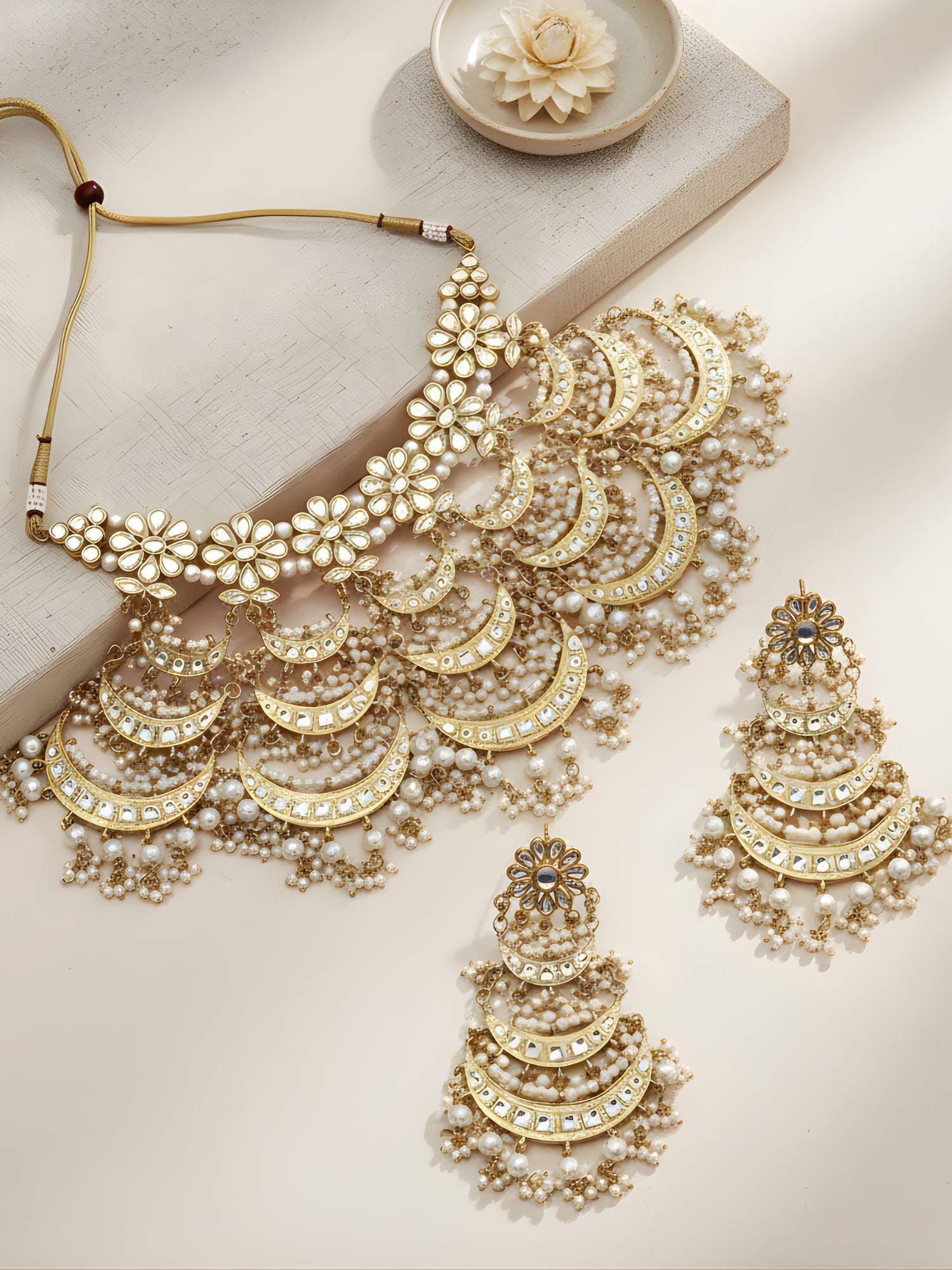 - Complete your Bridal Look and Enhance that Beautiful Bridal Lehenga with our Signature Bridal Set. This Trendy Pearl Beads Kundan Gold Plated Choker Necklace comes with Earrings. Our products are designed with high-quality Kundan Stones and these products are enhanced with plating that is skin-friendly & with love to reach your heart.