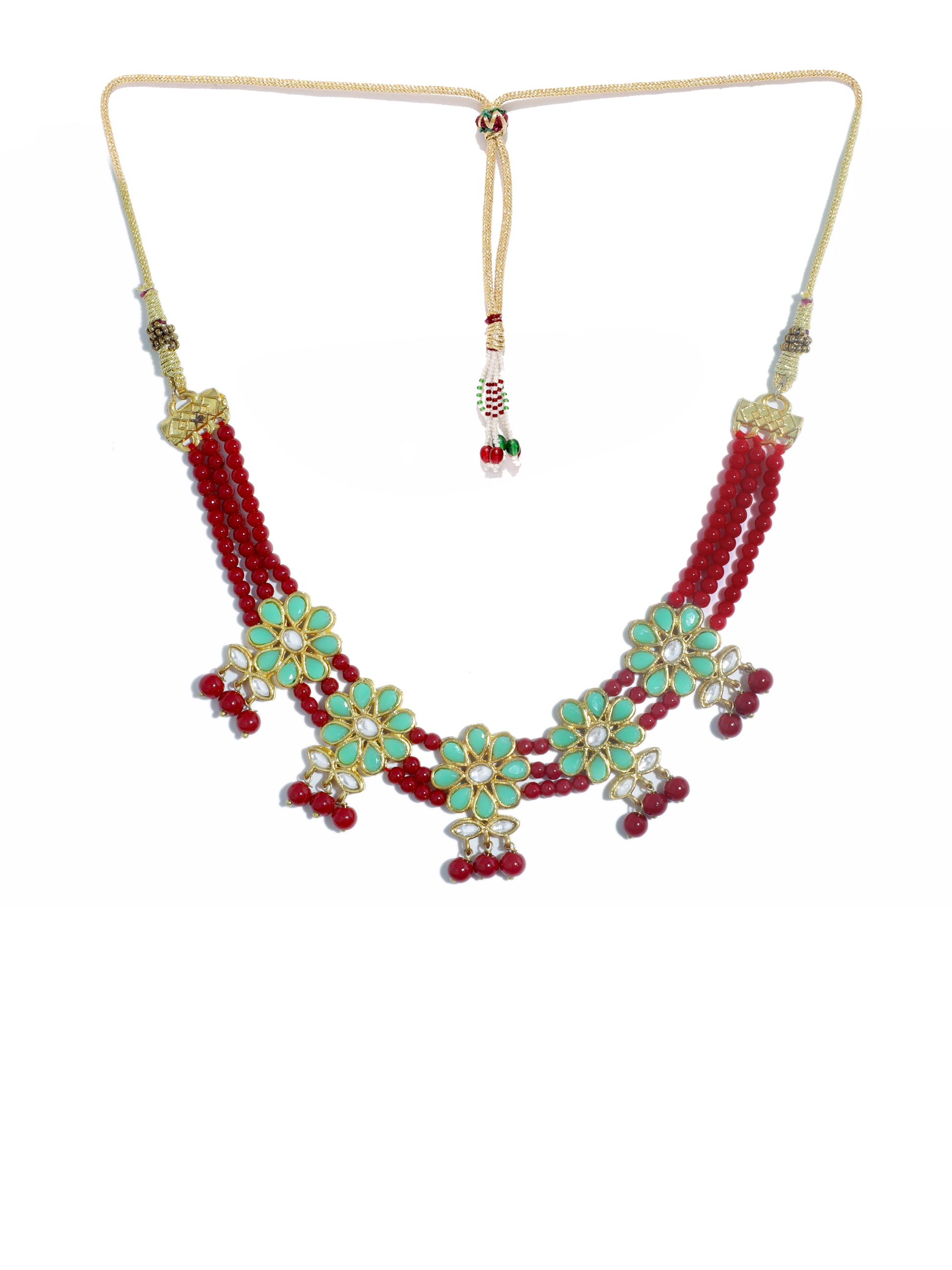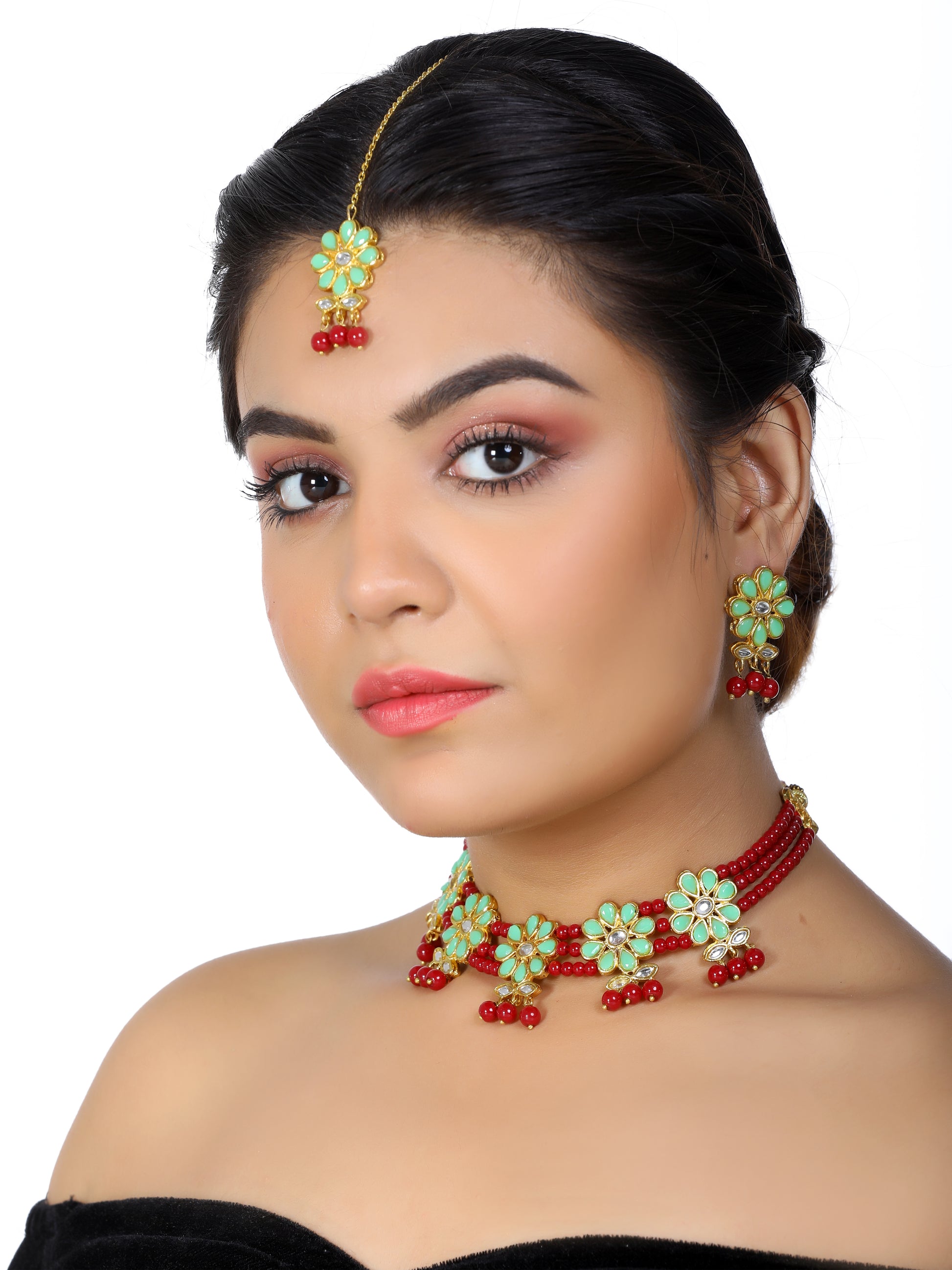 - Gold Tone Faux Kundan Red with Mint Green Beaded Choker Necklace Set. This beautiful necklace can be paired with any Indian or Indo-Western Attire. Made with Internationally approved skin friendly material