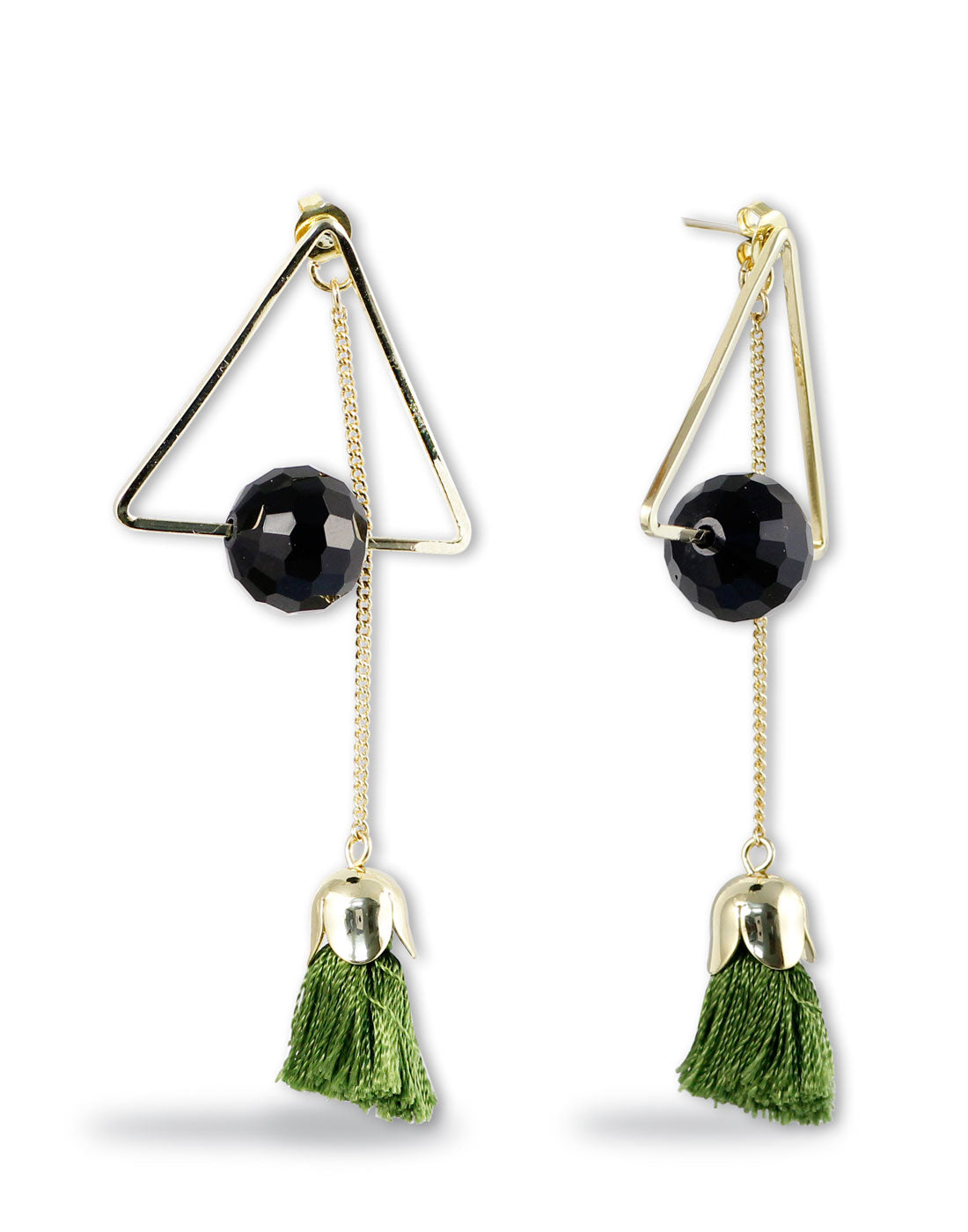 Metal Gold Geometrical Earrings adorned with green thread tassels