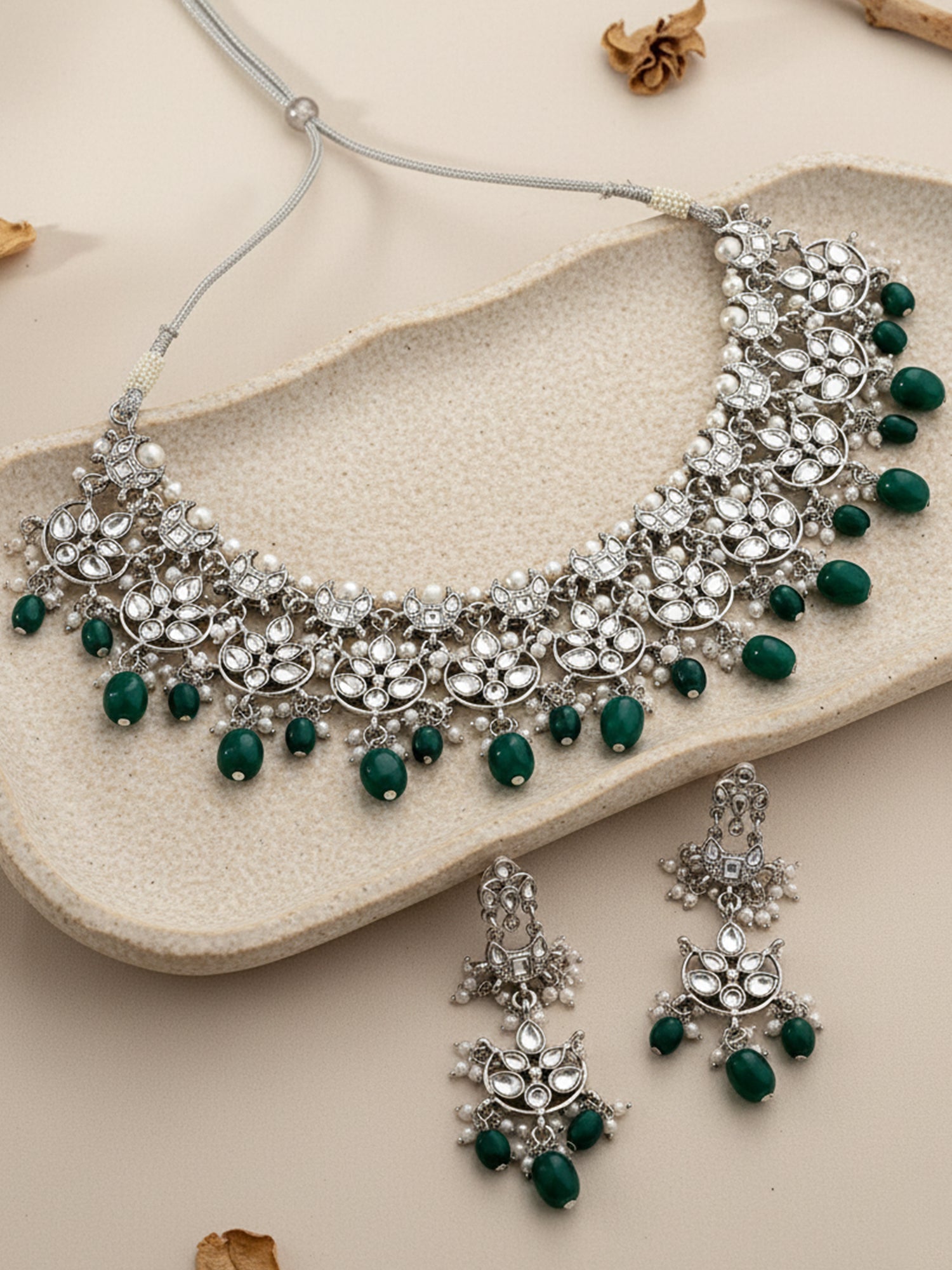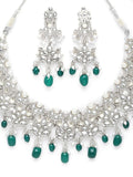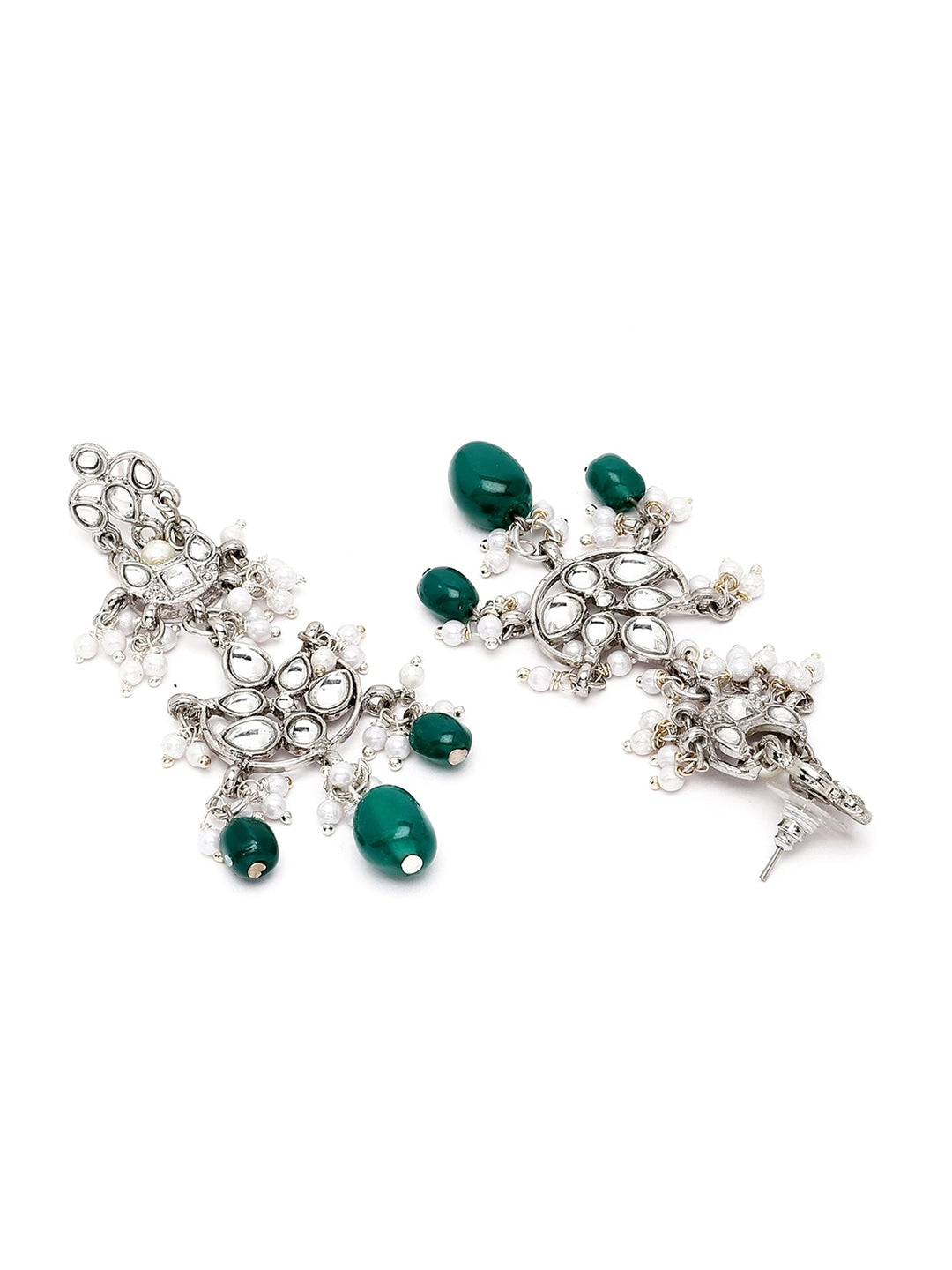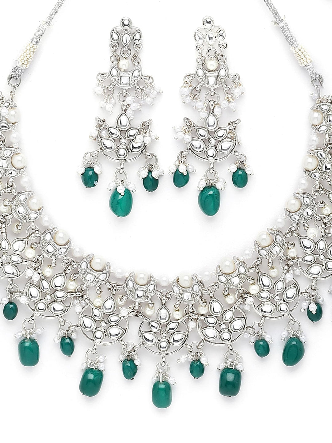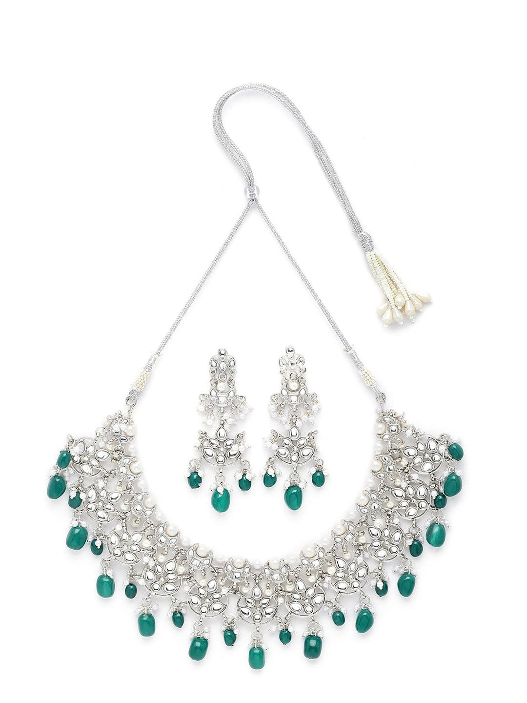 Silver-Plated Green Beaded Kundan Studded Jewellery Set