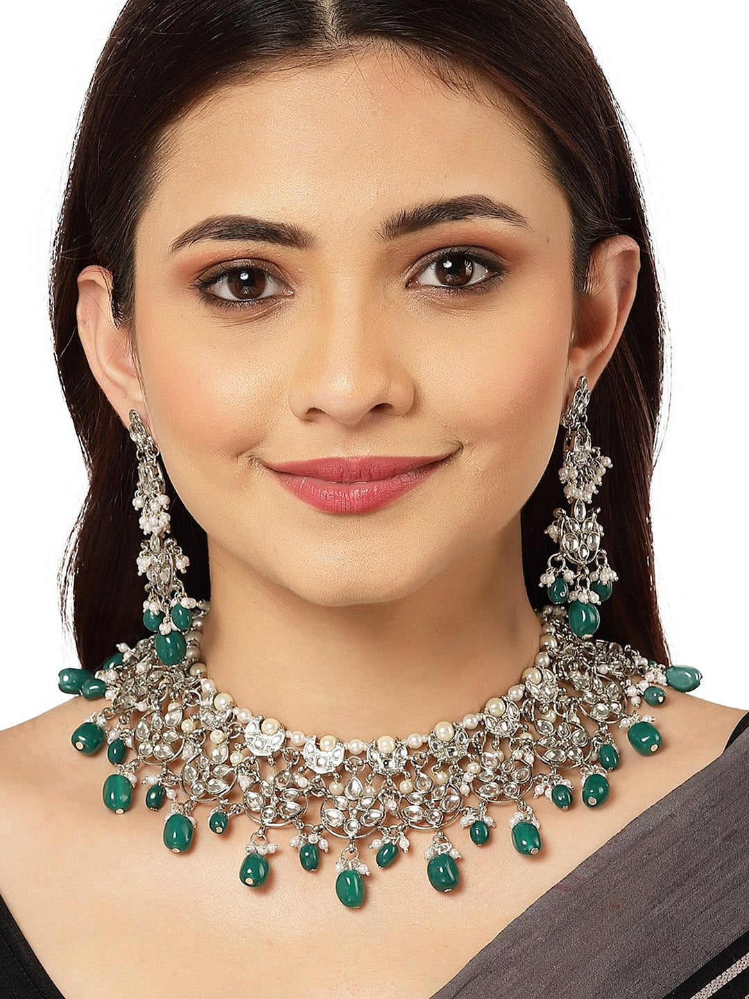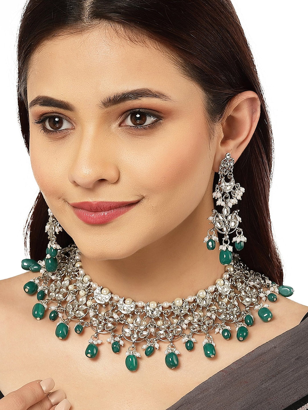 Silver-plated chocker necklace green beaded Kundan-studded and details