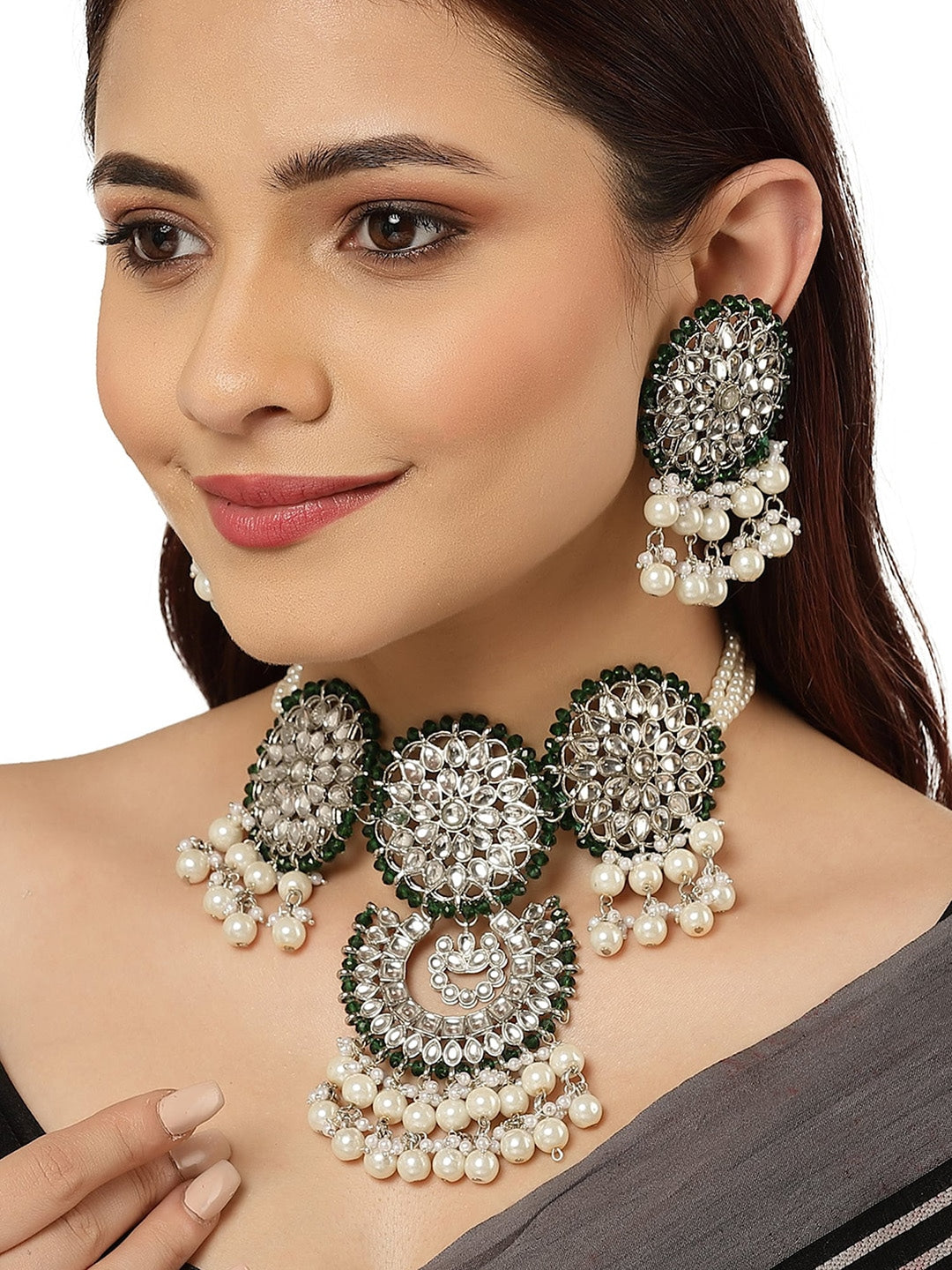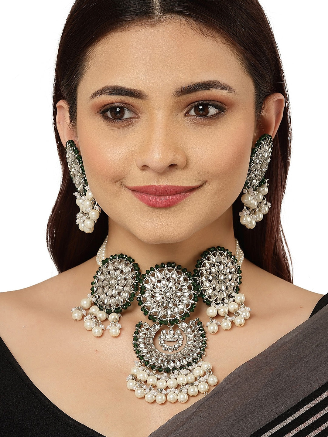Silver-plated oxidized Silver and Green Crystal Kundan studded Choker necklace, secured with a drawstring closure
