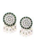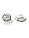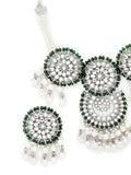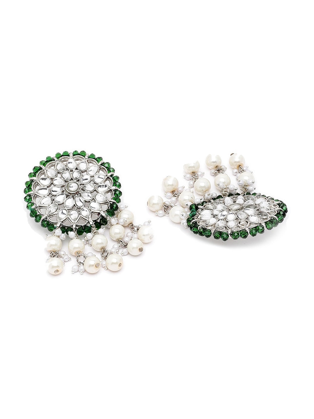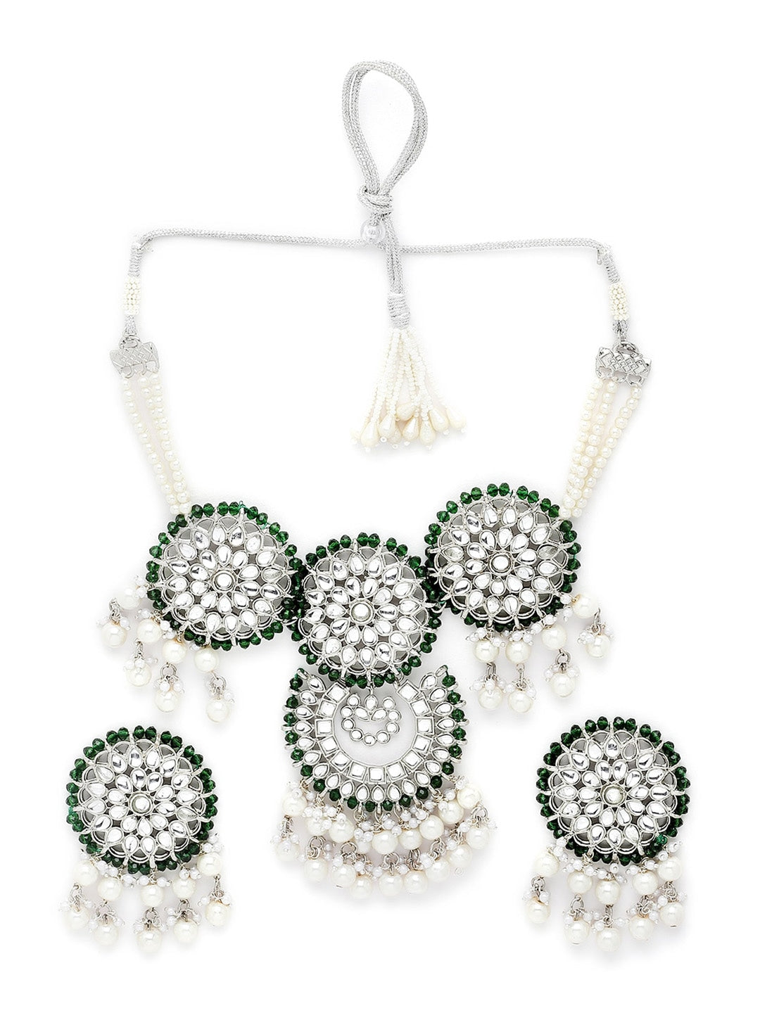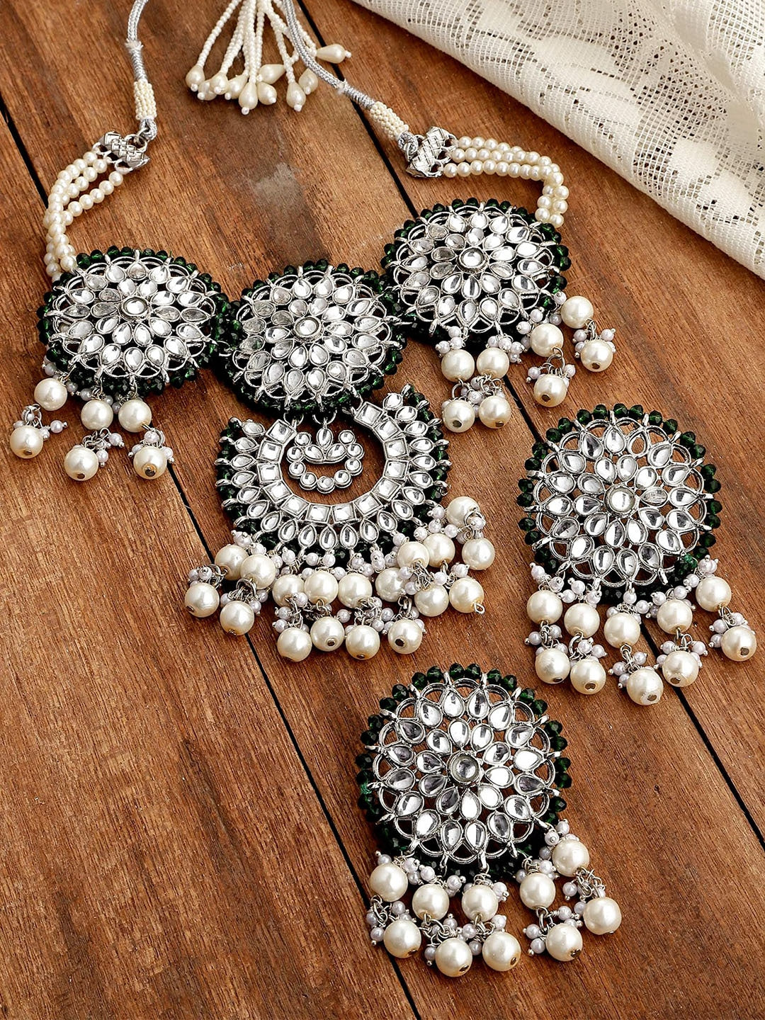 Silver-Plated Oxidised Silver & Green Kundan Studded Jewellery Set