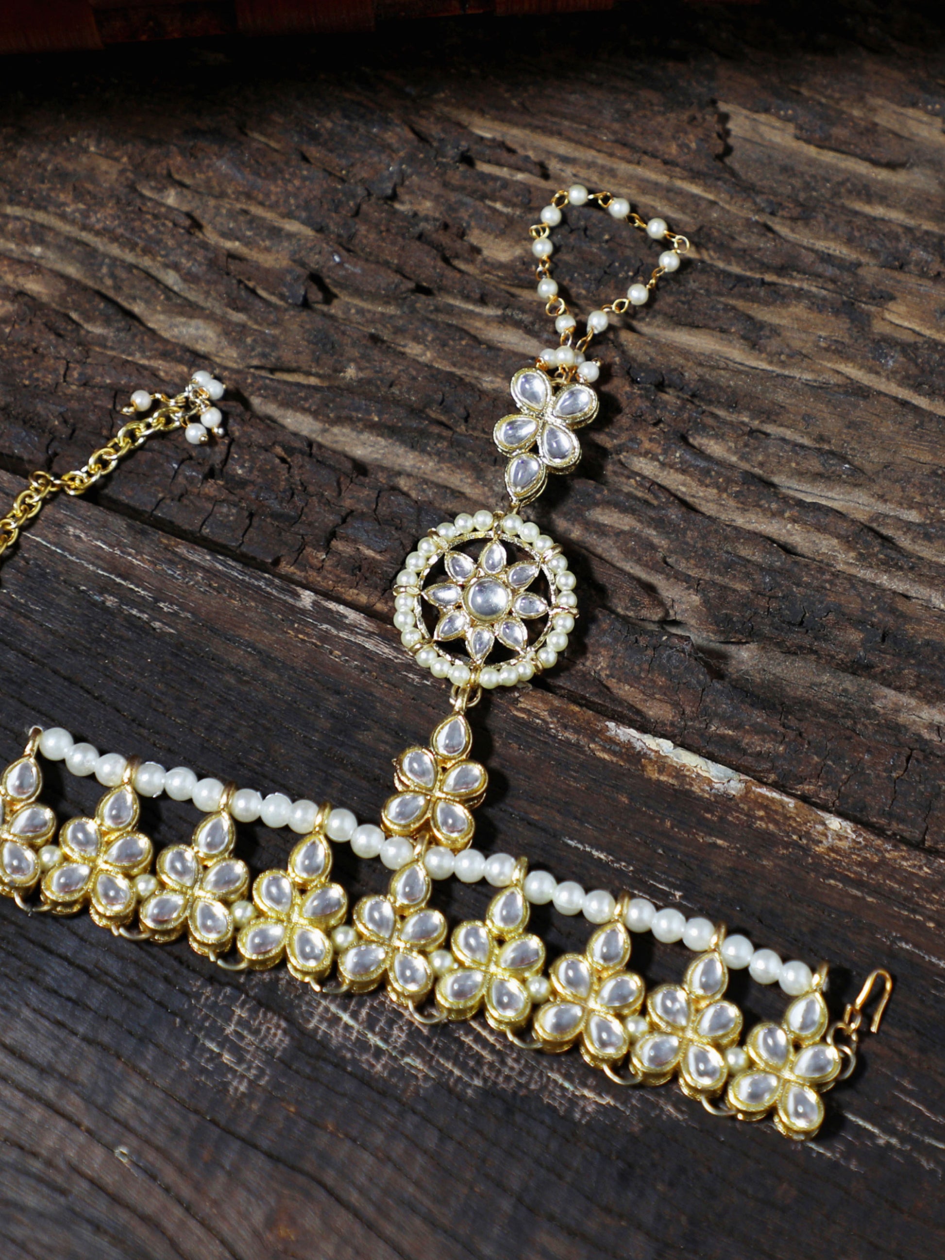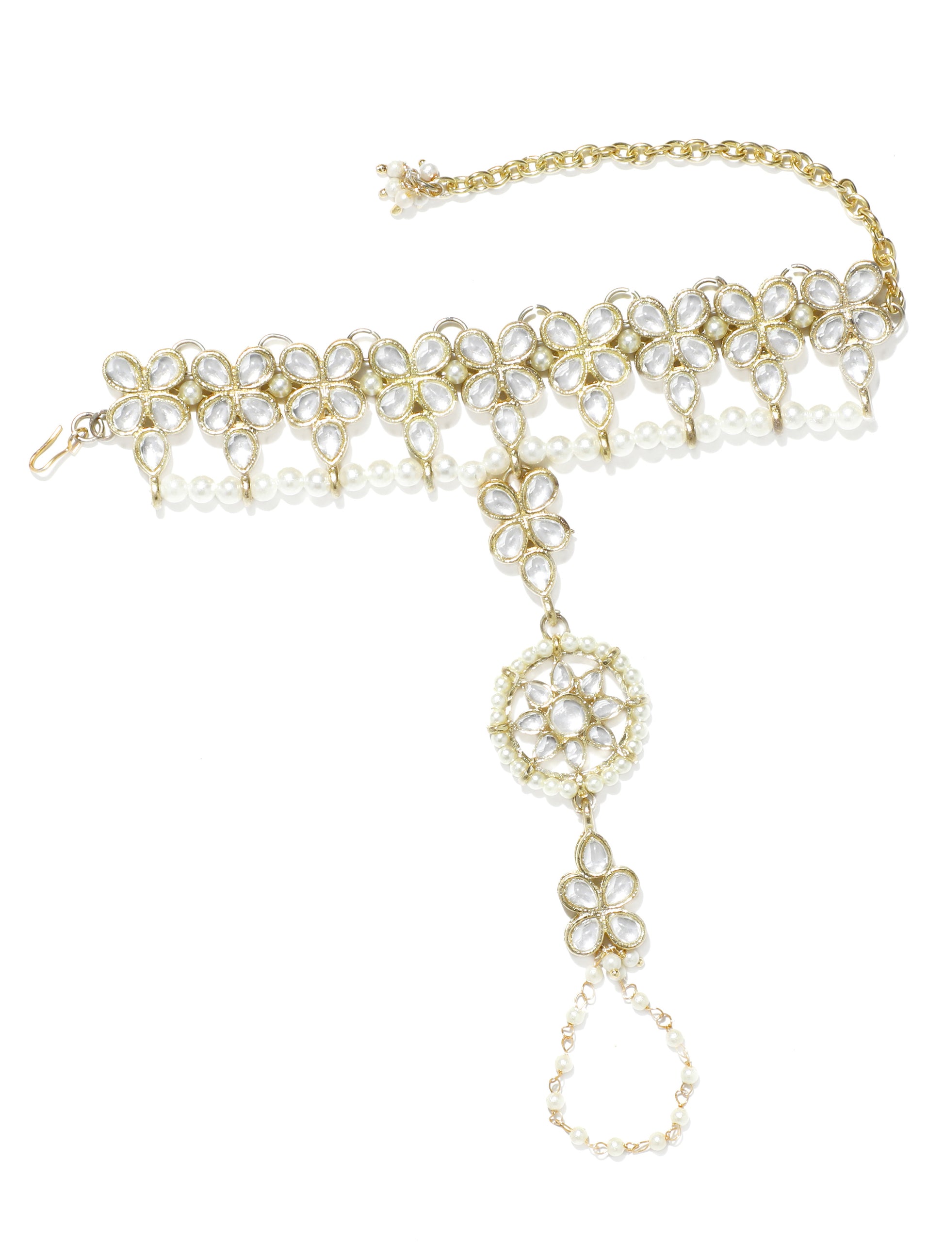 - Stylish Gold-Plated Kundan Pearl Chain Hathphool for Woman. It's Five Layer Micro Gold Plated and Embellished with Kundan for High Durability. Intricate high polish creates glamorous reflections and adds a luxurious look. Perfect for Weddings, Festivals, Traditional Occasions. Best when paired with any Indian outfit.