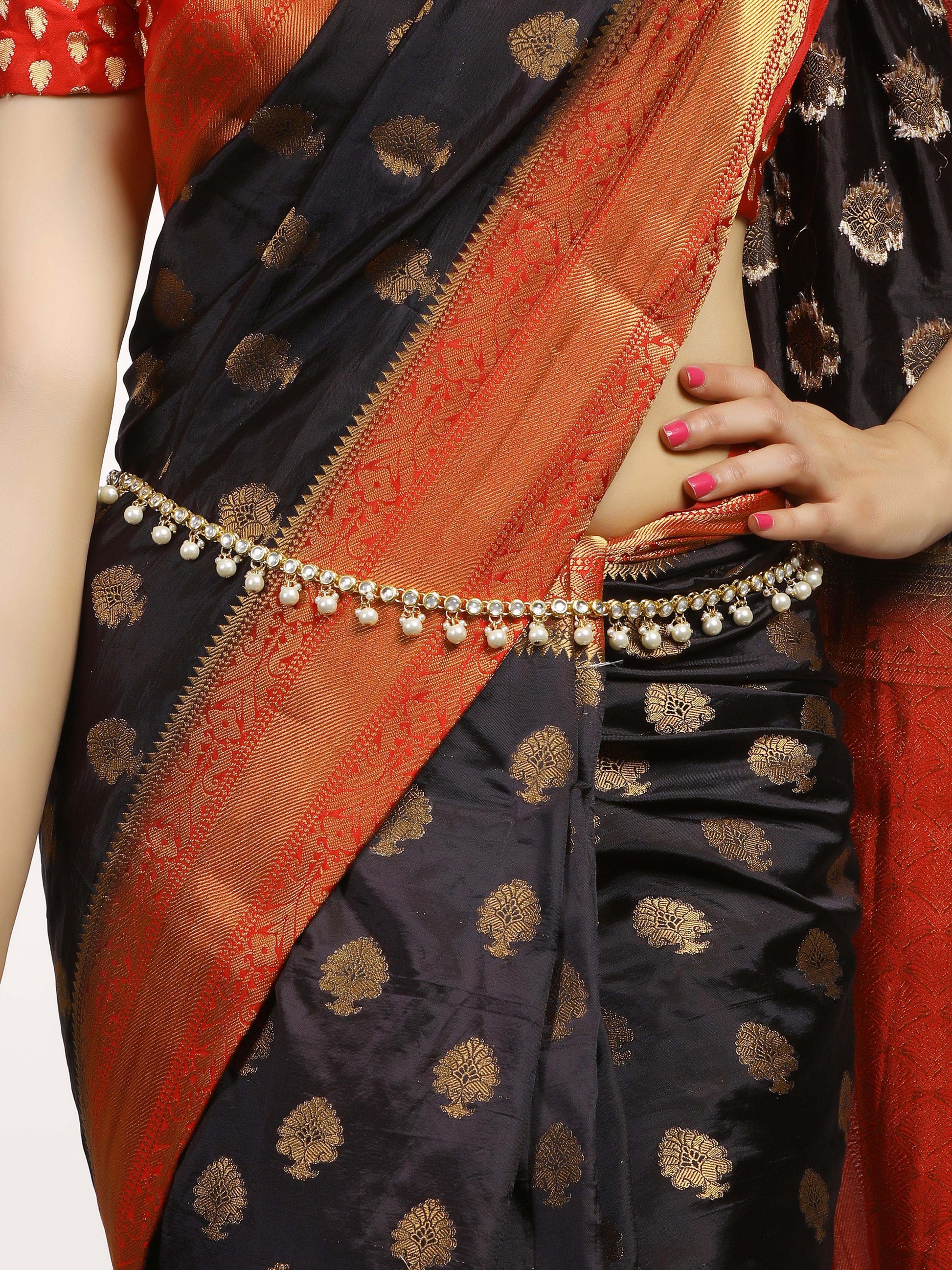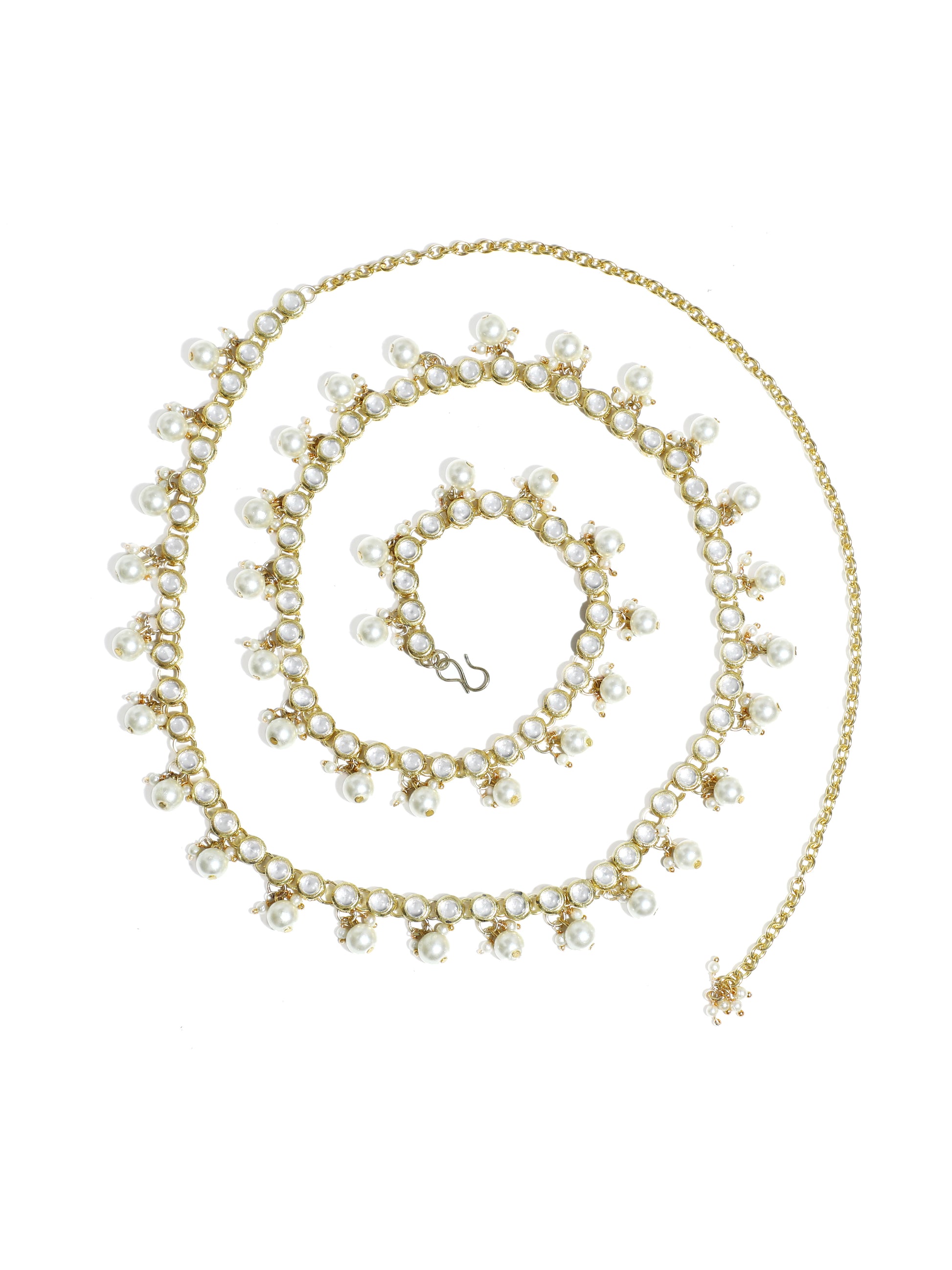 - Gold-Plated Kundan and Pearl Studded Handcrafted Kamarband. It's Five Layer Micro Gold Plated and Embellished with Kundan for High Durability. Intricate high polish creates glamorous reflections and adds a luxurious look. Perfect for Weddings, Festivals, Traditional Occasions. Best when paired with any Indian outfit.