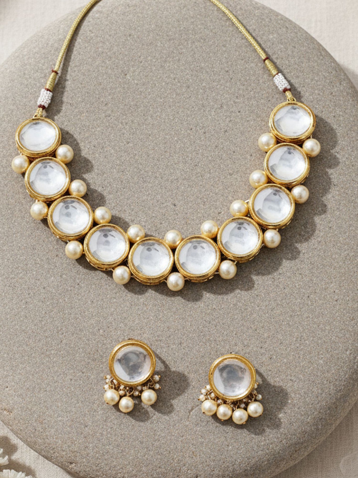 - Traditional Gold Plated Pearl Beads Polki Kundan Choker Necklace with Earrings for Women. It's Five Layer Micro Gold Plated and Embellished with Elegant Kundan for High Durability. Intricate high polish creates glamorous reflections and adds a luxurious look. Perfect for Weddings, Festivals, Traditional Occasions. Best when paired with any Indian outfit.