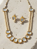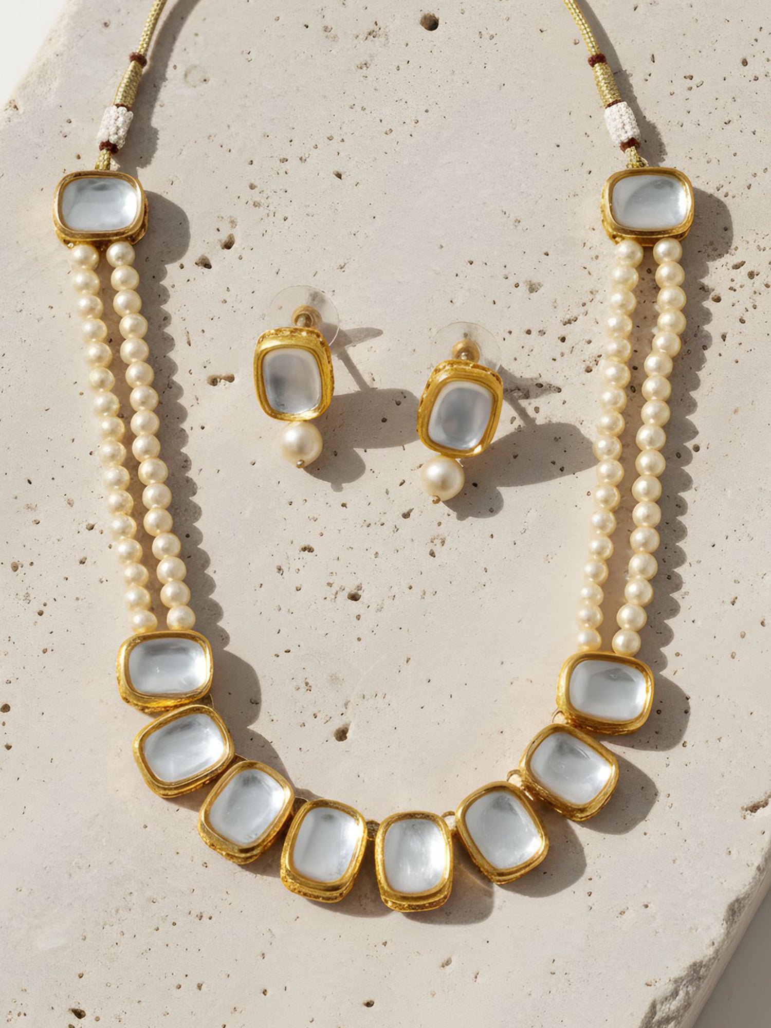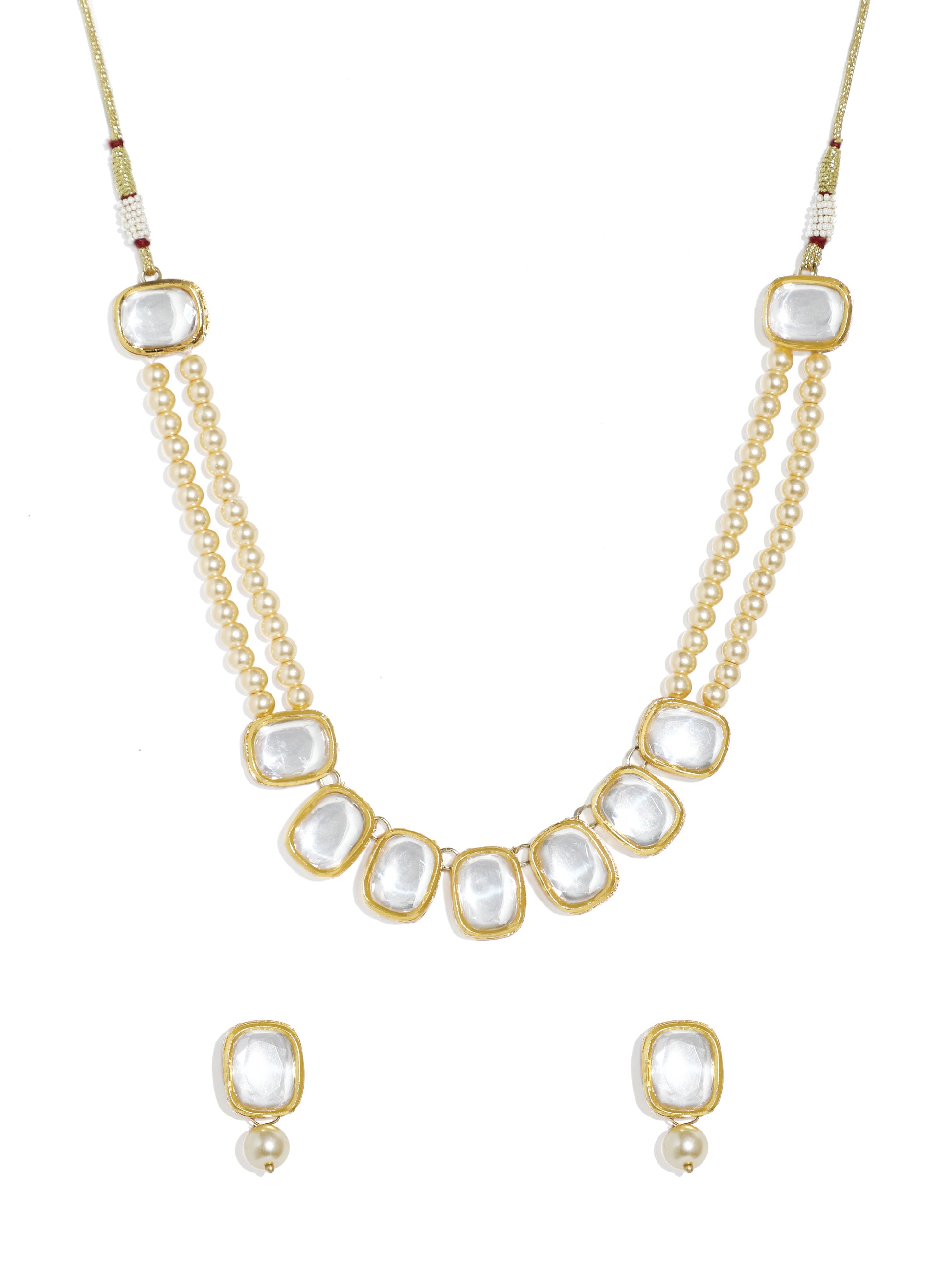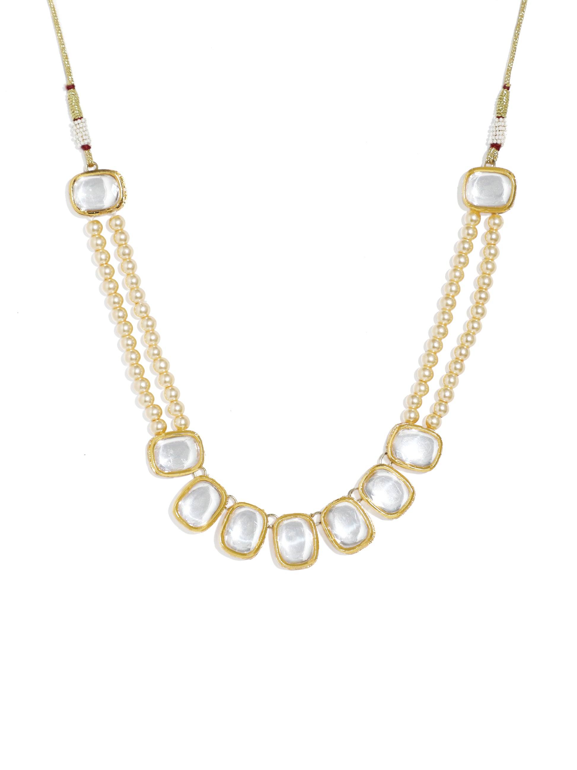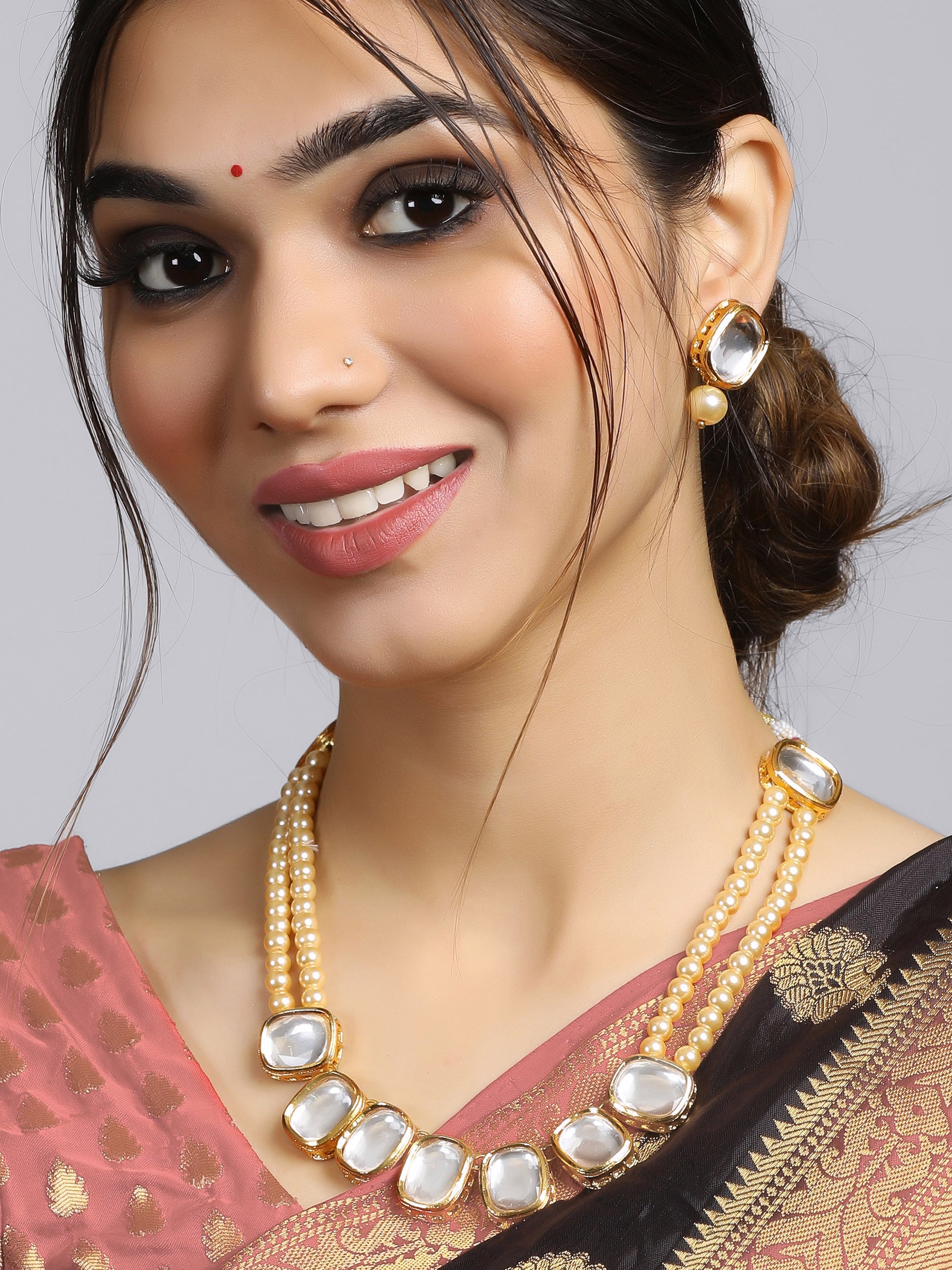 - Traditional Gold Plated Pearl Beads Polki Kundan Necklace with Earrings for Women. It's Five Layer Micro Gold Plated and Embellished with Elegant Kundan for High Durability. Intricate high polish creates glamorous reflections and adds a luxurious look. Perfect for Weddings, Festivals, Traditional Occasions. Best when paired with any Indian outfit.