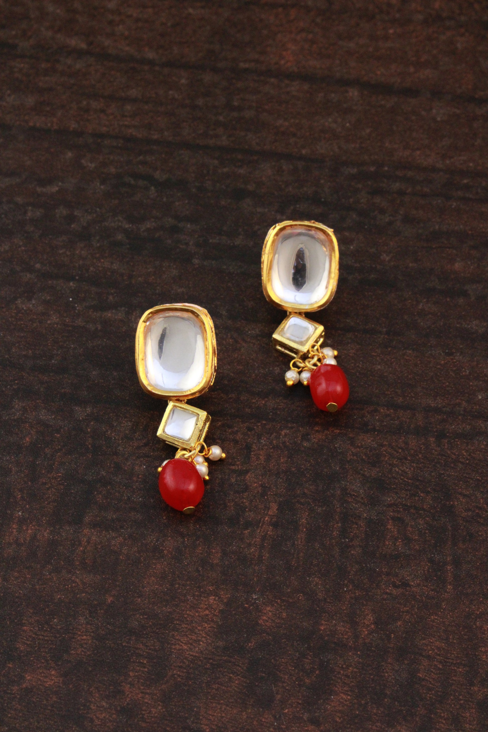 - Traditional Gold Plated Polki Kundan Dangler Earrings with Red Beads for Women. It's Five Layer Micro Gold Plated for High Durability. Intricate high polish creates glamorous reflections and adds a luxurious look. Perfect for Weddings, Festivals, Traditional Occasions. Best when paired with any Indian outfit.