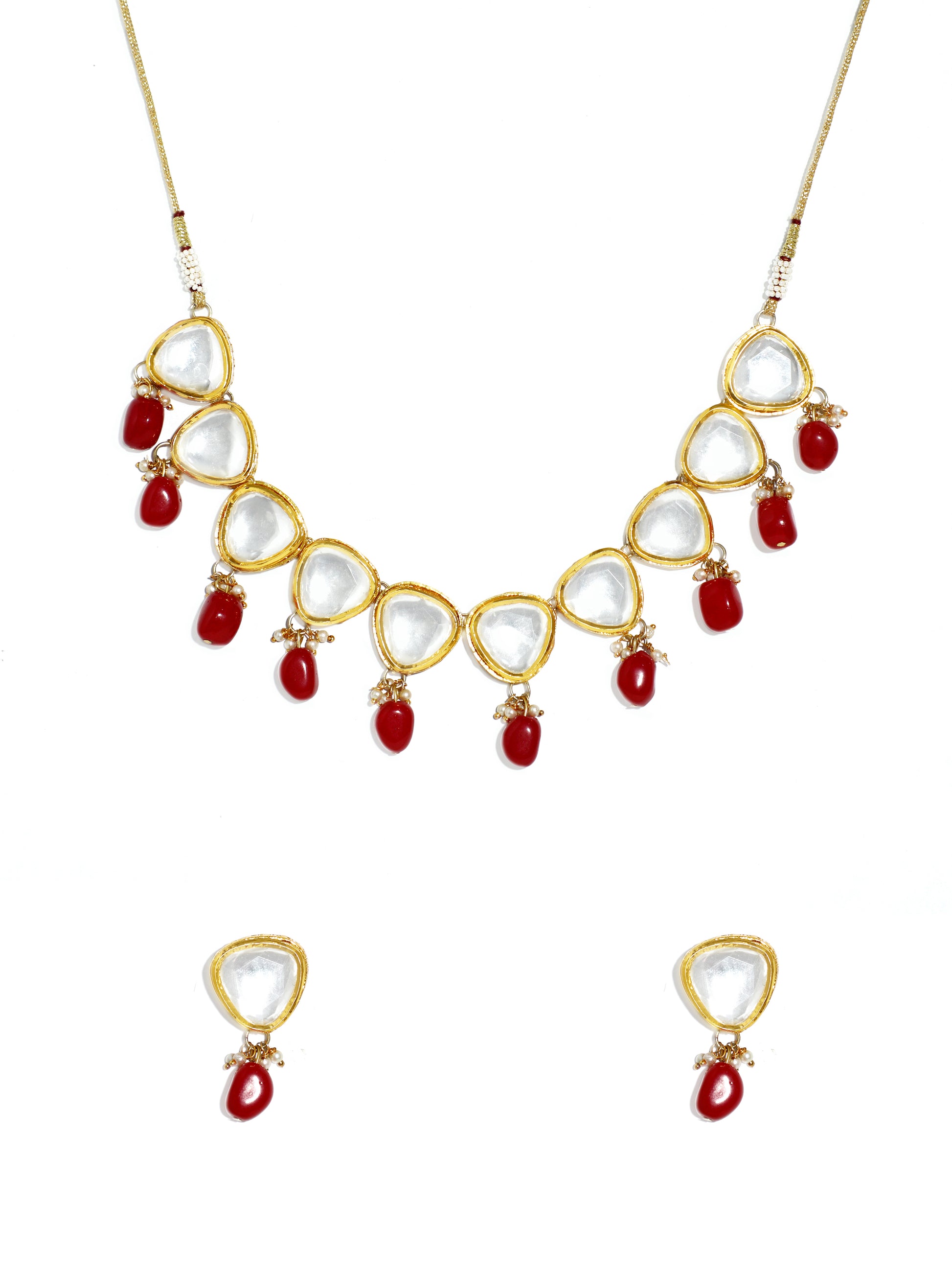 - Traditional Gold Plated Red Beads Polki Kundan Necklace with Earrings for Women. It's Five Layer Micro Gold Plated for High Durability. Intricate high polish creates glamorous reflections and adds a luxurious look. Perfect for Weddings, Festivals, Traditional Occasions. Best when paired with any Indian outfit.