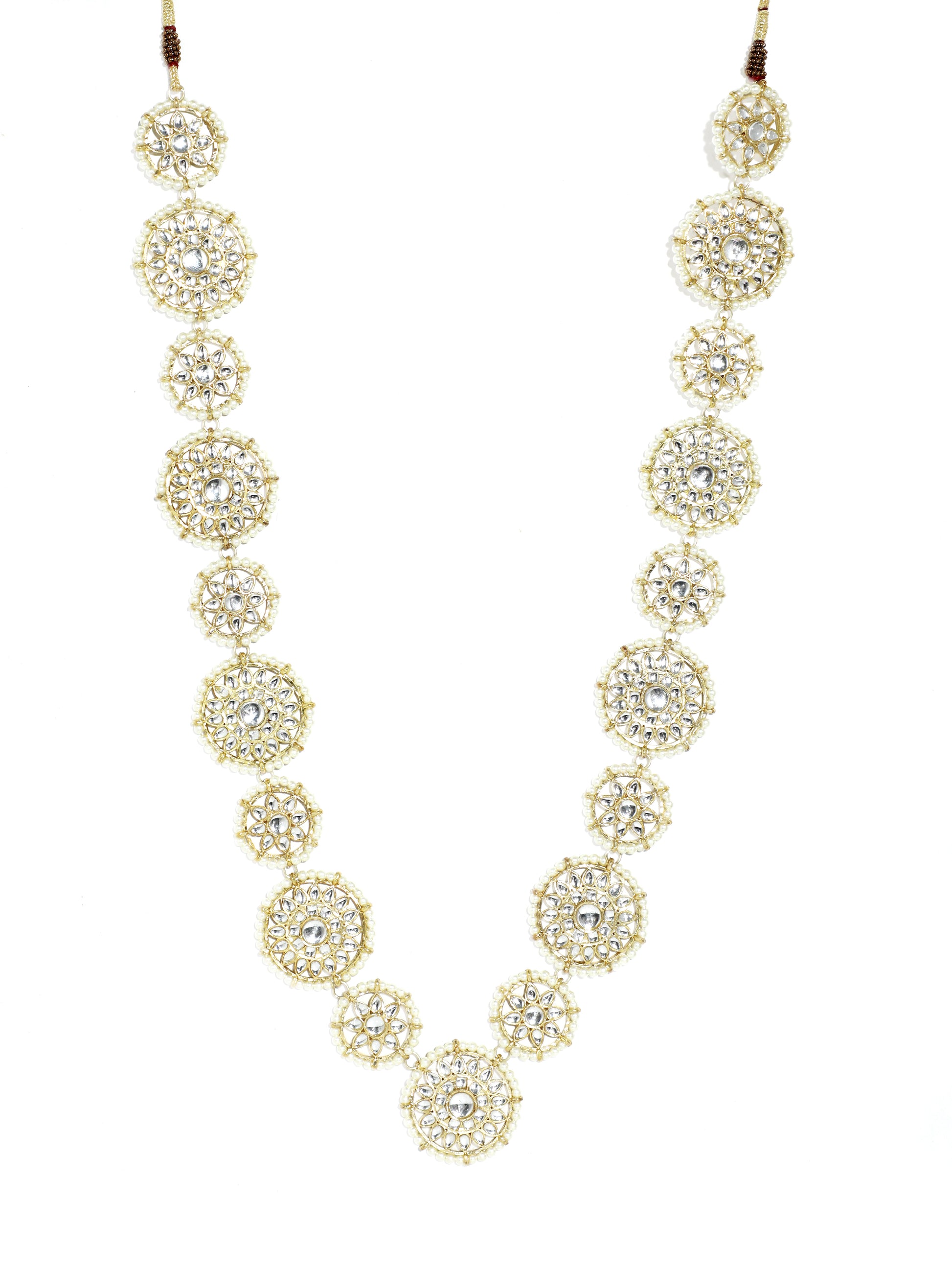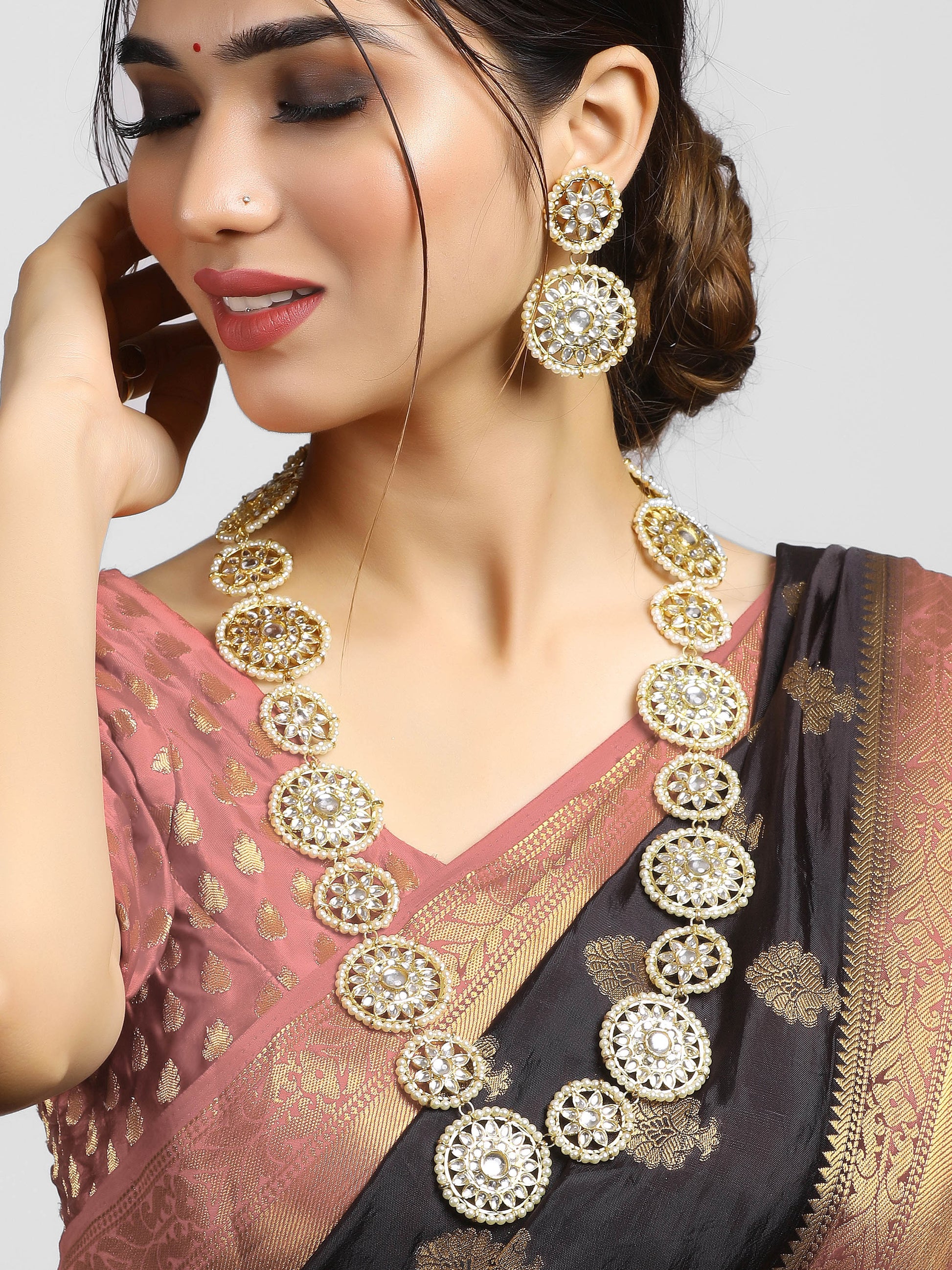 - Traditional Gold-Toned Kundan Rani Haar Necklace Set. It's Five Layer Micro Gold Plated and Embellished with Elegant Kundan for High Durability. Intricate high polish creates glamorous reflections and adds a luxurious look. Perfect for Weddings, Festivals, Traditional Occasions. Best when paired with any Indian outfit.