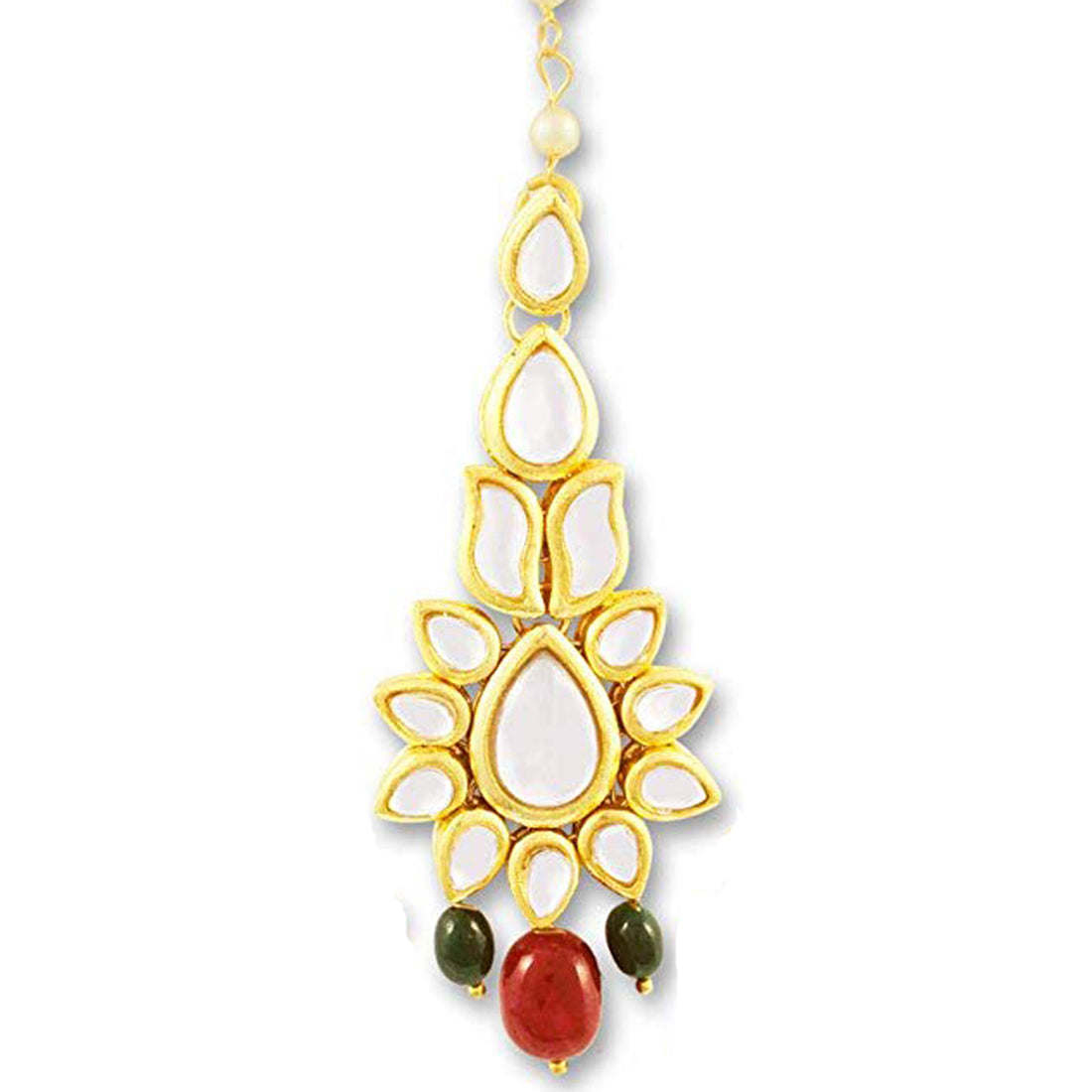 Traditional Gold Plated Green and Red Beads Kundan Maangtikka For Women