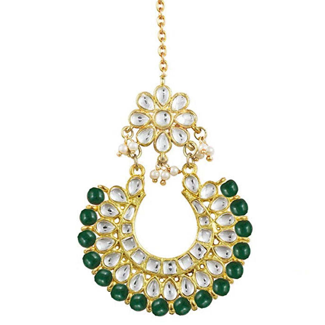 - Glam up the look with this trendy Maangtikka. It's embellished with Kundan and Green beads. Perfect for Weddings, Festivals, Traditional Occasions. Best when paired with any Indian outfit.