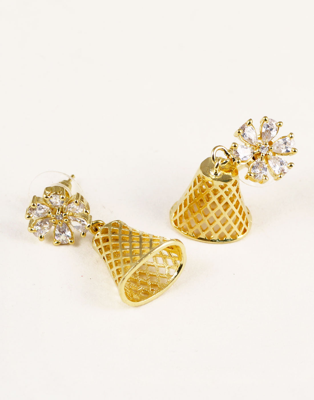 Make your look traditional and classy with this beautiful pair of jhumkis. These jhumkis feature sheeny gold tone and flamboyant adornment of white stones. These will elegantly go well with any of your ethnic attire.