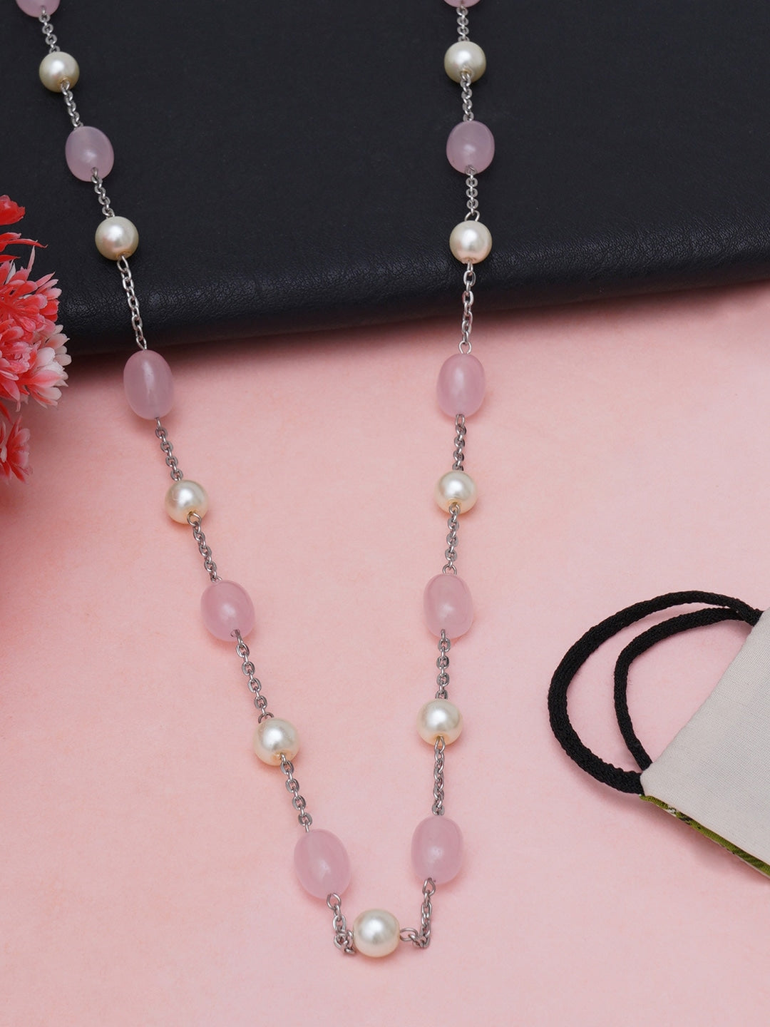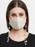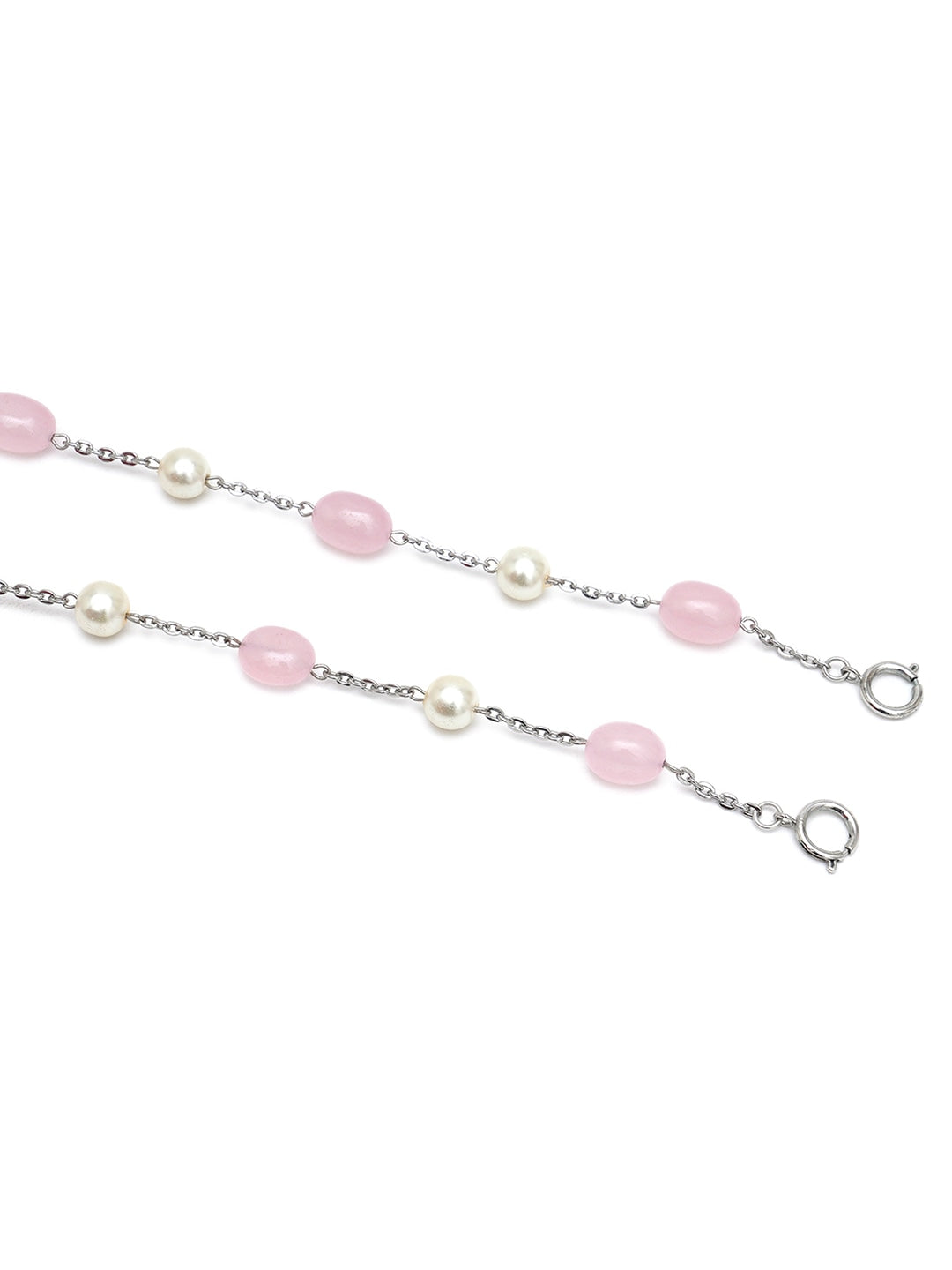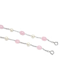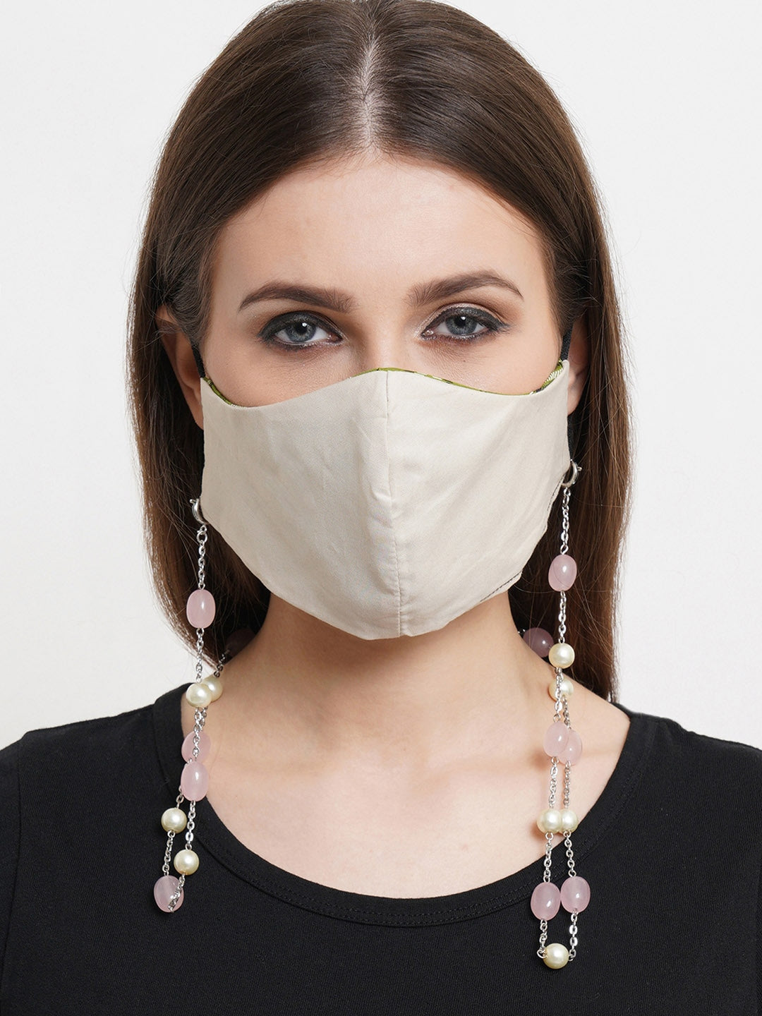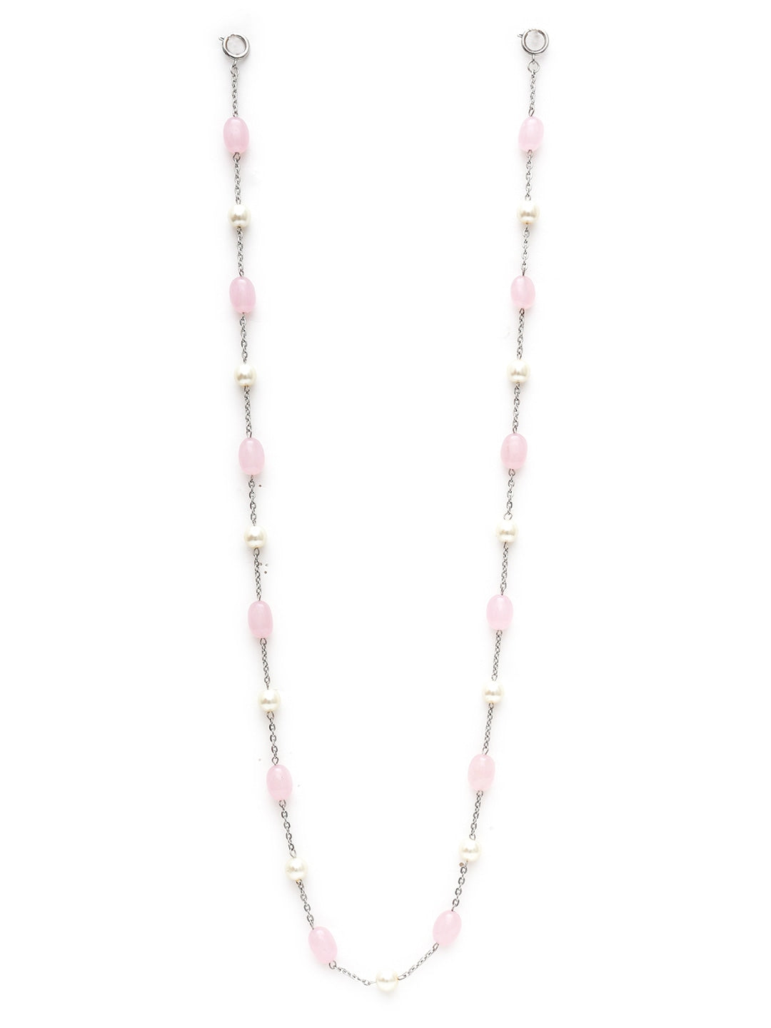 Pink & white silver plated beaded mask chain, has a lobster closure